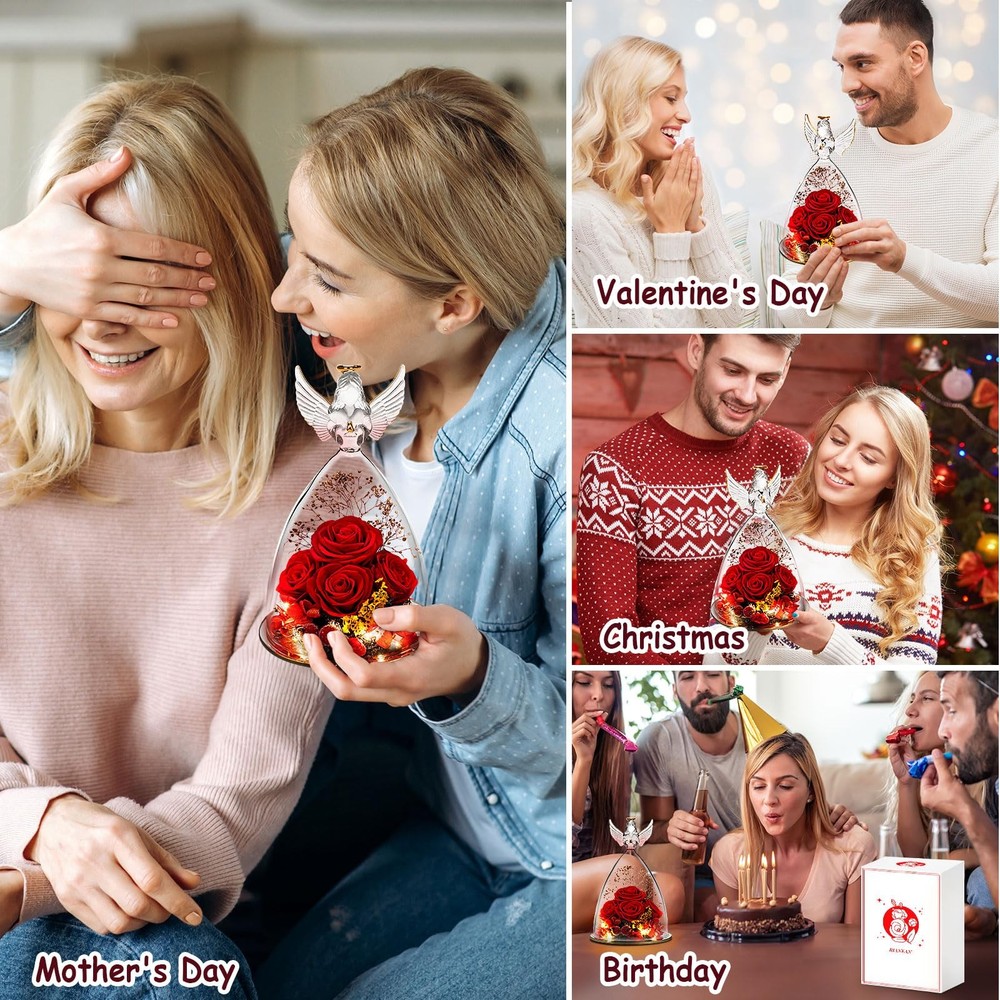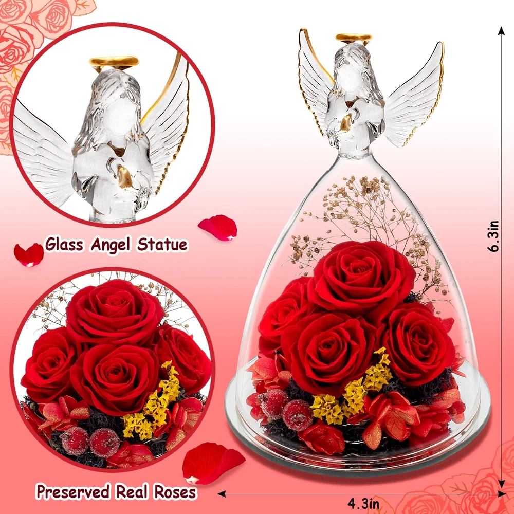 Mother's Day Rose Gifts for Mom Grandma, Preserved Flower Gifts for Mom Grandma, 4 Preserved Roses in Glass Angel Figurines with LED Light, Ideal Mothers Day, Birthday Gifts for Her-Red Perfect Mothers Day Gifts for Mom Grandma: Angel preserved roses are great gifts for women on Mother's Day, Christmas, Valentine's Day, Anniversary, Birthday, and Thanksgiving. It is the best gift idea for your family (mom, wife, grandma, mother in law, grandmother, aunts, daughter), lovers and friends, representing your endless love and blessings. When your loved one gets this surprise angel gift on Mother’s Day, they will feel very happy and unforgettable. Angels & Roses Gifts for Loved Ones: Rose that never fades represents eternal love, and an angel represents guard, holiness, and goodness, which means best good wishes. Angel rose unique gifts for Mother’s Day are a way to express love, signifying your unending love and wishes for her. This romantic gift of roses is filled with infinite hope and beauty like a rainbow. It will bring you and your loved ones infinite love and beauty. Upgraded Preserved Real Flower Gifts for Women: Our Mother’s Day rose gifts for women have 4 preserved real roses in the glass, and the LED lights are installed at the bottom. You just need to turn on the button of the angel preserved roses and the lights will shine through the flower. Our gift package includes a glass angel figurine with LED light, a beautiful gift box, and a great heavy duty card which you can write your best wishes with this rose gift on Mother’s Day for your mom or grandma. Good Angel Figurine Home Decor: Our angel figure forever flower gift with LED light is the perfect decoration for candlelight dinners, weddings, parties, living rooms, bedrooms, coffee shops to add a warm atmosphere. Eternal rose fits perfectly with the handmade angel figurines and statues. It is a beautiful way to make a person feel special and meaningful on Mother’s Day or any other important days. The angel preserved rose is a heartwarming and lovely female gift as beautiful memory forever. High-quality Roses Forever Flowers Gift: Each glass angel figurine is handcrafted and flowers are hand-dyed, size and color may vary slightly from batch to batch. The rose is easy to care and have long lifespan. The embedded pearl cotton ensures that the angels figurines flowers will not be damaged during transportation. Keep real roses in a cool place, without management, it can be for at least 3-5 years. We have 6 different vivid colors for you to choose.