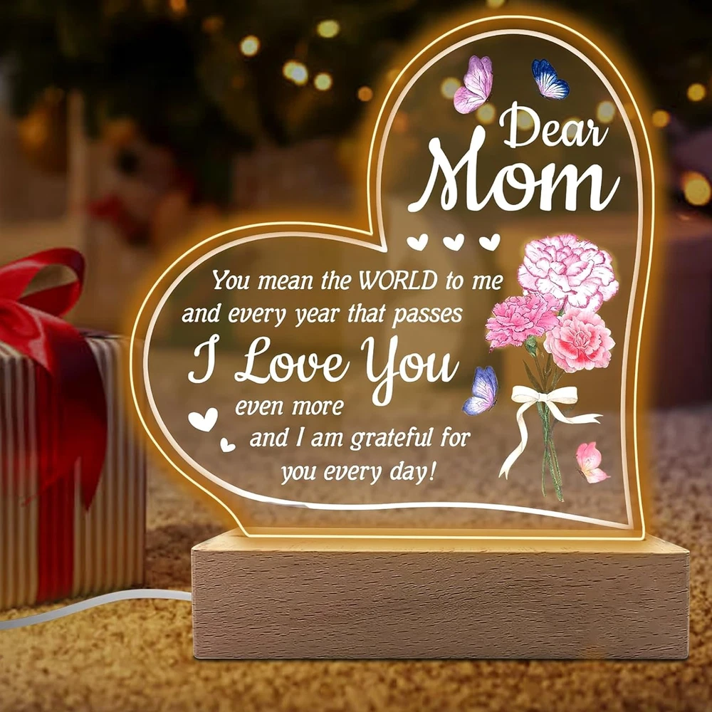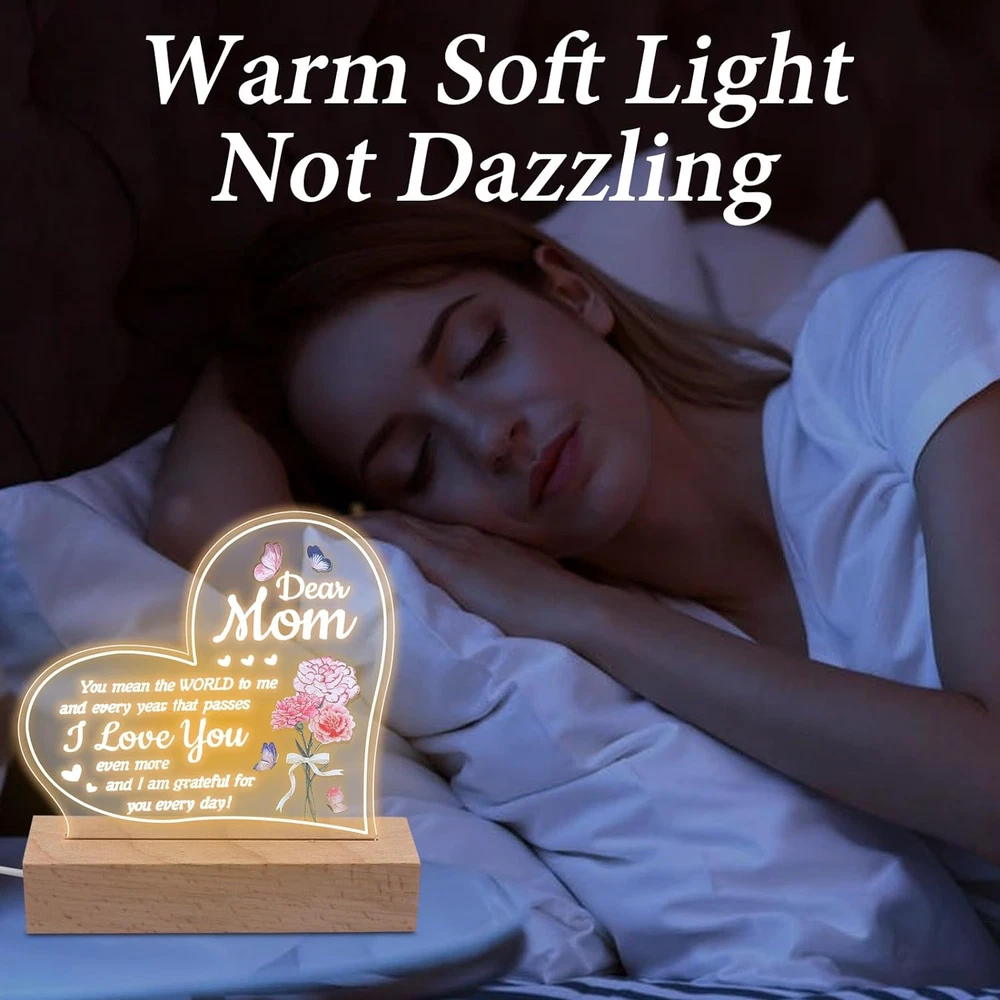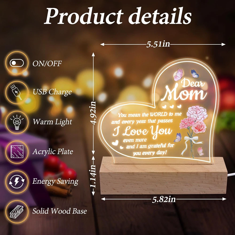 Store New Arrivals Add to Favorite View Feedback Contact Mothers Day Gift from Daughter, Acrylic Night Light for Mothers Birthday Gifts Description Light Source Type CFL Style Art Deco Number of Items 1 Power Source 5V USB Control Method Touch Batteries Included? No Lamp Type Desk Lamp Room Type Living Room Product Dimensions 1"D x 1"W x 1"H Material Acrylic Included Components Dimmer Bulb Base Wedge Recommended Uses For Product Decoration Water Resistance Level Not Water Resistant Item Weight 9.2 ounces Connectivity Technology USB Special Features 3-Way Mounting Type Tabletop Color White Base Material Wood Is Waterproof False returns 30 Days Free Returns shipping Fast and Free Shipping satisfaction 100% Customer Satisfaction handling_time Normally 1 or 2 days only Gifts for Mom: Give this night light as a Mother's Day gift, Mom Birthday to the mom gifts,Let her feel your love for her.Unique mom gifts for Christmas, Mother Day gifts for mom, gifts for mom from daughter, Birthday presents for mom, Best mom gifts. Suitable for Any Occasion: This night light is Birthday Gifts,Chrismas Gift, Mother’s Day Gift Thanksgiving gift and all seasonal gift.You can decorate the bedroom, living room, dinning room. Warm Decorations: This night light is made of acrylic, even if you wake up in the middle of the night or work late at night, the light won't be too bright or harsh, creating an ideal sleeping and office environment for you or your loved ones. Security material: This night light is solid acrylic plate and high quality solid wood base.The lamp base is made of top-quality wood materials, environmentally friendly, pollution-free, odorless, and has no sharp edges .lightweight. The night light uses a standard USB port . Method of Use: There is a protective film on the night light You need to tear it off before use. ABOUT US We offer the best prices around on high quality products. Our E-store includes media such as books, movies, music and games while offering electronics, toys, sporting apparel, clothing, tools, general home, garden items and more. SHIPPING We offer free shipping to the lower 48 states and ship within 2 business days of payment, usually sooner. We do not accept P.O. Boxes. Please provide a physical address. We are always working hard to ensure your package arrives as soon as possible. Please understand that some factors like weather, high postal traffic, and the performance of shipping companies are outside of our control. RETURNS We offer a 30-Day Return Policy on items which you are not completely satisfied with. You have the option for a full-refund or an exchange of the item. No returns are available on items shipped outside of the USA. Free return. PAYMENT We accept PayPal. CONTACT US This page content is yet to come Please ad us to your favorite seller and visit again later Thank You CUSTOMER SATISFACTION We try our very best to make sure every customer is completely satisfied. If there's a problem, message us! We're happy to help. WE ACCEPT Paypal Credit or Debit Card Google Pay Apple Pay