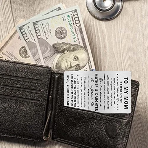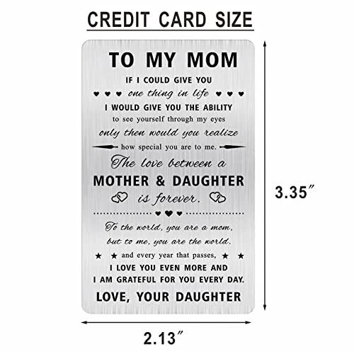 Return Policy Fast Delivery Trusted seller Mother's Day Gifts for Mom from Daughter - Mother from Daughter Gift - Engraved Wallet Card to My Mom - Birthday Card for Mum Mama from Daughter Product Description Mom Gifts from Daughter - Thoughtful and sentimental gifts to mom from daughter, show your affection and love to your mother and show her that she is so special for you, Perfect Birthday, christmas, anniversary, mother’s day gifts for women who has everything High Quality Material - This unique wallet card inserts is made of high quality stainless steel, Permanent Laser Engraved, very sturdy, will not fade Mothers Day Gifts for Mom - To my mom, If I could give you one thing in life, I would give you the ability to see yourself through my eyes, only then would you realize how special you are to me. The love between a mother & daughter is forever. To the world, you are a mom, but to me, you are the world. And every year that passes, I love you even more and I am grateful for you every day. love, your daughter Fits Perfectly In Wallet - Each metal wallet card is approximately 3.35 * 2.13 inches, credit card size, easy to put in wallet Best Mom Gift Ideas - Carefully packaged, protected with a lovely envelope, ready for gift giving Shipping Returns Payment Shipping Shipping is FREE to all addresses other than APO/PO boxes in the lower 48 states. All our stock ships from US-based warehouses. Shipped via USPS or UPS (depending on location and package weight) Unless stated otherwise, all orders will ship within 24-72 hours of your payment being processed. Check our feedback to see the great reviews of FAST shipping we offer. Returns Seller does not accept returns Payment We currently accept payment via eBay managed payments only. Once payment is cleared, we will dispatch your shipment within 1-3 business days. Please refer to the "Shipping" tab for more information regarding shipping speed to your destination.