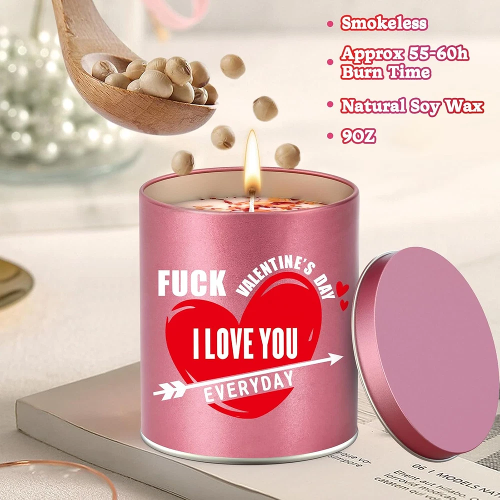 VALENTINES DAY GIFTS: This scented candle gifts with funny humorous quote,unique best gifts idea for her on Valentines Day wedding or birthday. VALENTINES GIFTS/DECOR FOR ANY OCCASIONS: Specially made scented candle gifts with rich fragrance for her,wife,she,Christmas,Valentines Day,wedding or birthday,gag gifts,anniversary gifts/decorations from him,is the great addition to the home. NATURAL WAX: Scented candle is made of quality wax,using 95% natural pure quality wax and 5% essential oil,which can provide natural health and fresh aroma for a long time. SIZE AND BURN TIME: 9 ounces and can burn for about 55-60 hours.The candle wick is lead-free and will not produce black smoke when ignited,clean the jar with hot soapy water can be recyclable. PERSONALIZED DESIGN: I LOVE YOU EVERYDAY.Funny text is printed on one side of the tin can,combined with the unique surface pattern design,unique gifts ideas for her who has everything. Product Description Valentines Day Gifts for Her Women Wife Girlfriend Specially made scented candle with rich fragrance and lovely packaging is the perfect choice for her girlfriend wife women as a Valentines Day birthday. 9 ounces and can burn for about 55-60 hours. Valentines Day decorations/decor. Great gift idea Funny text is printed on one side of the tin can,combined with the unique surface pattern design,it is perfect to express your romantic love with this canned candle as a gift. Easy to clean, just wash the jar with hot soapy water after the candle burns. The empty jar can be used for many purposes. It can be planted with small green plants or used as a container for small tools, which is very practical. Handcrafted Soy wax candles are longer lasting,made of 100% natural soy wax with essential oil and cotton lead-free wick.