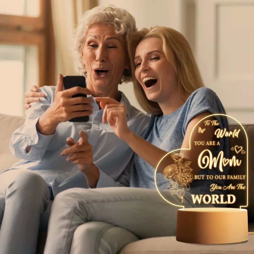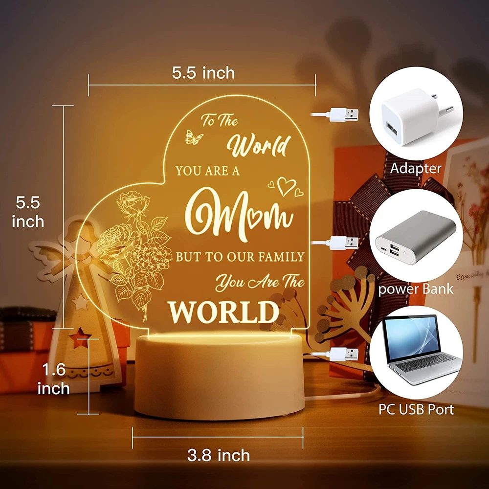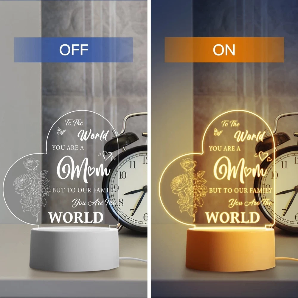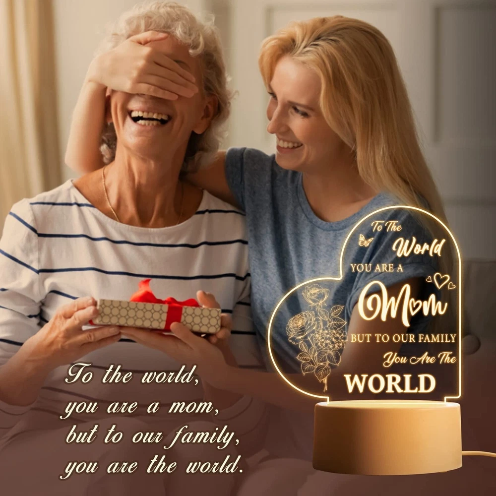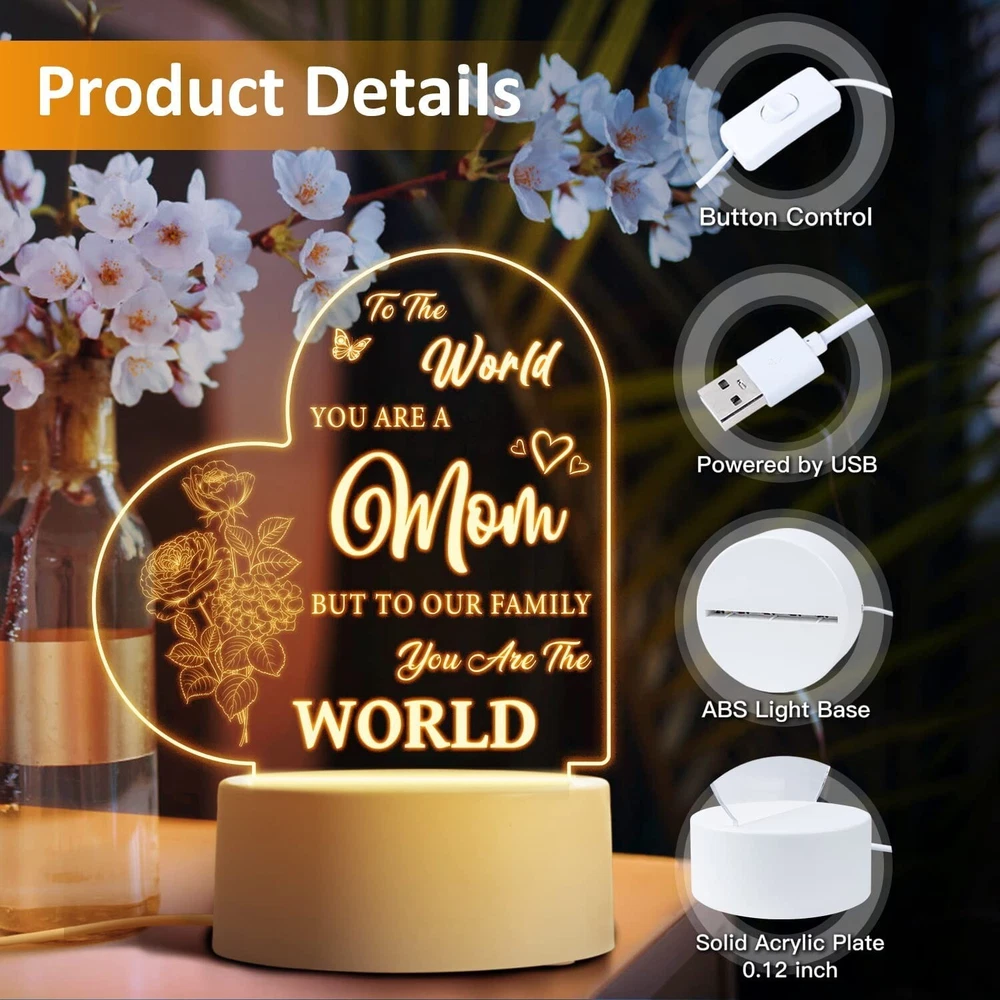 Vetbuosa Gifts for Mom from Daughter Son, Mom Birthday Gifts Night Light, Mom Gifts for Mother's Day, Birthday, Thanksgiving, Christmas Acrylic Night Light Gifts for Mom, Stepmom Brand Vetbuosa Color For Mom Product Dimensions 3.8"D x 3.8"W x 5.5"H Special Feature Rechargeable Light Source Type LED About this item Mothers Gifts for Mom - Are you looking for a great birthday present for mom? Our acrylic night lamp is exactly what you’re looking for. Engraved with a sentimental saying “To the world you are a mom, but to our family you are the world”, it’s a special way to express your sincere love to your mom. Mothers Day Gifts from Daughter/Son - Perfect gifts for mom from daughter and son and gifts for women who mean the most to you. Mother’s Day gifts for mom, mother in law, stepmom, grandma or wife. Surprising your mom on Valentine’s Day, Thanksgiving, Christmas or any day that deserves to celebrate. It will bring back amazing memories when she sees this night lamp. Say Thank You to Mother - Mom is the person we should be most thankful for. Ever since your first cry echoed, she loves you and cares for you wholeheartedly. It’s a message of love to your mom, showing how proud of you to have her as your mom and reminding how awesome she is. Imagine the happy smile on her face from deep inside, she will feel your love every time she uses this night light. Creative Home Decor - This night light can create a warm atmosphere, exquisite and small, unique in style. It is a great way to decorate your home, addition to bedroom, living room, dining room or any table in your house. Features with 5.5x5.5 inches engraved acrylic plate and 1.5 m USB cable, not battery-powered. Satisfaction Guarantee - We are dedicated to providing you with quality products and satisfying after-sales service. If you run into any issues related to your shopping satisfaction, please feel free to contact us. Your satisfaction is our No.1 priority. Product information Technical Details Brand Vetbuosa Color For Mom Product Dimensions 3.8"D x 3.8"W x 5.5"H Special Feature Rechargeable Light Source Type LED Material Acrylic Lamp Type Night Light Room Type Bedroom, Living Room, Dining Room Shade Material Acrylic Power Source Battery Powered Controller Type Remote Control Theme Personalized,Mothers Day Connectivity Technology USB Included Components Battery Powered Switch Installation Type Tabletop Manufacturer Vetbuosa Item Weight 8.1 ounces Product Dimensions 3.8 x 3.8 x 5.5 inches Country of Origin China Assembled Height 5.5 inches Assembled Length 3.8 inches Assembled Width 3.8 inches Special Features Rechargeable Batteries Included? No Batteries Required? No