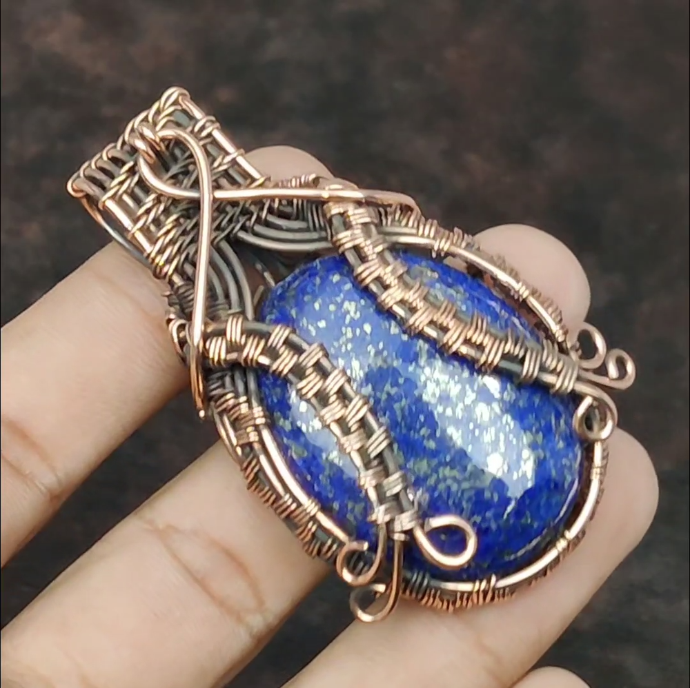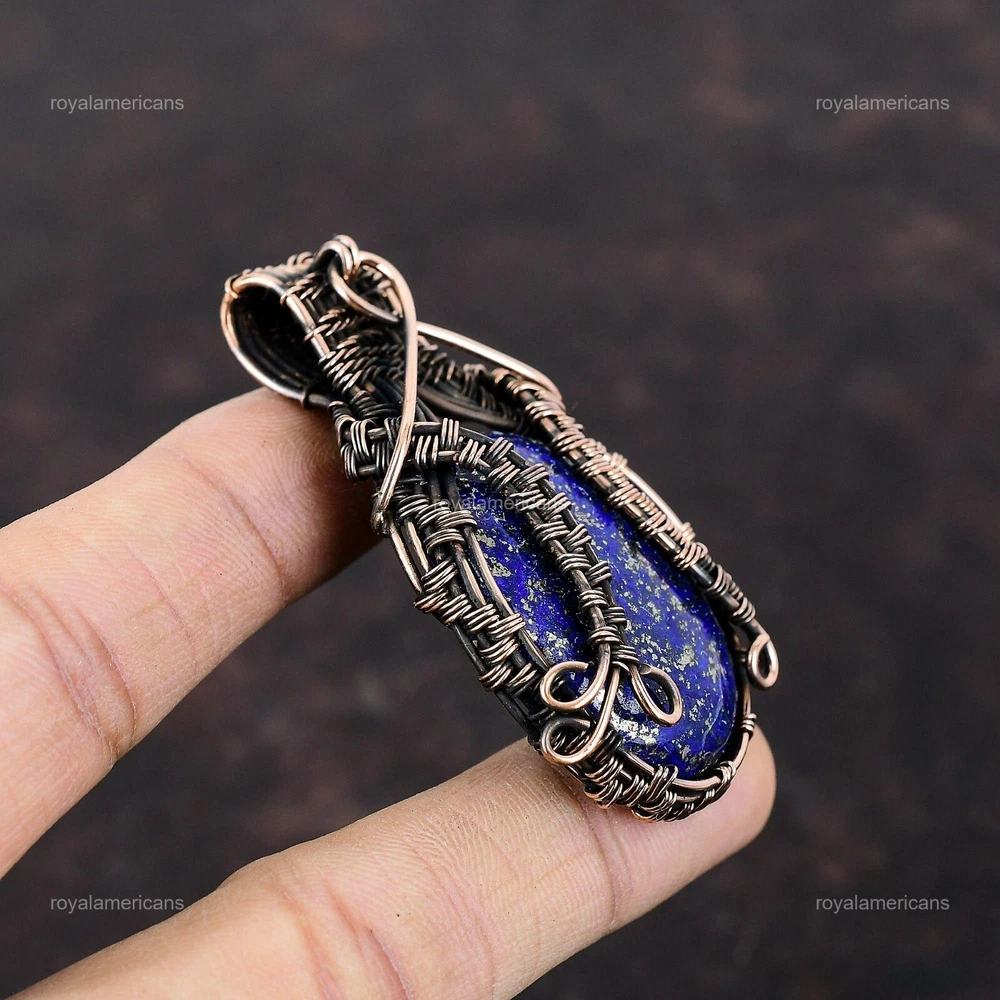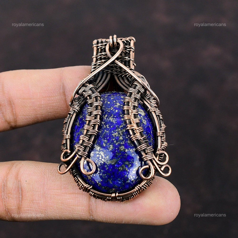 Note : Due to the natural formation of this gemstone. Slight variation in design and color are to be expected. Welcome to Royalamericans Mothers day Sale Oval Lapis Lazuli Gemstone Copper Wire Wrapped Pendant Jewelry Handmade Pendant, Wire Wrapped Pendant, Wire Wrapped Jewelry, Copper Pendant, Copper Wire Pendant, Wrapped Jewelry, Wire Wrap Pendant, Wire Wrap Jewelry SKU : UFWP-1507 Gemstone : Lapis Lazuli Stone Shape : Oval Metal Purity : Unknown Copper Length : 65 Millimeters Width : 40 Millimeters Copper has been used for jewelry making for thousands of years, dating back to ancient civilizations such as the Egyptians, Romans, and Aztecs. Copper was valued for its beauty, versatility, and durability, and was often used to make everything from jewelry and coins to cookware and tools. In addition to its historical significance, copper jewelry also offers several benefits. Copper is a natural conductor of heat and electricity, which makes it ideal for energy healing and therapeutic purposes. Wearing copper jewelry is believed to have various health benefits, such as improving circulation, reducing inflammation, and boosting the immune system. Some people also believe that copper jewelry has the ability to balance energy and improve mood. For Mother's Day Gift For Father's Day Gift For Promise For Valentine's Day For Halloween Party For Christmas Day Gift For New Year Party For Mom For Her If you can't find the information you need or need some advice for your design? Feel free to contact us. We are fast to reply :) All our work is made by hand with Love and Care in our workshop Thank you so much for visiting and hope you enjoy shopping with us Royalamericans is committed to delivering the best quality sterling silver jewelry to customers. As a handmade jewelry manufacturer, we offer an extensive selection of copper gemstone jewelry that showcases the brilliance of our craftsmanship. We are an experienced handmade jewelry supplier with expertise in embellishing gemstones to suit every style. We offer you the liberty to create your jewelry ensemble with sparkling, earthy, and pure gemstones. Our Talented artisans masterfully handcraft each piece of jewelry you see here. Our pieces are made with genuine gemstones.