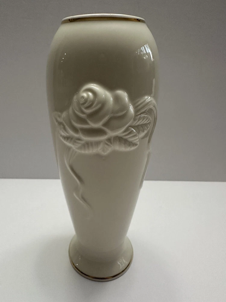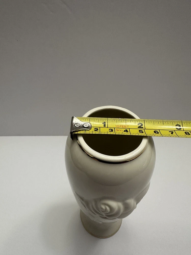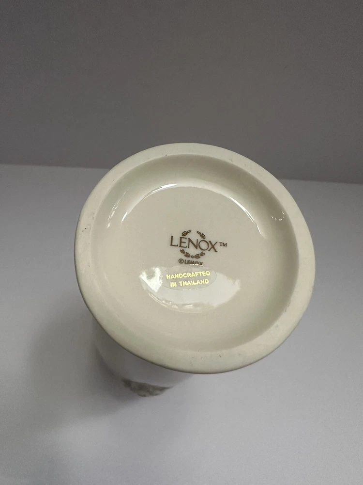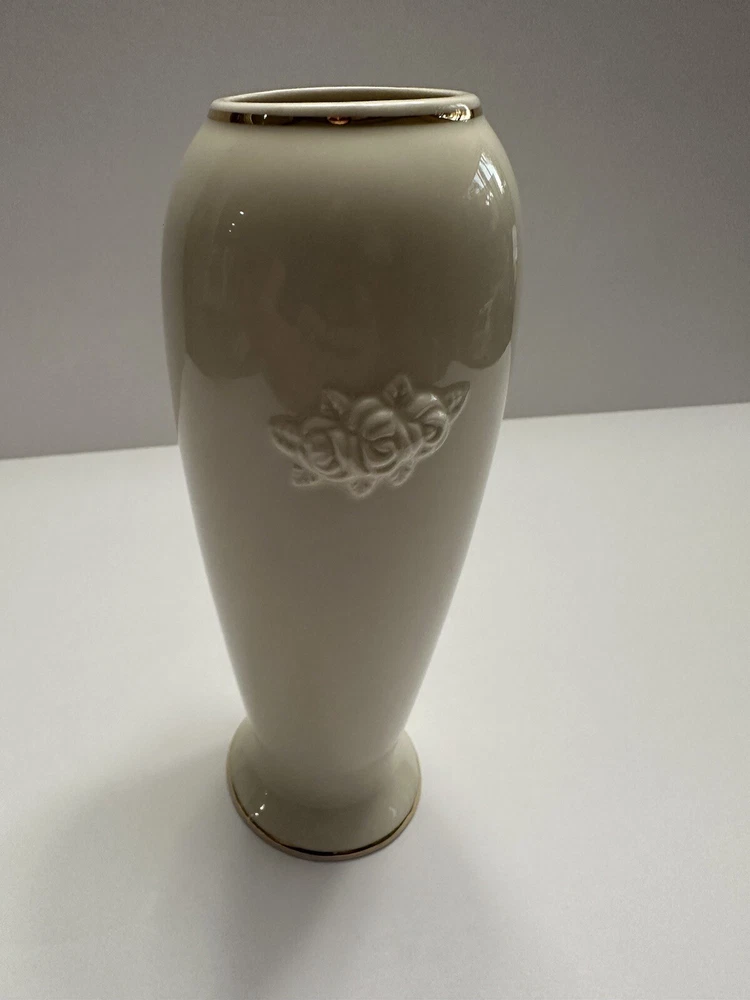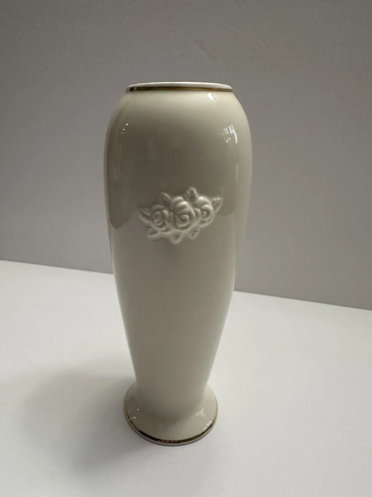 This gorgeous Lenox vase is a must-have for any collector or lover of beautiful decor. Featuring an asymmetrical shape and an embossed cream rose pattern, this medium-sized vase is perfect for all occasions and styles. Crafted from high-quality porcelain and finished with glossy shine, this original piece is hand-crafted and bears the famous Lenox brand name. With 24k gold trim and a stunning flower subject, this bud vase is sure to impress. Measuring 7.25", it's the perfect size for displaying your favorite flowers or adding a touch of elegance to any room. Made in Thailand, this vase is a true work of art that will add beauty and charm to your collection. Good condition. Please review all photos for details.