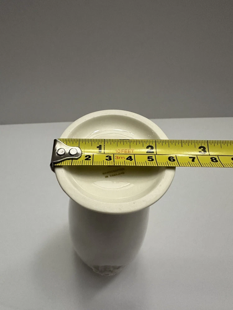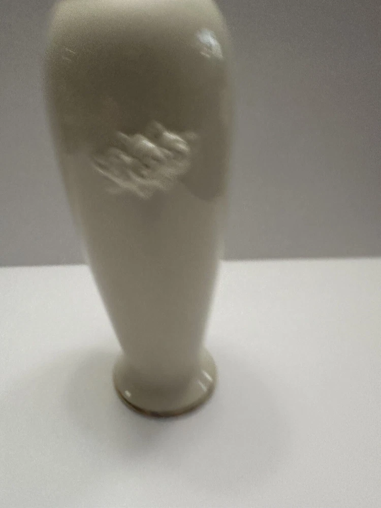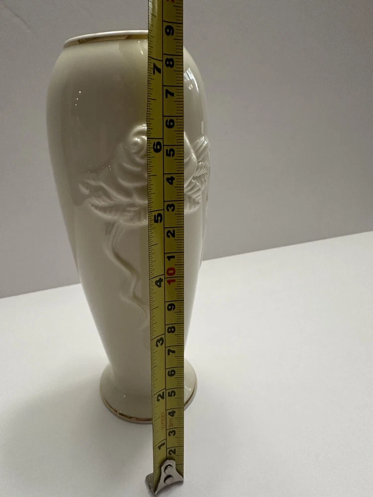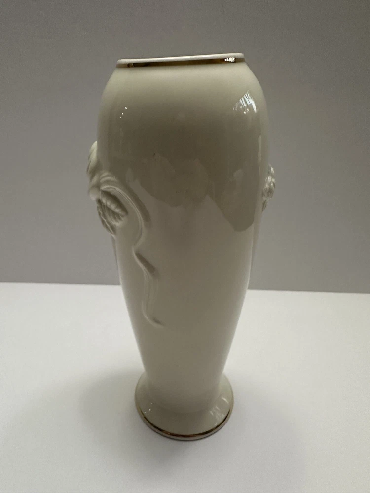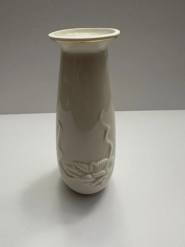 This gorgeous Lenox vase is a must-have for any collector or lover of beautiful decor. Featuring an asymmetrical shape and an embossed cream rose pattern, this medium-sized vase is perfect for all occasions and styles. Crafted from high-quality porcelain and finished with glossy shine, this original piece is hand-crafted and bears the famous Lenox brand name. With 24k gold trim and a stunning flower subject, this bud vase is sure to impress. Measuring 7.25", it's the perfect size for displaying your favorite flowers or adding a touch of elegance to any room. Made in Thailand, this vase is a true work of art that will add beauty and charm to your collection. Good condition. Please review all photos for details.