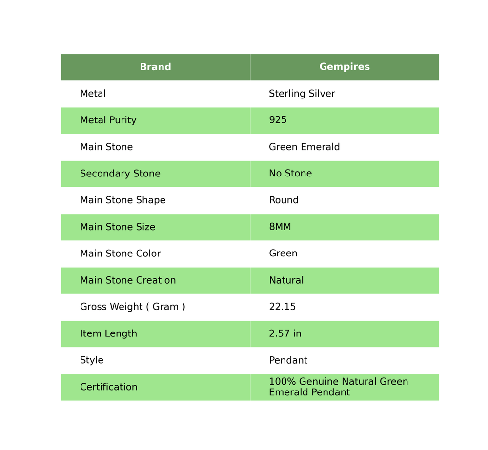 Welcome To Our Shop Gempires ------------------------------------------- Beautiful Elegent Pendant studded with Green Emerald in 925 Sterling Silver to add a distinct style in your overall look. Designed to add class and elegance in your casual attire, this piece is bound to get you all the lovely compliments. Mothers day Deal May Birth Green Emerald Gemstone 925 Silver New Pendant Jewelry Check My Other Pendant Listings : Click Here SKU:- PP-42-1 Metal:- Sterling Silver Metal Purity:- 925 Gemstone:- Green Emerald Gemstone Color:- Green Gemstone Shape :- Round Gemstone Creation :- Natural Stone Setting :- Bezel Pendant Length:- 2.57 Inches Pendant Width:- Inches ___________________________________________________________________ Shipping Handling - Free Standard Shipping all over the world Handling Time - 2 to 5 BUSINESS Days Delivery Time - 7 to 20 Days ( Various on destination ) _________________________________________________________________ Returns - 1.We provide a 100% Money Back Guarantee, excluding shipping costs, within 30 days from the date of item receipt. 2.The item must not be altered or damaged in any way shape or form. 3.Upon receipt of the aforementioned items, your payment will be promptly refunded. 4.Please be so kind as to contact us via email in order to acquire comprehensive return instructions before proceeding with the return of the merchandise. 5.Kindly be advised to allocate a maximum period of 1 business day for the processing of all returns, in order for the appropriate credit to be applied. 6.Sizing does not affect the return policy. _________________________________________________________________ FAQ's - Q.1 ARE THE ITEMS YOU ARE SELLING BRAND NEW? We exclusively offer brand-new products, refraining from the sale of pre-owned jewelry. Our entire jewelry collection is composed of 100% natural, conflict-free pieces. We do not engage in the trade of imitation or lab-grown gemstones and diamonds. Q.2 WHAT ARE YOUR BUSINESS HOURS? we operate 24x7 as we have a dedicated team who works in different shifts to deliver the services to our valuable customers. ________________________________________________________________ Gempires is committed to delivering customers an unparalleled experience through the provision of exquisite handmade jewelry, meticulously crafted to uphold the most exacting standards of quality. Our operations encompass dual roles as both discerning connoisseurs and skilled artisans within the realm of jewelry making. We proudly hold an extensive proficiency in the fine art of enhancing gemstones, allowing us to harmonize them seamlessly with diverse aesthetic inclinations. We are delighted to extend to you the privilege of curating your very own jewelry collection. This collection will be graced by the presence of genuine and splendid natural gemstones, each possessing an innate authenticity and beauty that is truly unparalleled. **** STAY BLESSED ALWAYS*****