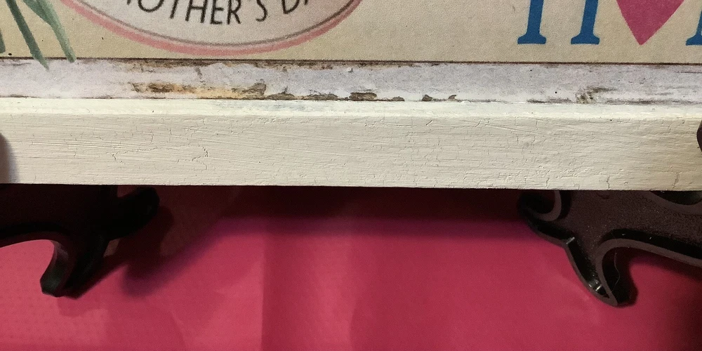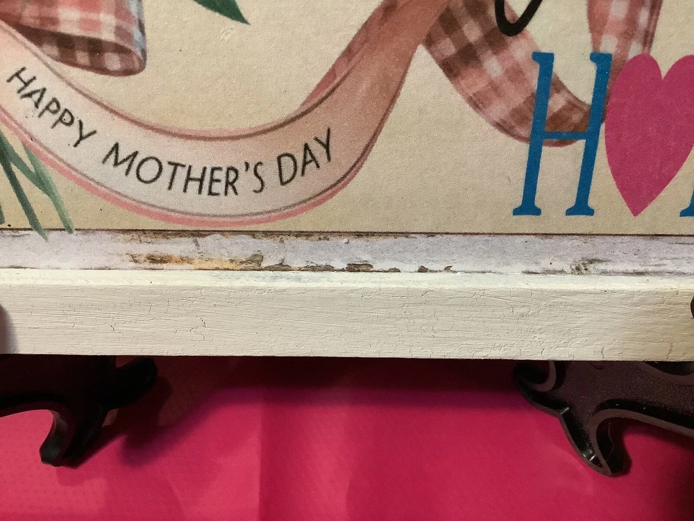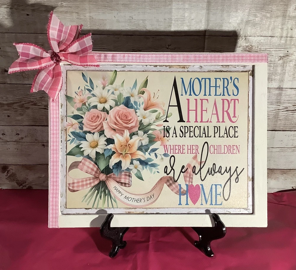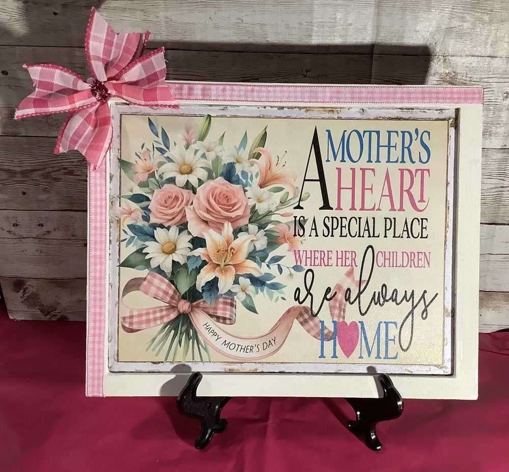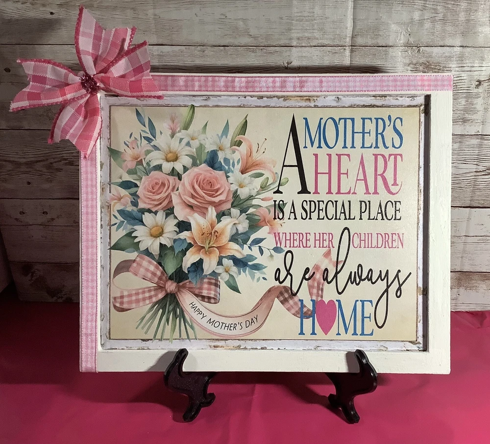 This beautiful Mother's Day art sign plaque is the perfect gift for any mom out there. It features a removable ribbon and bow, and comes with an easel for easy display. The design is elegant and timeless, making it a great addition to any home decor. Crafted with care, this plaque is made to last and will be a cherished item for years to come. Whether you're looking for a gift for your own mother, or for a special mother figure in your life, this art sign plaque is sure to bring a smile to their face. Shop now and give the gift of love and appreciation this Mother's Day. The sign is designed by me using digital graphics, it is then printed and mounted to a prepared wood surface, frame is also made of wood it is painted white with a added layer of folk art crackle to give it a stylish rustic antique look. Measures 9 1/2 inches by 7 1/2 inches.