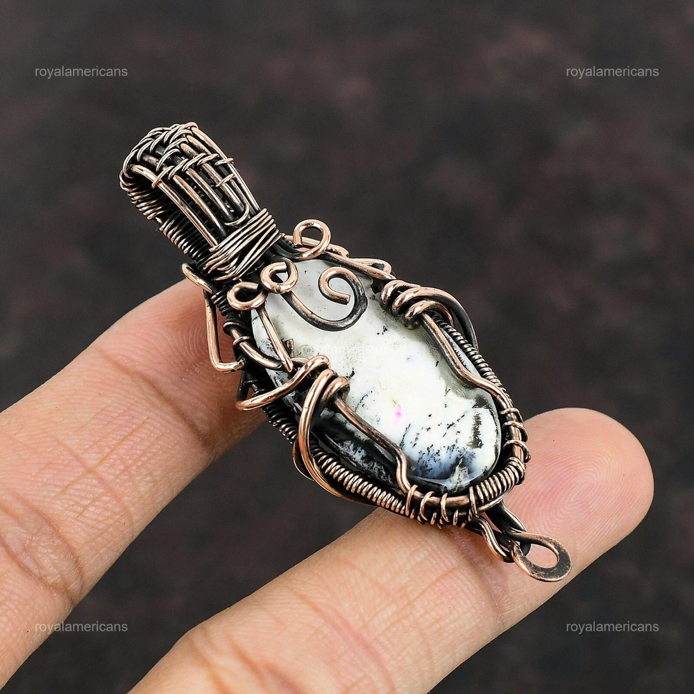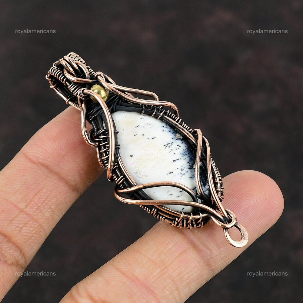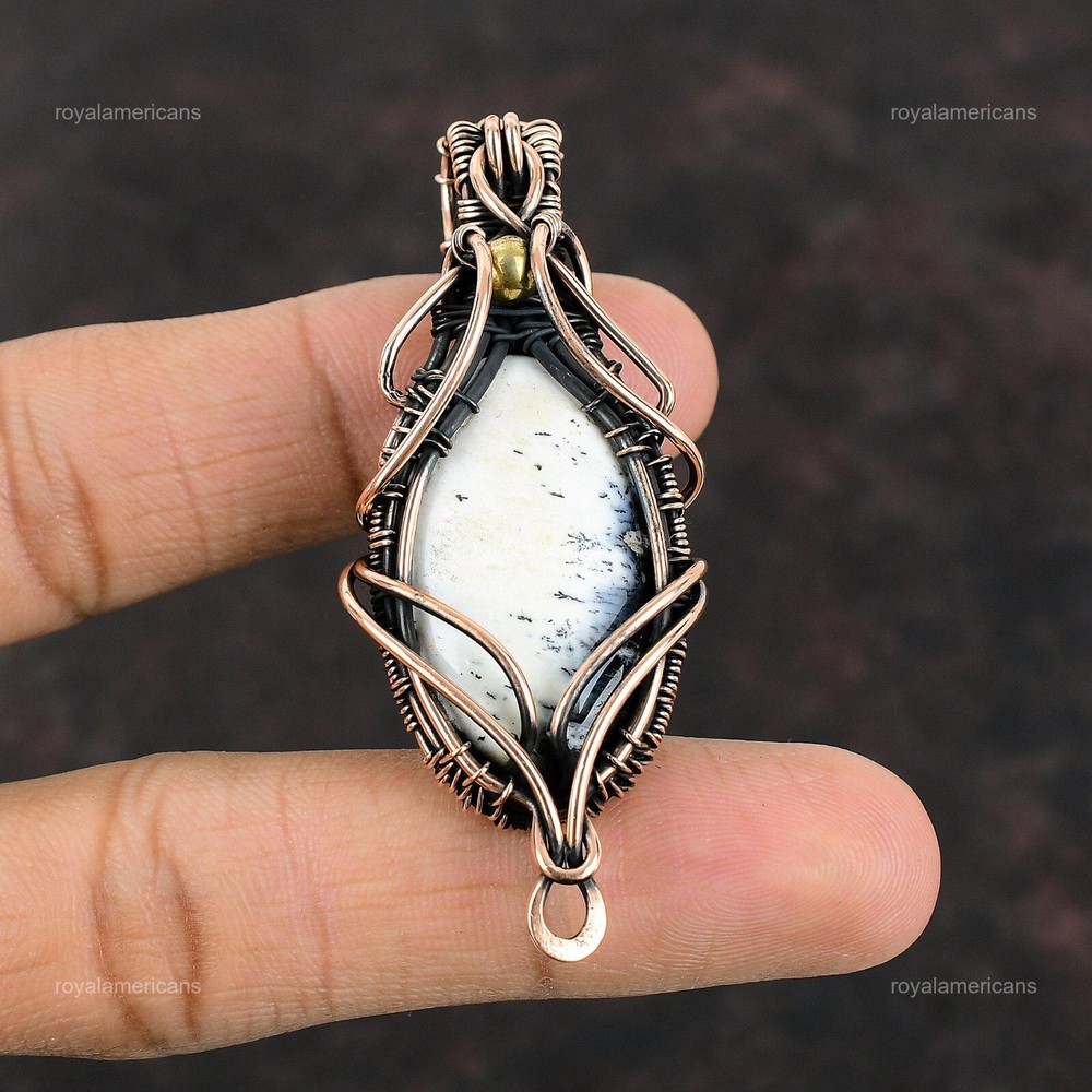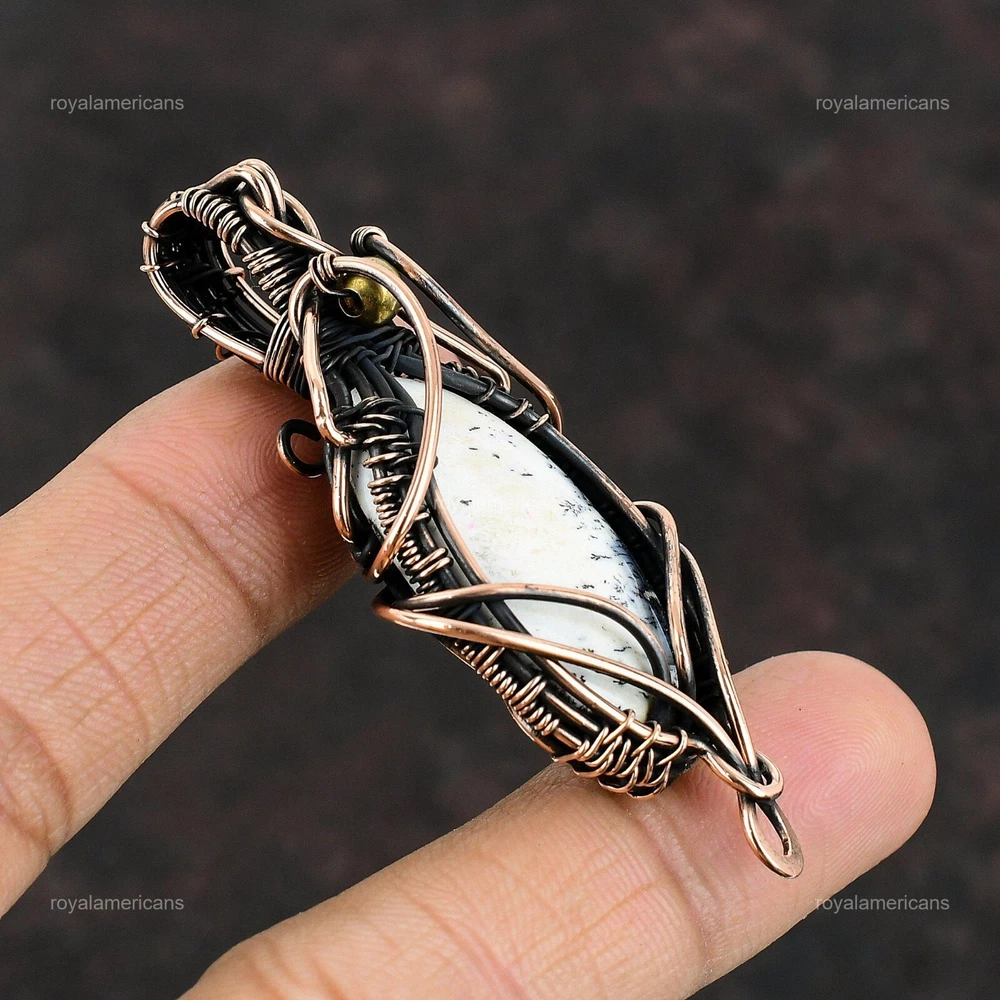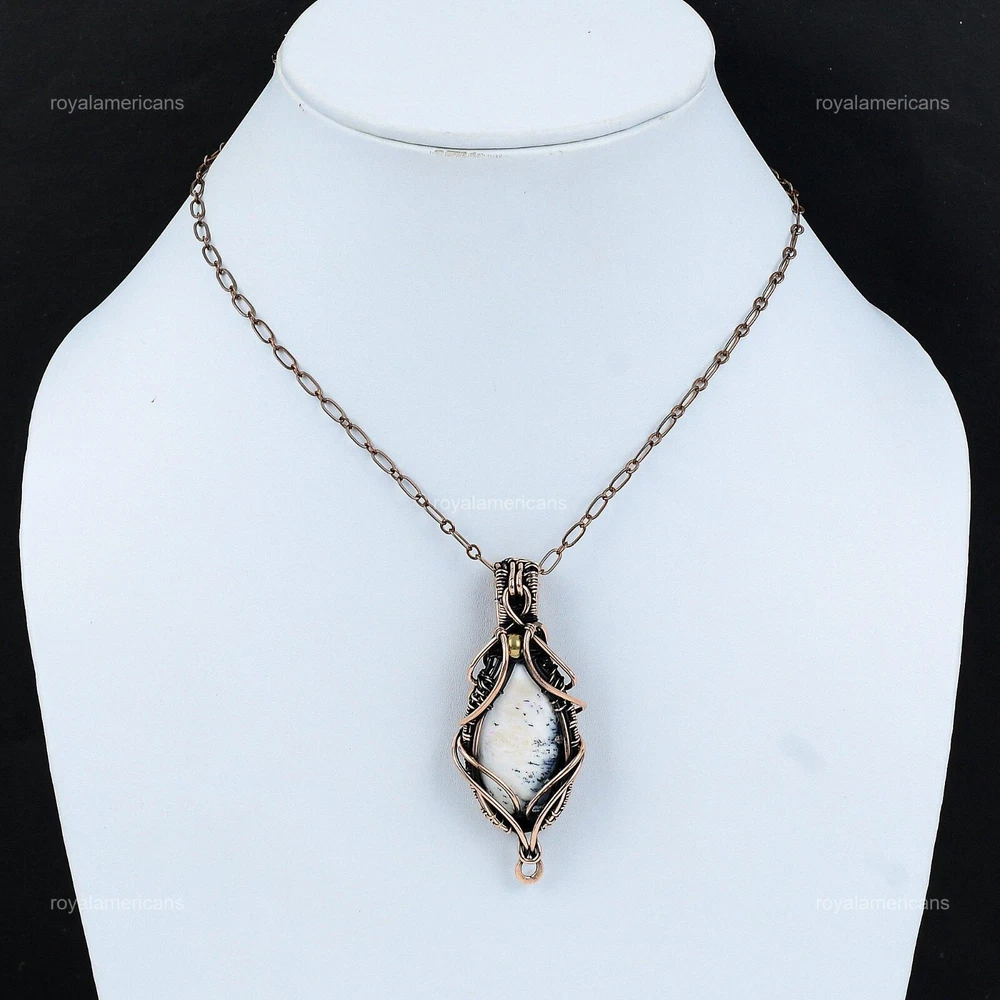 Note : Due to the natural formation of this gemstone. Slight variation in design and color are to be expected. Welcome to Royalamericans Mothers day Sale Oval Dendrite Opal Gemstone Handmade Sister Boho Pendant Copper Handmade Pendant, Wire Wrapped Pendant, Wire Wrapped Jewelry, Copper Pendant, Copper Wire Pendant, Wrapped Jewelry, Wire Wrap Pendant, Wire Wrap Jewelry SKU : UFWP-712 Gemstone : Dendrite Opal Stone Shape : Oval Metal Purity : Unknown Copper Length : 70 Millimeters Width : 28 Millimeters Copper has been used for jewelry making for thousands of years, dating back to ancient civilizations such as the Egyptians, Romans, and Aztecs. Copper was valued for its beauty, versatility, and durability, and was often used to make everything from jewelry and coins to cookware and tools. In addition to its historical significance, copper jewelry also offers several benefits. Copper is a natural conductor of heat and electricity, which makes it ideal for energy healing and therapeutic purposes. Wearing copper jewelry is believed to have various health benefits, such as improving circulation, reducing inflammation, and boosting the immune system. Some people also believe that copper jewelry has the ability to balance energy and improve mood. For Mother's Day Gift For Father's Day Gift For Promise For Valentine's Day For Halloween Party For Christmas Day Gift For New Year Party For Mom For Her If you can't find the information you need or need some advice for your design? Feel free to contact us. We are fast to reply :) All our work is made by hand with Love and Care in our workshop Thank you so much for visiting and hope you enjoy shopping with us Royalamericans is committed to delivering the best quality sterling silver jewelry to customers. As a handmade jewelry manufacturer, we offer an extensive selection of copper gemstone jewelry that showcases the brilliance of our craftsmanship. We are an experienced handmade jewelry supplier with expertise in embellishing gemstones to suit every style. We offer you the liberty to create your jewelry ensemble with sparkling, earthy, and pure gemstones. Our Talented artisans masterfully handcraft each piece of jewelry you see here. Our pieces are made with genuine gemstones.