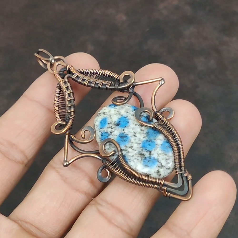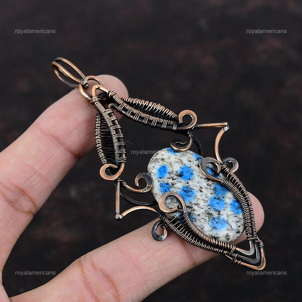 Note : Due to the natural formation of this gemstone. Slight variation in design and color are to be expected. Welcome to Royalamericans Mothers day Sale Oval K2 Jasper Gemstone Copper Wire Wrapped Engagement Pendant Handmade Pendant, Wire Wrapped Pendant, Wire Wrapped Jewelry, Copper Pendant, Copper Wire Pendant, Wrapped Jewelry, Wire Wrap Pendant, Wire Wrap Jewelry SKU : UFWP-3075 Gemstone : K2 Jasper Stone Shape : Oval Metal Purity : Unknown Copper Length : 95 Millimeters Width : 50 Millimeters Copper has been used for jewelry making for thousands of years, dating back to ancient civilizations such as the Egyptians, Romans, and Aztecs. Copper was valued for its beauty, versatility, and durability, and was often used to make everything from jewelry and coins to cookware and tools. In addition to its historical significance, copper jewelry also offers several benefits. Copper is a natural conductor of heat and electricity, which makes it ideal for energy healing and therapeutic purposes. Wearing copper jewelry is believed to have various health benefits, such as improving circulation, reducing inflammation, and boosting the immune system. Some people also believe that copper jewelry has the ability to balance energy and improve mood. For Mother's Day Gift For Father's Day Gift For Promise For Valentine's Day For Halloween Party For Christmas Day Gift For New Year Party For Mom For Her If you can't find the information you need or need some advice for your design? Feel free to contact us. We are fast to reply :) All our work is made by hand with Love and Care in our workshop Thank you so much for visiting and hope you enjoy shopping with us Royalamericans is committed to delivering the best quality sterling silver jewelry to customers. As a handmade jewelry manufacturer, we offer an extensive selection of copper gemstone jewelry that showcases the brilliance of our craftsmanship. We are an experienced handmade jewelry supplier with expertise in embellishing gemstones to suit every style. We offer you the liberty to create your jewelry ensemble with sparkling, earthy, and pure gemstones. Our Talented artisans masterfully handcraft each piece of jewelry you see here. Our pieces are made with genuine gemstones.