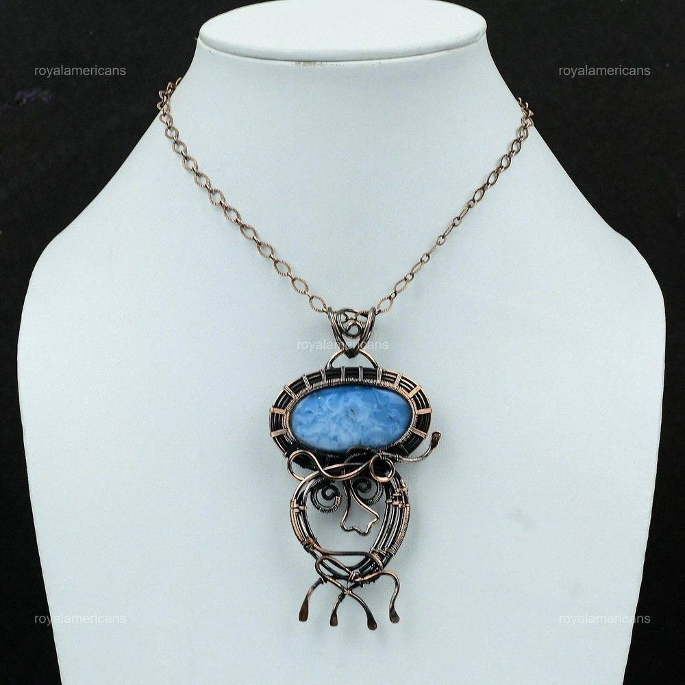 Note : Due to the natural formation of this gemstone. Slight variation in design and color are to be expected. Welcome to Royalamericans Mothers day Sale Oval Owyhee Blue Opal Stone Copper Wire Wrapped Sister Pendant Handmade Pendant, Wire Wrapped Pendant, Wire Wrapped Jewelry, Copper Pendant, Copper Wire Pendant, Wrapped Jewelry, Wire Wrap Pendant, Wire Wrap Jewelry SKU : UFWP-1957 Gemstone : Owyhee Blue Opal Stone Shape : Oval Metal Purity : Unknown Copper Length : 95 Millimeters Width : 50 Millimeters Copper has been used for jewelry making for thousands of years, dating back to ancient civilizations such as the Egyptians, Romans, and Aztecs. Copper was valued for its beauty, versatility, and durability, and was often used to make everything from jewelry and coins to cookware and tools. In addition to its historical significance, copper jewelry also offers several benefits. Copper is a natural conductor of heat and electricity, which makes it ideal for energy healing and therapeutic purposes. Wearing copper jewelry is believed to have various health benefits, such as improving circulation, reducing inflammation, and boosting the immune system. Some people also believe that copper jewelry has the ability to balance energy and improve mood. For Mother's Day Gift For Father's Day Gift For Promise For Valentine's Day For Halloween Party For Christmas Day Gift For New Year Party For Mom For Her If you can't find the information you need or need some advice for your design? Feel free to contact us. We are fast to reply :) All our work is made by hand with Love and Care in our workshop Thank you so much for visiting and hope you enjoy shopping with us Royalamericans is committed to delivering the best quality sterling silver jewelry to customers. As a handmade jewelry manufacturer, we offer an extensive selection of copper gemstone jewelry that showcases the brilliance of our craftsmanship. We are an experienced handmade jewelry supplier with expertise in embellishing gemstones to suit every style. We offer you the liberty to create your jewelry ensemble with sparkling, earthy, and pure gemstones. Our Talented artisans masterfully handcraft each piece of jewelry you see here. Our pieces are made with genuine gemstones.