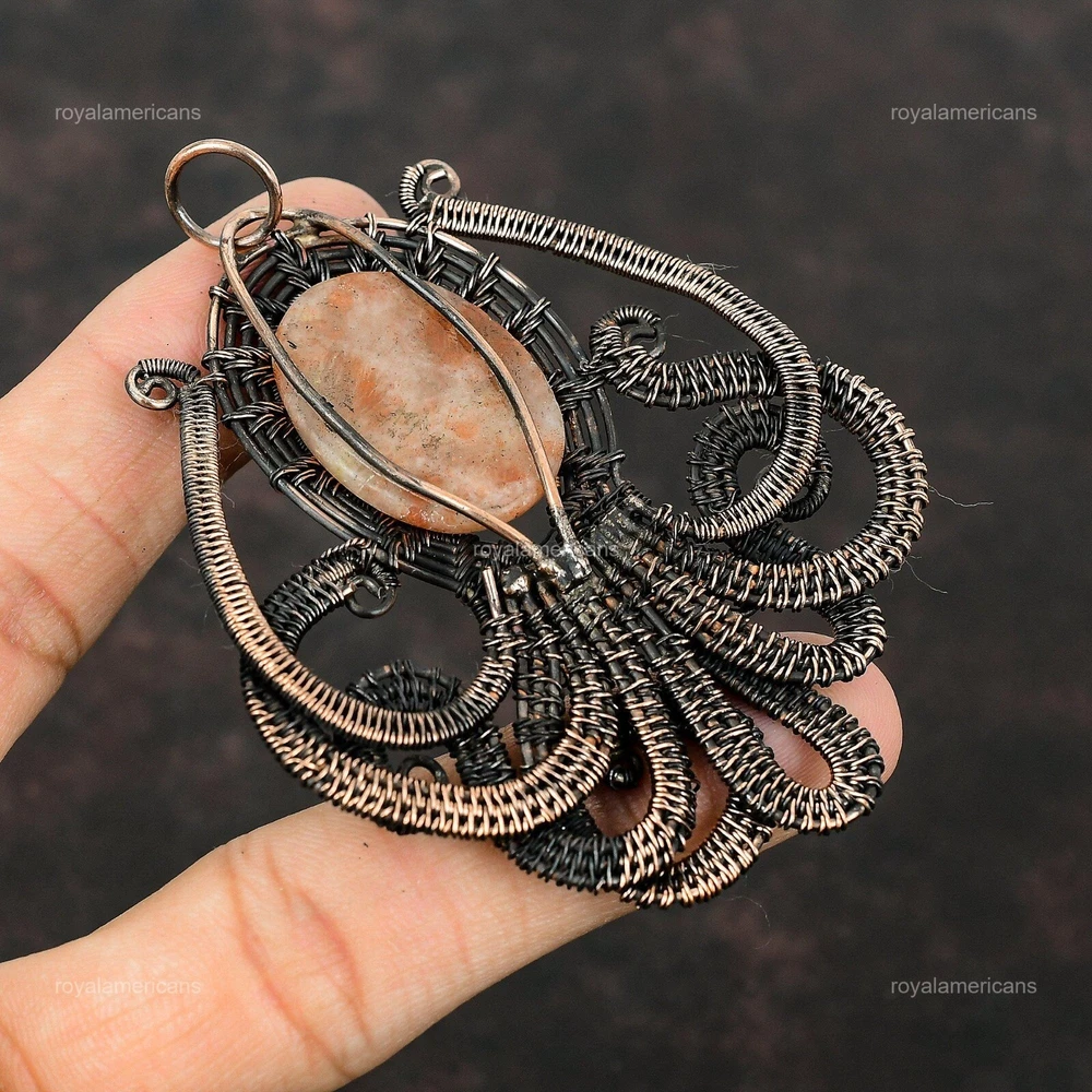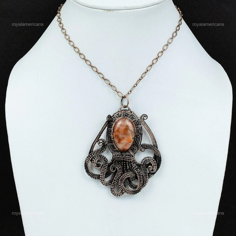 Note : Due to the natural formation of this gemstone. Slight variation in design and color are to be expected. Welcome to Royalamericans Mothers day Sale Oval Sunstone Stone Copper Wife Wire Wrap Boho Octopus Pendant Handmade Pendant, Wire Wrapped Pendant, Wire Wrapped Jewelry, Copper Pendant, Copper Wire Pendant, Wrapped Jewelry, Wire Wrap Pendant, Wire Wrap Jewelry SKU : UFWP-2005 Gemstone : Sunstone Stone Shape : Oval Metal Purity : Unknown Copper Length : 85 Millimeters Width : 67 Millimeters Copper has been used for jewelry making for thousands of years, dating back to ancient civilizations such as the Egyptians, Romans, and Aztecs. Copper was valued for its beauty, versatility, and durability, and was often used to make everything from jewelry and coins to cookware and tools. In addition to its historical significance, copper jewelry also offers several benefits. Copper is a natural conductor of heat and electricity, which makes it ideal for energy healing and therapeutic purposes. Wearing copper jewelry is believed to have various health benefits, such as improving circulation, reducing inflammation, and boosting the immune system. Some people also believe that copper jewelry has the ability to balance energy and improve mood. For Mother's Day Gift For Father's Day Gift For Promise For Valentine's Day For Halloween Party For Christmas Day Gift For New Year Party For Mom For Her If you can't find the information you need or need some advice for your design? Feel free to contact us. We are fast to reply :) All our work is made by hand with Love and Care in our workshop Thank you so much for visiting and hope you enjoy shopping with us Royalamericans is committed to delivering the best quality sterling silver jewelry to customers. As a handmade jewelry manufacturer, we offer an extensive selection of copper gemstone jewelry that showcases the brilliance of our craftsmanship. We are an experienced handmade jewelry supplier with expertise in embellishing gemstones to suit every style. We offer you the liberty to create your jewelry ensemble with sparkling, earthy, and pure gemstones. Our Talented artisans masterfully handcraft each piece of jewelry you see here. Our pieces are made with genuine gemstones.