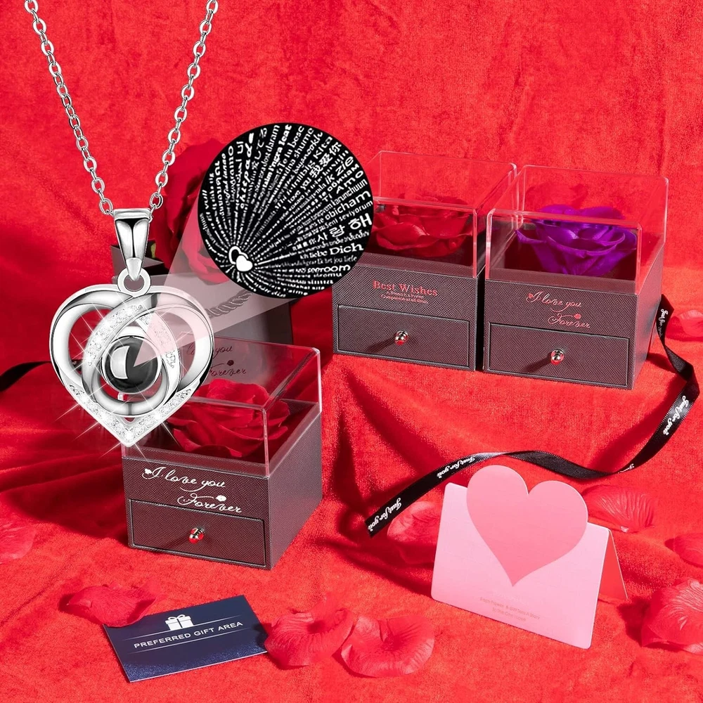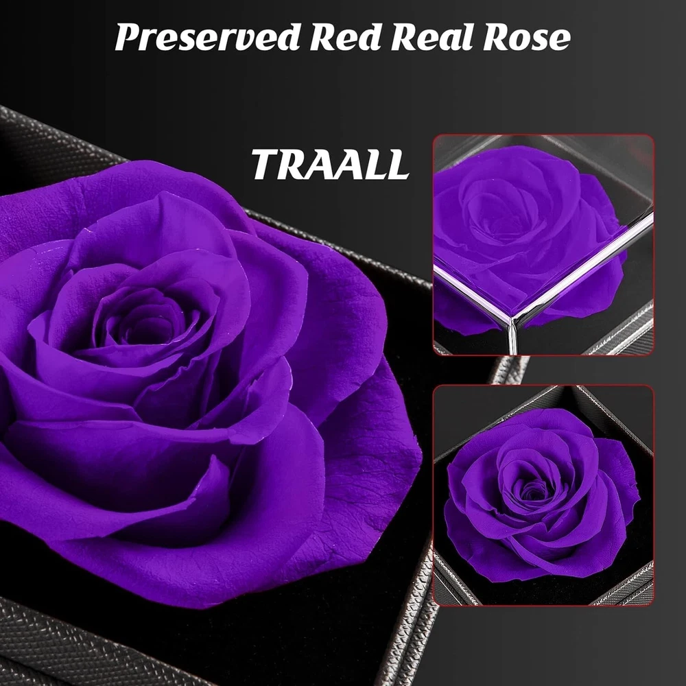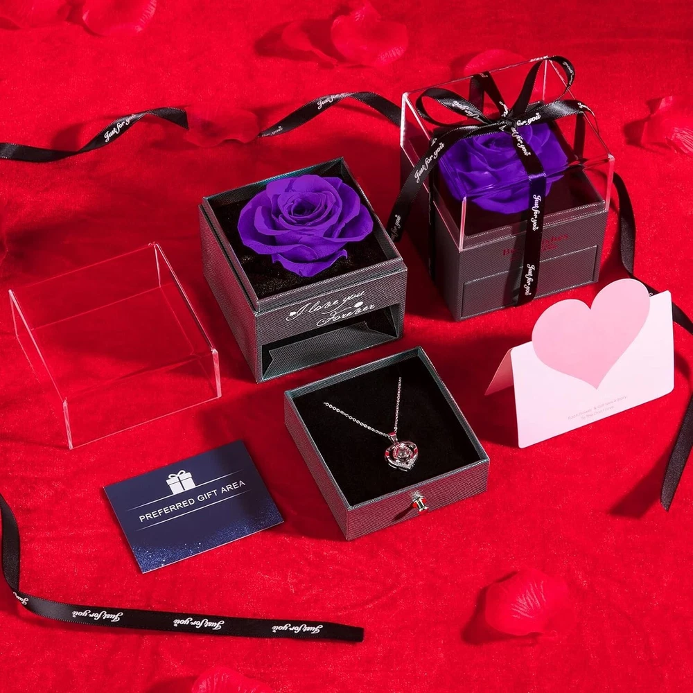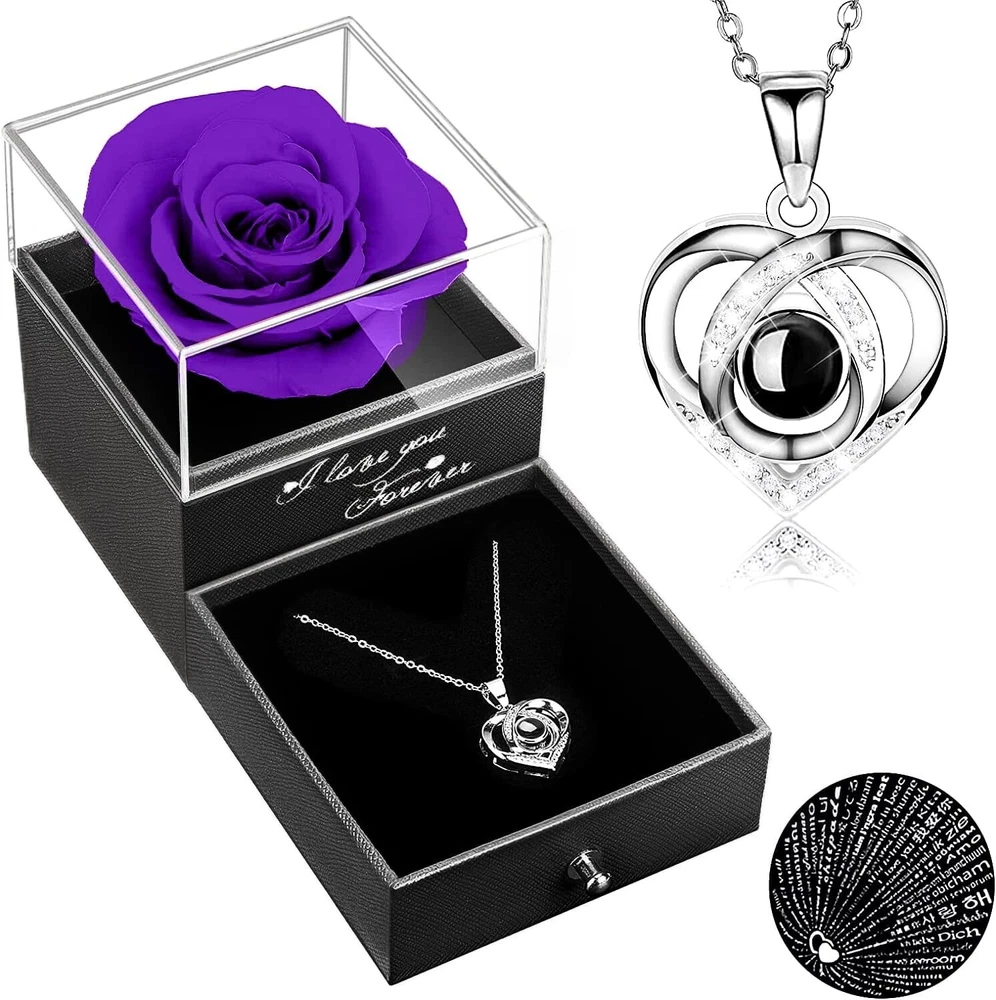 Mothers Day Preserved Real Rose W/ I Love You Necklace Eternal Rose Gift, Purple
