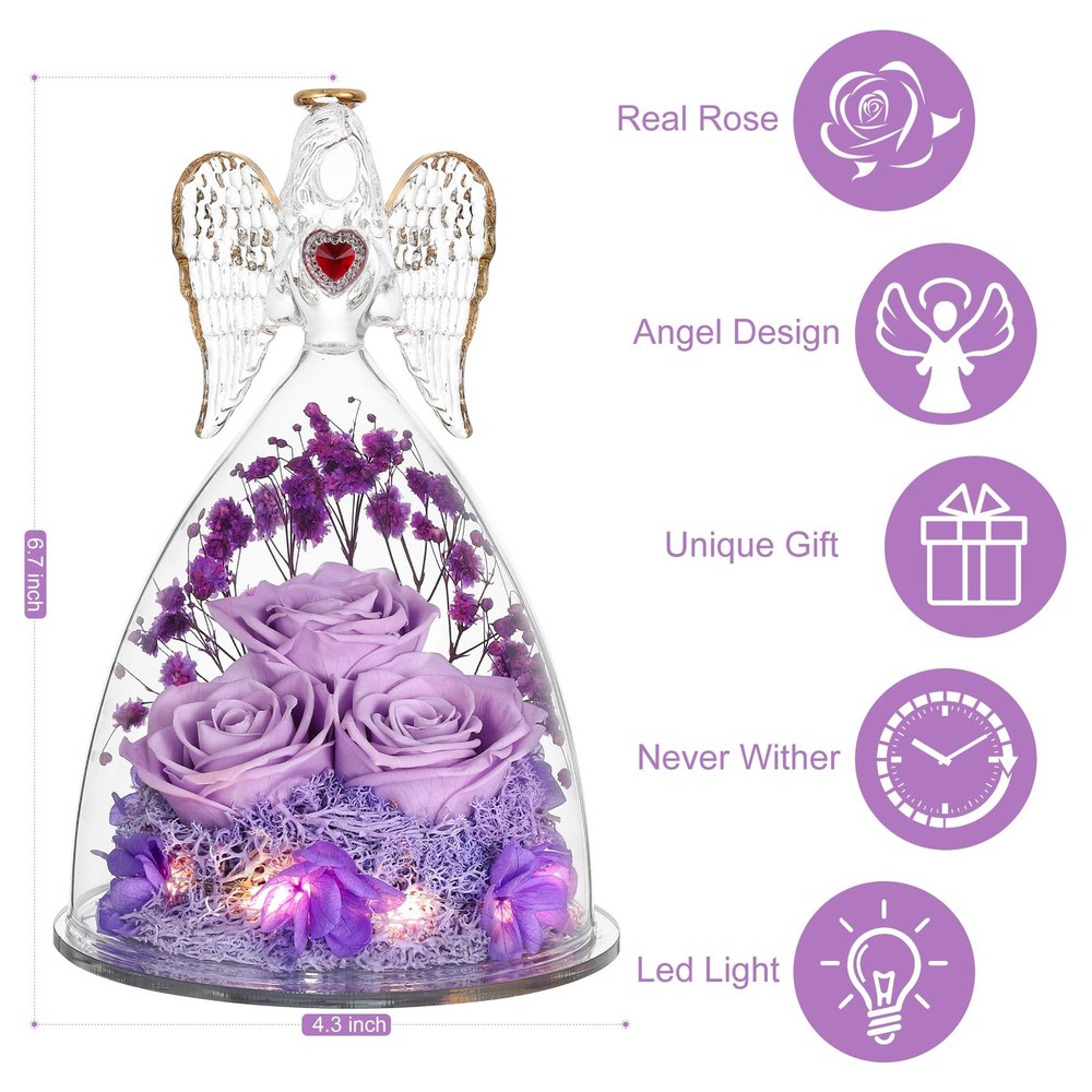 Large Angel with Real Rose Preserved Real Flowers Rose Gifts for Women Mom Girlfriend, Glass Angel Figurines Gifts with Rose for her Angel Size: 6.69"H x 4.13"W x 4.13"D Patented Angel Figurines and Inside Rose Flower Bouquet 【Large Rose with Real Rose Inside】Beauty Angel Height: 6.69inch (17cm) Bottom diameter 4.13inch(10.5cm),REAL Roses Gift that Lasts Forever| Fresh Flowers for Delivery Prime | Angel Roses for Her, Mom, Wife,Girlfriend, Anniversary,Christmas 【Preserved Real Flower Rose】Preserved flower is made of rose with unique preservation process. Also Known as“ never withered flower ” and “ eternal flower ”. Stand for your Endless Love,Handmade preserved flower roses lasting 3 - 5 years without watering and daily conservation, need to avoid sunlight to retain the color of the rose; 【High Quality, individually hand-crafted glass Beauty Angel figurine】 Angel decoration always represents best wishes and guardian, with forever real rose inside,it stands for eternal love and best wishes for girlfriend, wife, mom,Best Gift for loved ones; 【UNIQUE GIFT,Mothers Day Gift】 Angel with Rose is a symbol of love and best wishes, the angel with preserved real flower rose will be a lovely gift for Thanksgiving, Christmas, Valentine's Day, birthday, Mother's Day,anniversaries, or any other special occasions and festivals, which will show your eternal love for him or her. 【What you get】Elegant Angel Figurines with preserved Forever Real rose,Gift Card,Protection Gift Box