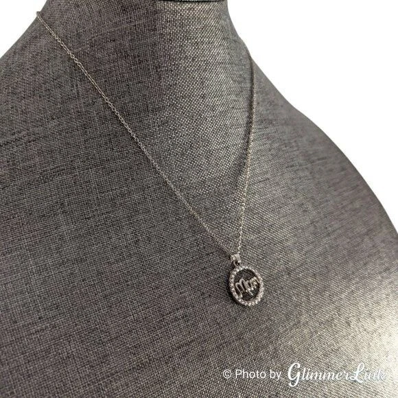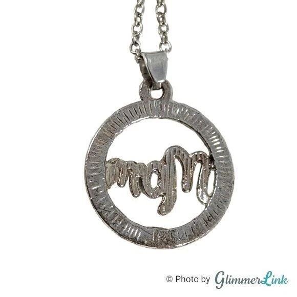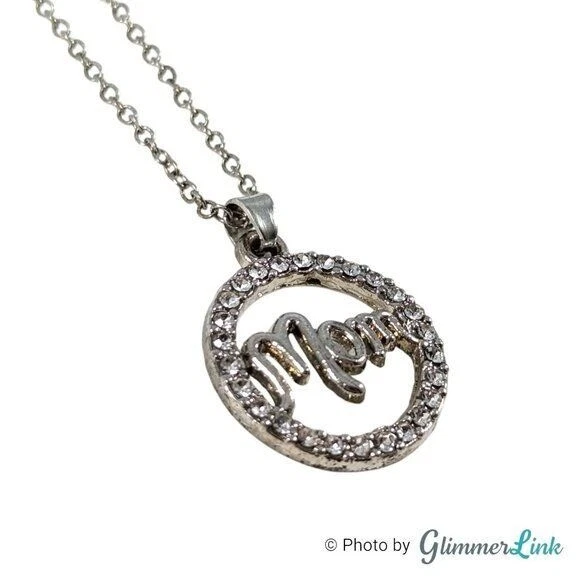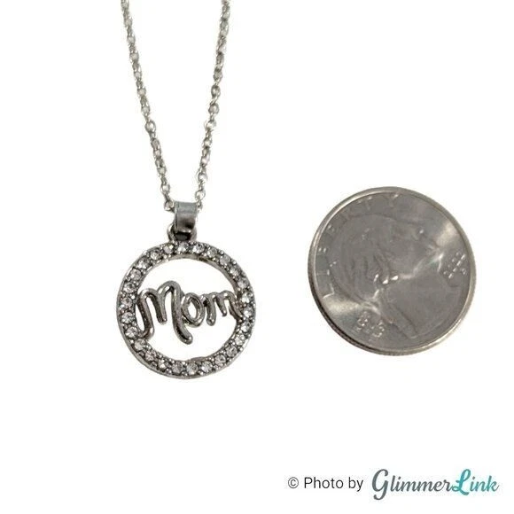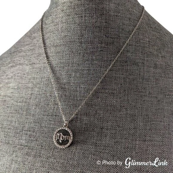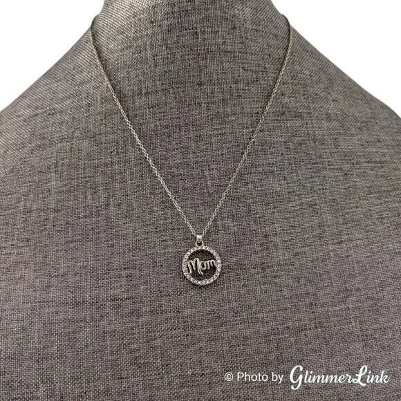 Silver tone necklace featuring an openwork pave halo pendant that says, "Mom". Perfect as a Mother's Day gift or just to let her know you are thinking of her. The necklace measures approximately 18 1/2" long with a lobster claw clasp. It has an additional 2" long extender. The pendant measures approximately 7/8" long and 3/4" wide. Unsigned This necklace is in excellent preloved condition with minor signs of wear. Please see pictures for details. INV27142020