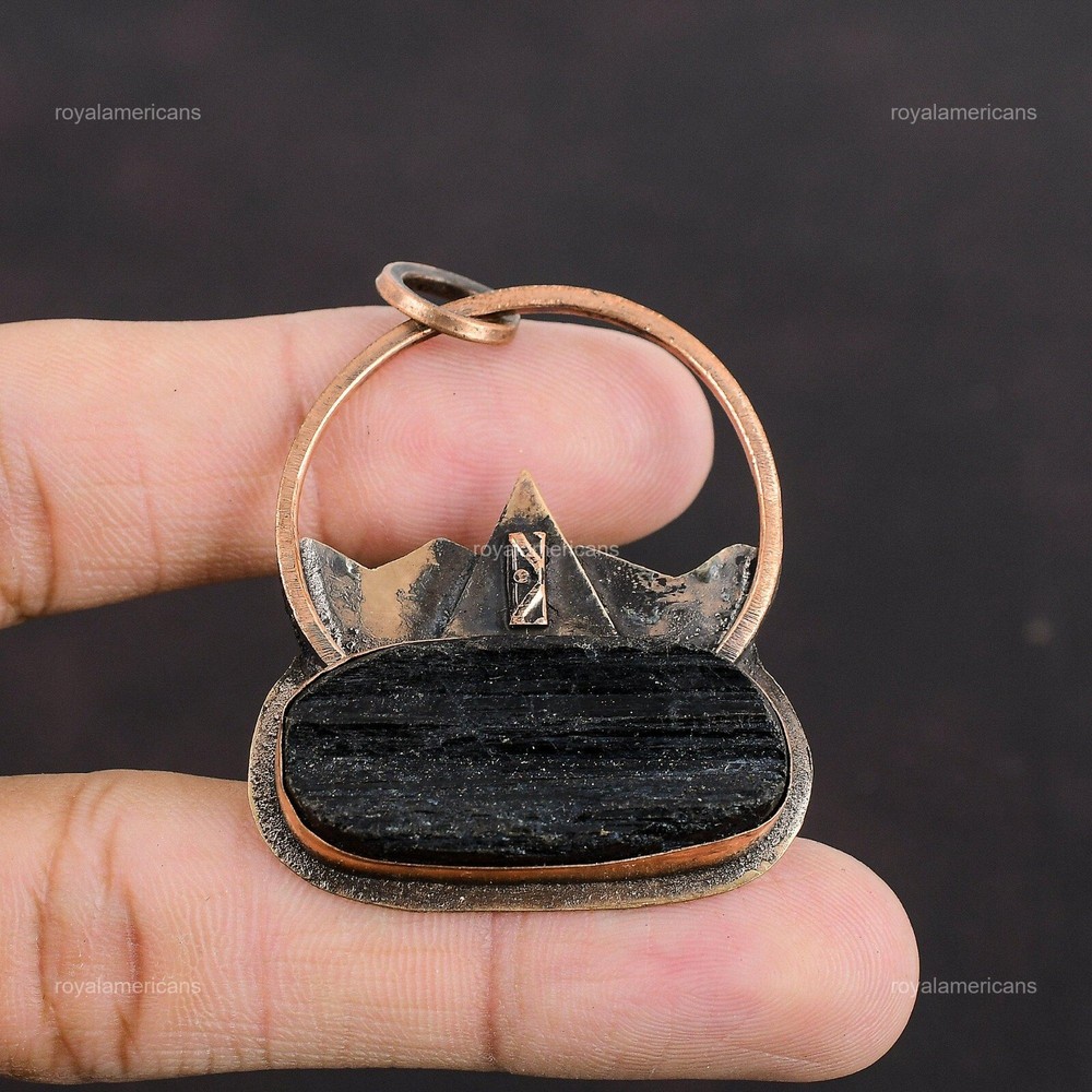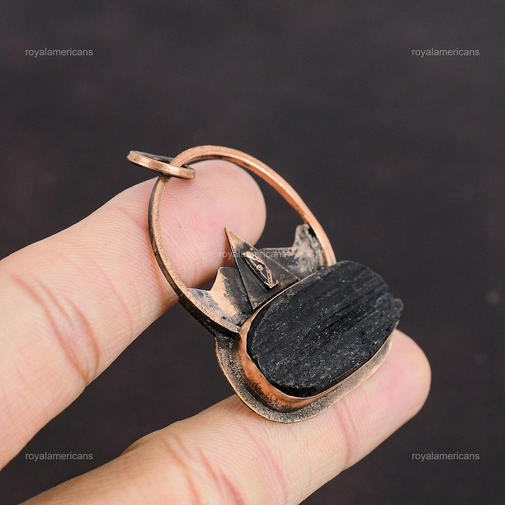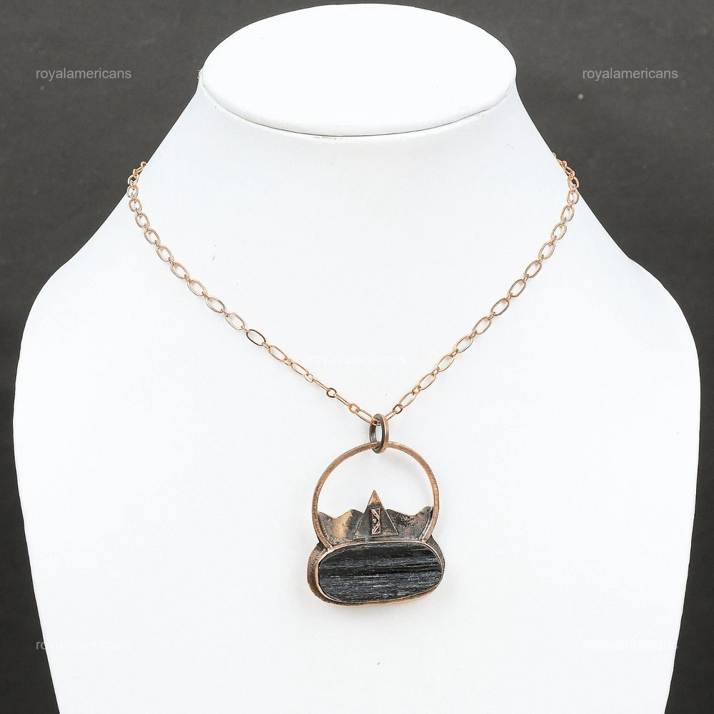 Mothers Day Sale Copper Oval Black Tourmaline Rough Art Deco Pendant