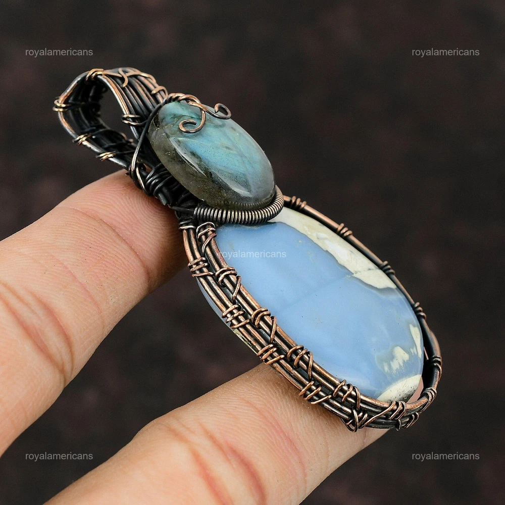 Note : Due to the natural formation of this gemstone. Slight variation in design and color are to be expected. Welcome to Royalamericans Mothers day Sale Copper Oval Owyhee Blue Opal Gemstone Labradorite Wife Pendant Handmade Pendant, Wire Wrapped Pendant, Wire Wrapped Jewelry, Copper Pendant, Copper Wire Pendant, Wrapped Jewelry, Wire Wrap Pendant, Wire Wrap Jewelry SKU : UFWP-156 Gemstone : Owyhee Blue Opal Stone Shape : Oval Metal Purity : Unknown Copper Length : 72 Millimeters Width : 35 Millimeters Copper has been used for jewelry making for thousands of years, dating back to ancient civilizations such as the Egyptians, Romans, and Aztecs. Copper was valued for its beauty, versatility, and durability, and was often used to make everything from jewelry and coins to cookware and tools. In addition to its historical significance, copper jewelry also offers several benefits. Copper is a natural conductor of heat and electricity, which makes it ideal for energy healing and therapeutic purposes. Wearing copper jewelry is believed to have various health benefits, such as improving circulation, reducing inflammation, and boosting the immune system. Some people also believe that copper jewelry has the ability to balance energy and improve mood. For Mother's Day Gift For Father's Day Gift For Promise For Valentine's Day For Halloween Party For Christmas Day Gift For New Year Party For Mom For Her If you can't find the information you need or need some advice for your design? Feel free to contact us. We are fast to reply :) All our work is made by hand with Love and Care in our workshop Thank you so much for visiting and hope you enjoy shopping with us Royalamericans is committed to delivering the best quality sterling silver jewelry to customers. As a handmade jewelry manufacturer, we offer an extensive selection of copper gemstone jewelry that showcases the brilliance of our craftsmanship. We are an experienced handmade jewelry supplier with expertise in embellishing gemstones to suit every style. We offer you the liberty to create your jewelry ensemble with sparkling, earthy, and pure gemstones. Our Talented artisans masterfully handcraft each piece of jewelry you see here. Our pieces are made with genuine gemstones.