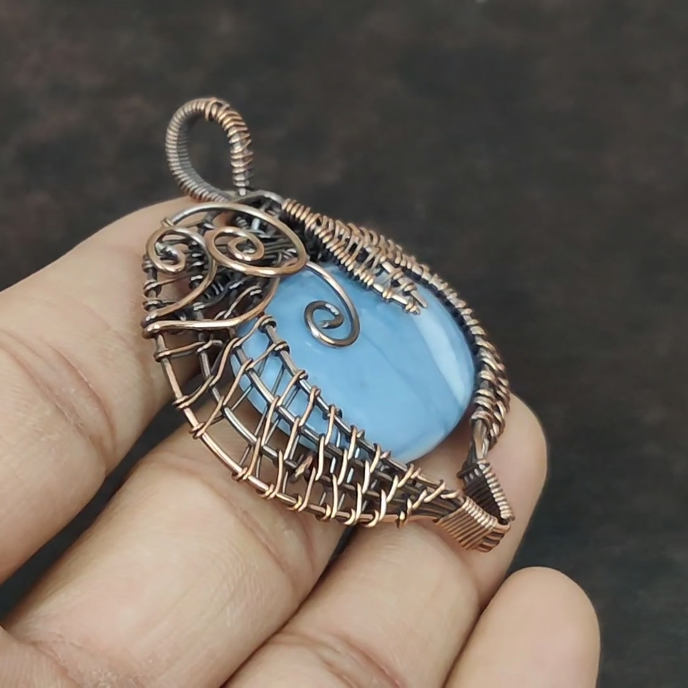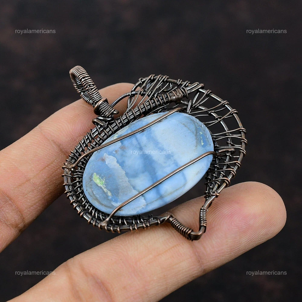 Note : Due to the natural formation of this gemstone. Slight variation in design and color are to be expected. Welcome to Royalamericans Mothers day Sale Copper Oval Owyhee Blue Opal Gemstone Wire Wrap Pendant Jewelry Handmade Pendant, Wire Wrapped Pendant, Wire Wrapped Jewelry, Copper Pendant, Copper Wire Pendant, Wrapped Jewelry, Wire Wrap Pendant, Wire Wrap Jewelry SKU : UFWP-1562 Gemstone : Owyhee Blue Opal Stone Shape : Oval Metal Purity : Unknown Copper Length : 60 Millimeters Width : 50 Millimeters Copper has been used for jewelry making for thousands of years, dating back to ancient civilizations such as the Egyptians, Romans, and Aztecs. Copper was valued for its beauty, versatility, and durability, and was often used to make everything from jewelry and coins to cookware and tools. In addition to its historical significance, copper jewelry also offers several benefits. Copper is a natural conductor of heat and electricity, which makes it ideal for energy healing and therapeutic purposes. Wearing copper jewelry is believed to have various health benefits, such as improving circulation, reducing inflammation, and boosting the immune system. Some people also believe that copper jewelry has the ability to balance energy and improve mood. For Mother's Day Gift For Father's Day Gift For Promise For Valentine's Day For Halloween Party For Christmas Day Gift For New Year Party For Mom For Her If you can't find the information you need or need some advice for your design? Feel free to contact us. We are fast to reply :) All our work is made by hand with Love and Care in our workshop Thank you so much for visiting and hope you enjoy shopping with us Royalamericans is committed to delivering the best quality sterling silver jewelry to customers. As a handmade jewelry manufacturer, we offer an extensive selection of copper gemstone jewelry that showcases the brilliance of our craftsmanship. We are an experienced handmade jewelry supplier with expertise in embellishing gemstones to suit every style. We offer you the liberty to create your jewelry ensemble with sparkling, earthy, and pure gemstones. Our Talented artisans masterfully handcraft each piece of jewelry you see here. Our pieces are made with genuine gemstones.