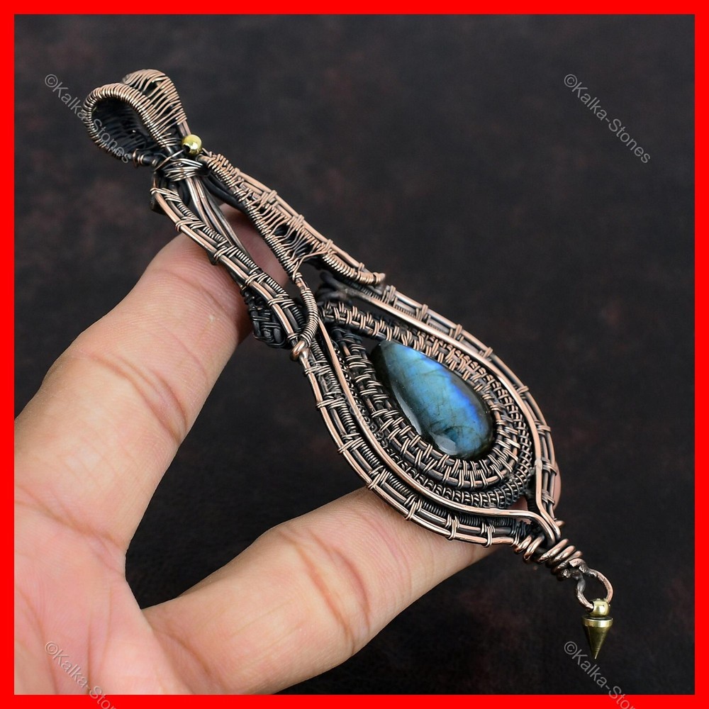 Note : Due to the natural formation of this gemstone. Slight variation in design and color are to be expected. Welcome to Kalka Stones Mothers day Sale Copper Pear Labradorite Gemstone Wire Wrapped Pendant Jewelry Handmade Pendant, Wire Wrapped Pendant, Wire Wrapped Jewelry, Copper Pendant, Copper Wire Pendant, Wrapped Jewelry, Wire Wrap Pendant, Wire Wrap Jewelry SKU : VFWP-4606 Gemstone : Labradorite Stone Shape : Pear Metal Purity : Unknown Copper Length : 123 Millimeters Width : 45 Millimeters Copper has been used for jewelry making for thousands of years, dating back to ancient civilizations such as the Egyptians, Romans, and Aztecs. Copper was valued for its beauty, versatility, and durability, and was often used to make everything from jewelry and coins to cookware and tools. In addition to its historical significance, copper jewelry also offers several benefits. Copper is a natural conductor of heat and electricity, which makes it ideal for energy healing and therapeutic purposes. Wearing copper jewelry is believed to have various health benefits, such as improving circulation, reducing inflammation, and boosting the immune system. Some people also believe that copper jewelry has the ability to balance energy and improve mood. For Mother's Day Gift For Father's Day Gift For Promise For Valentine's Day For Halloween Party For Christmas Day Gift For New Year Party For Mom For Her If you can't find the information you need or need some advice for your design? Feel free to contact us. We are fast to reply :) All our work is made by hand with Love and Care in our workshop Thank you so much for visiting and hope you enjoy shopping with us Kalka Stones is committed to delivering the best quality jewelry to customers. As a handmade jewelry manufacturer, we offer an extensive selection of copper gemstone jewelry that showcases the brilliance of our craftsmanship. We are an experienced handmade jewelry supplier with expertise in embellishing gemstones to suit every style. We offer you the liberty to create your jewelry ensemble with sparkling, earthy, and pure gemstones. Our Talented artisans masterfully handcraft each piece of jewelry you see here. Our pieces are made with genuine gemstones.