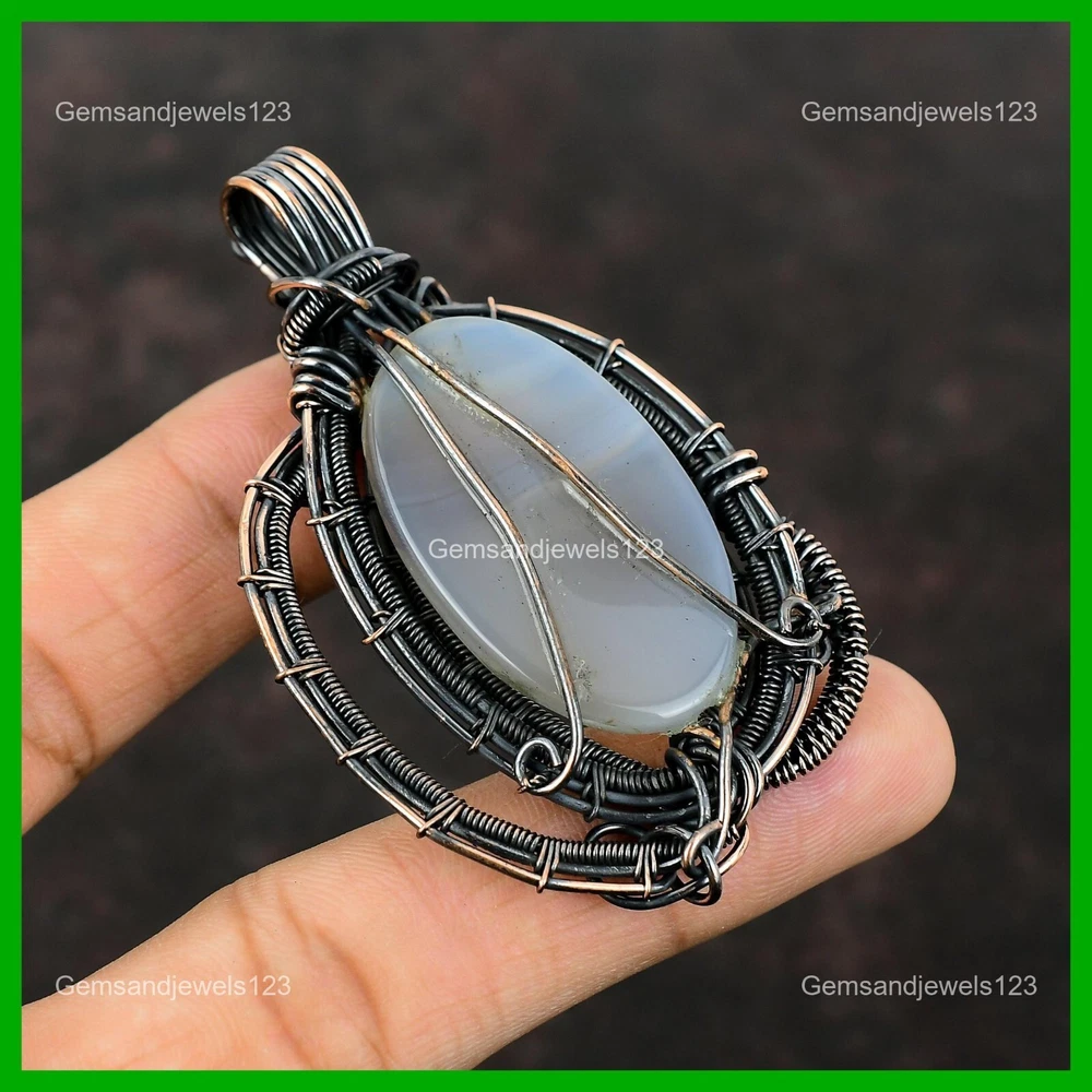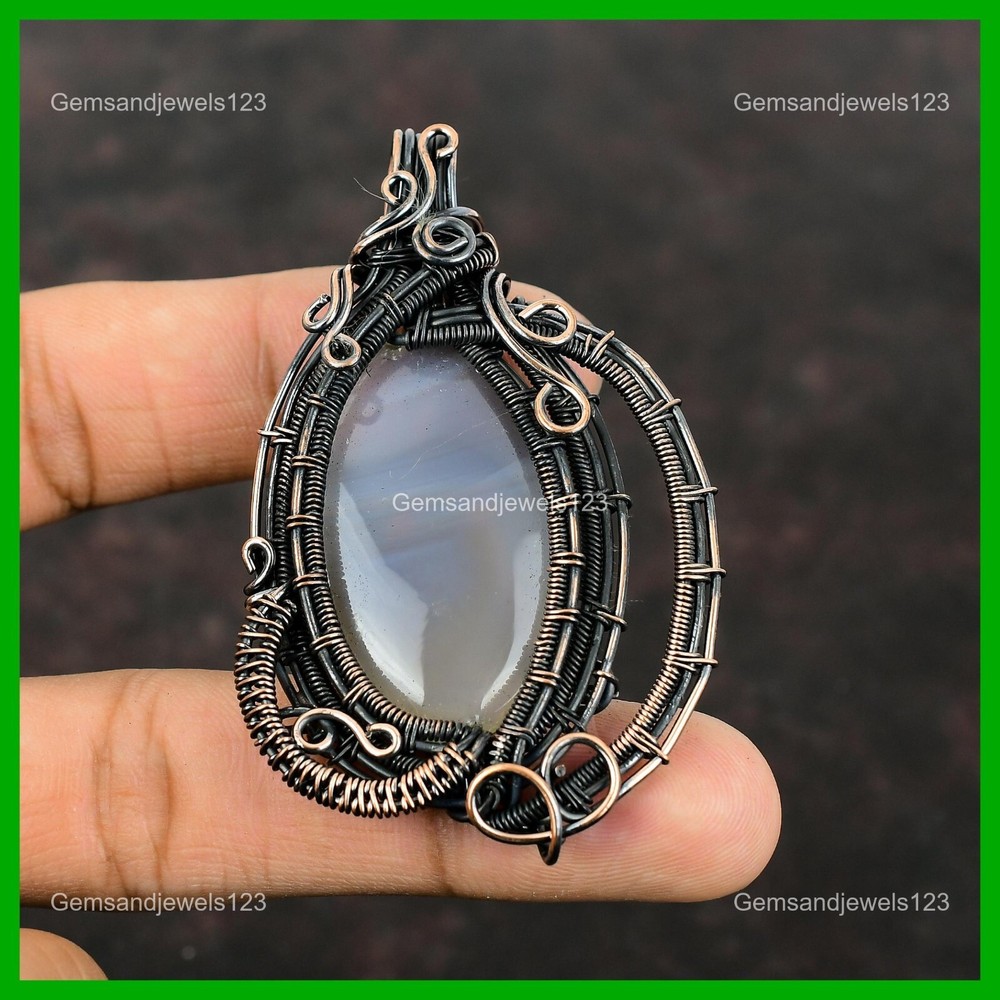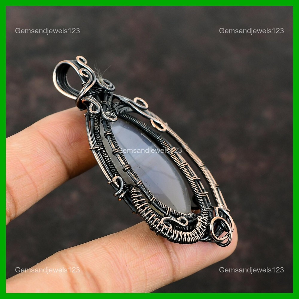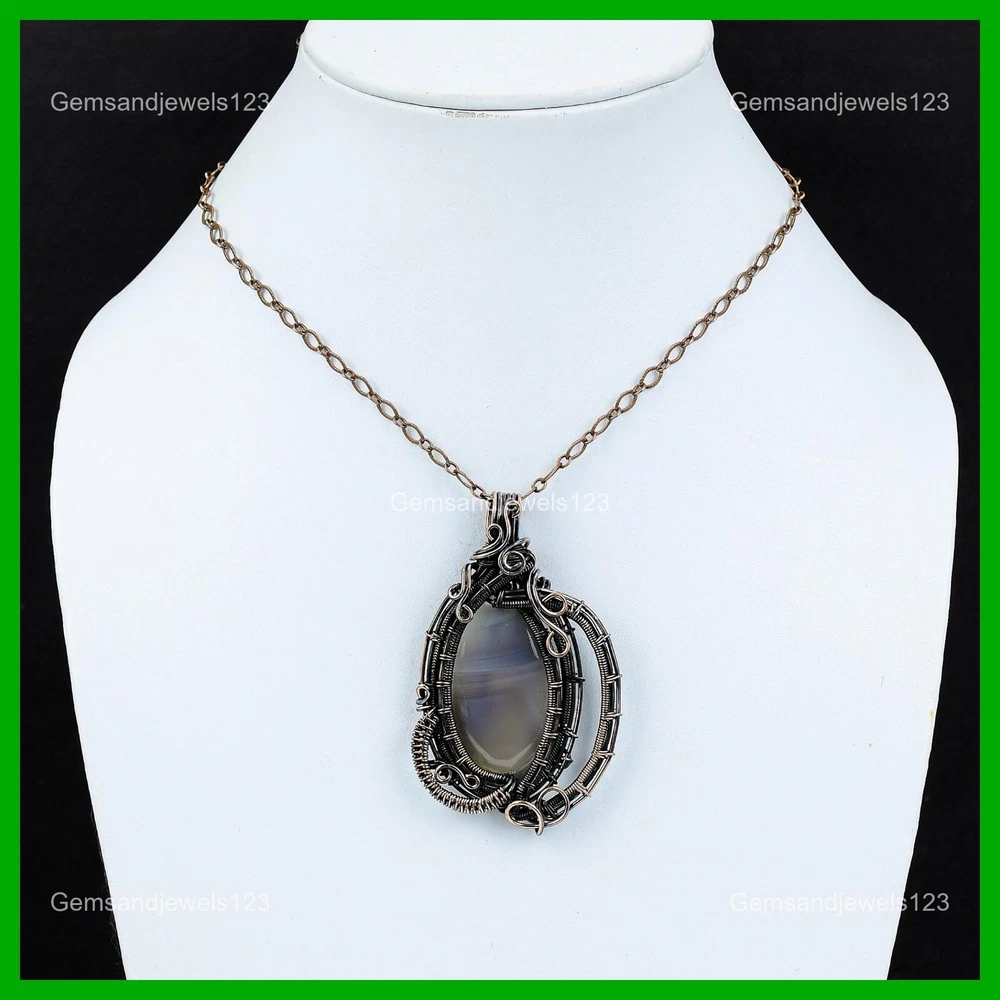 Note : Due to the natural formation of this gemstone. Slight Variation in design and color are to be expected. Welcome to gemsandjewels123 Mothers day Sale Copper Natural Montana Agate Wire Wrapped Anniversary Pendant Handmade Pendant, Wire Wrapped Pendant, Wire Wrapped Jewelry, Copper Pendant, Copper Wire Pendant, Wrapped Jewelry, Wire Wrap Pendant, Wire Wrap Jewelry SKU : VFWP-3621 Gemstone : Montana Agate Stone Shape : Oval Metal Purity : Unknown Copper Length : 74 Millimeters Width : 45 Millimeters Copper has been used for jewelry making for thousands of years, dating back to ancient civilizations such as the Egyptians, Romans, and Aztecs. Copper was valued for its beauty, versatility, and durability, and was often used to make everything from jewelry and coins to cookware and tools. In addition to its historical significance, copper jewelry also offers several benefits. Copper is a natural conductor of heat and electricity, which makes it ideal for energy healing and therapeutic purposes. Wearing copper jewelry is believed to have various health benefits, such as improving circulation, reducing inflammation, and boosting the immune system. Some people also believe that copper jewelry has the ability to balance energy and improve mood. For Mother's Day Gift For Father's Day Gift For Promise For Valentine's Day For Halloween Party For Christmas Day Gift For New Year Party For Mom For Her If you can't find the information you need or need some advice for your design? Feel free to contact us. We are fast to reply :) All our work is made by hand with Love and Care in our workshop Thank you so much for visiting and hope you enjoy shopping with us gemsandjewels123 is committed to delivering the best quality sterling silver jewelry to customers. As a handmade jewelry manufacturer, we offer an extensive selection of copper gemstone jewelry that showcases the brilliance of our craftsmanship. We are an experienced handmade jewelry supplier with expertise in embellishing gemstones to suit every style. We offer you the liberty to create your jewelry ensemble with sparkling, earthy, and pure gemstones. Our Talented artisans masterfully handcraft each piece of jewelry you see here. Our pieces are made with genuine gemstones. The one-of-a-kind piece you see here is the same exact piece you will receive.