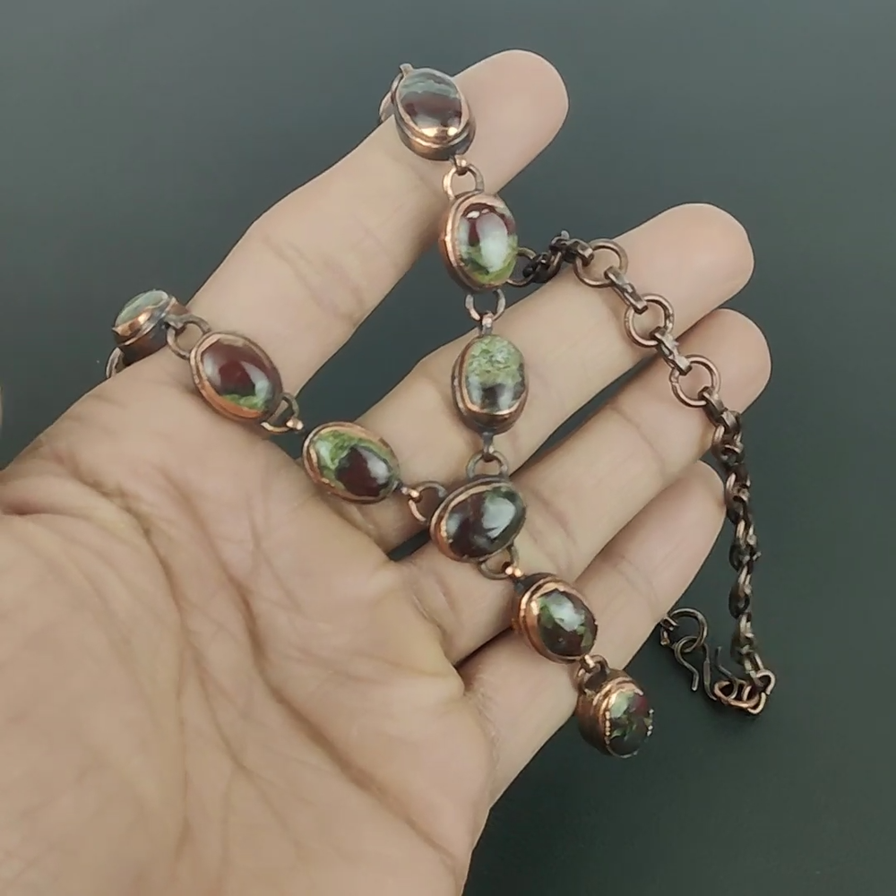 Welcome to bdenterprises123 Mothers day Sale Dragon Bloodstone Gemstone Copper Chain Electroformed Necklace Handmade Necklace, Wire Wrapped Necklace, Wire Wrapped Jewelry, Copper Pendant, Copper Wire Necklace, Wrapped Jewelry, Wire Wrap Necklace, Wire Wrap Jewelry SKU : HZN-71 Gemstone : Dragon Bloodstone Stone Shape : Oval Metal Purity : Unknown Copper Length : 20 Inches Width : Inches Copper has been used for jewelry making for thousands of years, dating back to ancient civilizations such as the Egyptians, Romans, and Aztecs. Copper was valued for its beauty, versatility, and durability, and was often used to make everything from jewelry and coins to cookware and tools. In addition to its historical significance, copper jewelry also offers several benefits. Copper is a natural conductor of heat and electricity, which makes it ideal for energy healing and therapeutic purposes. Wearing copper jewelry is believed to have various health benefits, such as improving circulation, reducing inflammation, and boosting the immune system. Some people also believe that copper jewelry has the ability to balance energy and improve mood. For Mother's Day Gift For Father's Day Gift For Promise For Valentine's Day For Halloween Party For Christmas Day Gift For New Year Party For Mom For Her If you can't find the information you need or need some advice for your design? Feel free to contact us. We are fast to reply :) All our work is made by hand with Love and Care in our workshop Thank you so much for visiting and hope you enjoy shopping with us bdenterprises123 is committed to delivering the best quality sterling silver jewelry to customers. As a handmade jewelry manufacturer, we offer an extensive selection of copper gemstone jewelry that showcases the brilliance of our craftsmanship. We are an experienced handmade jewelry supplier with expertise in embellishing gemstones to suit every style. We offer you the liberty to create your jewelry ensemble with sparkling, earthy, and pure gemstones. Our Talented artisans masterfully handcraft each piece of jewelry you see here. Our pieces are made with genuine gemstones. The one-of-a-kind piece you see here is the same exact piece you will receive.