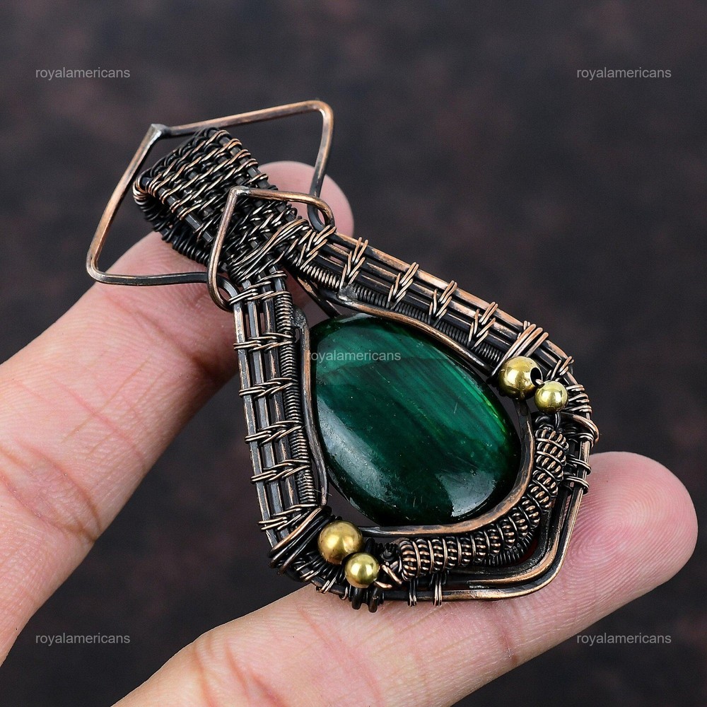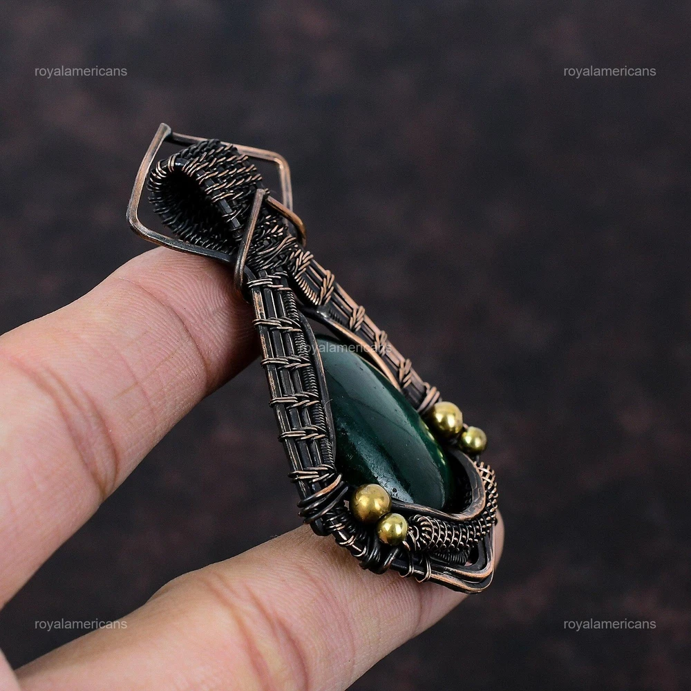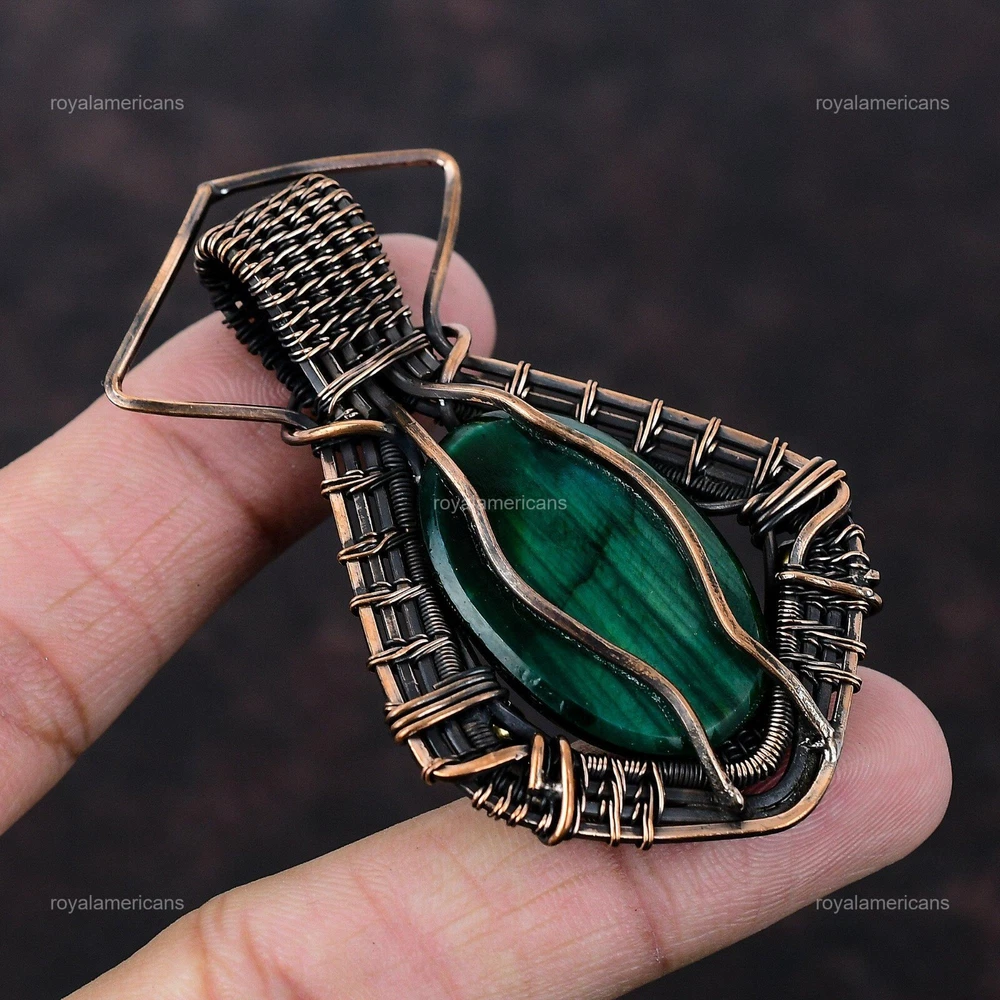 Note : Due to the natural formation of this gemstone. Slight variation in design and color are to be expected. Welcome to Royalamericans Mothers day Sale Green Fire Labradorite Gemstone Art Deco Pendant Jewelry Copper Handmade Pendant, Wire Wrapped Pendant, Wire Wrapped Jewelry, Copper Pendant, Copper Wire Pendant, Wrapped Jewelry, Wire Wrap Pendant, Wire Wrap Jewelry SKU : UFWP-1839 Gemstone : Green Fire Labradorite Stone Shape : Oval Metal Purity : Unknown Copper Length : 70 Millimeters Width : 44 Millimeters Copper has been used for jewelry making for thousands of years, dating back to ancient civilizations such as the Egyptians, Romans, and Aztecs. Copper was valued for its beauty, versatility, and durability, and was often used to make everything from jewelry and coins to cookware and tools. In addition to its historical significance, copper jewelry also offers several benefits. Copper is a natural conductor of heat and electricity, which makes it ideal for energy healing and therapeutic purposes. Wearing copper jewelry is believed to have various health benefits, such as improving circulation, reducing inflammation, and boosting the immune system. Some people also believe that copper jewelry has the ability to balance energy and improve mood. For Mother's Day Gift For Father's Day Gift For Promise For Valentine's Day For Halloween Party For Christmas Day Gift For New Year Party For Mom For Her If you can't find the information you need or need some advice for your design? Feel free to contact us. We are fast to reply :) All our work is made by hand with Love and Care in our workshop Thank you so much for visiting and hope you enjoy shopping with us Royalamericans is committed to delivering the best quality sterling silver jewelry to customers. As a handmade jewelry manufacturer, we offer an extensive selection of copper gemstone jewelry that showcases the brilliance of our craftsmanship. We are an experienced handmade jewelry supplier with expertise in embellishing gemstones to suit every style. We offer you the liberty to create your jewelry ensemble with sparkling, earthy, and pure gemstones. Our Talented artisans masterfully handcraft each piece of jewelry you see here. Our pieces are made with genuine gemstones.