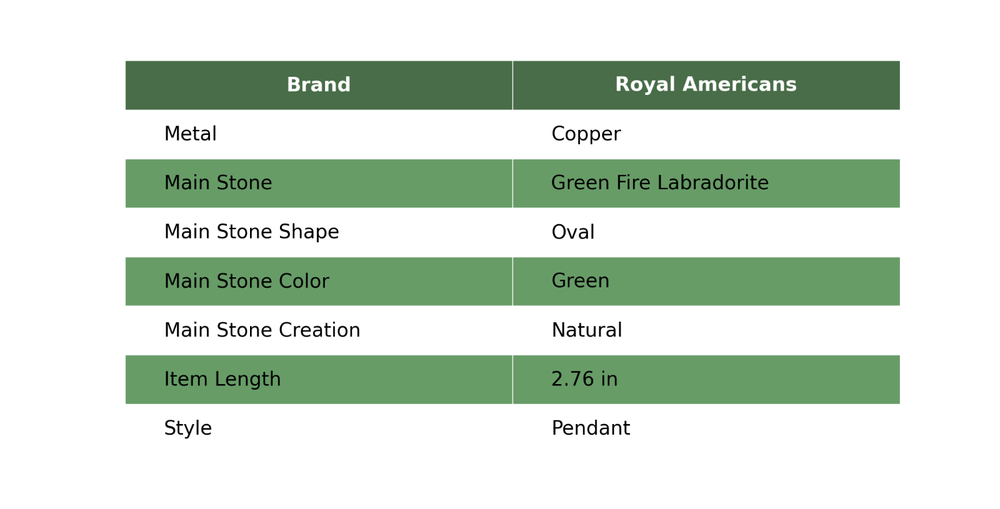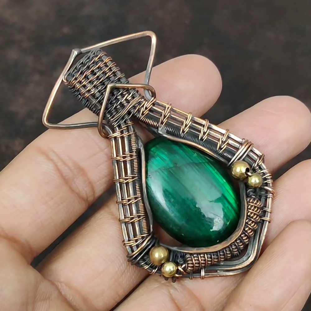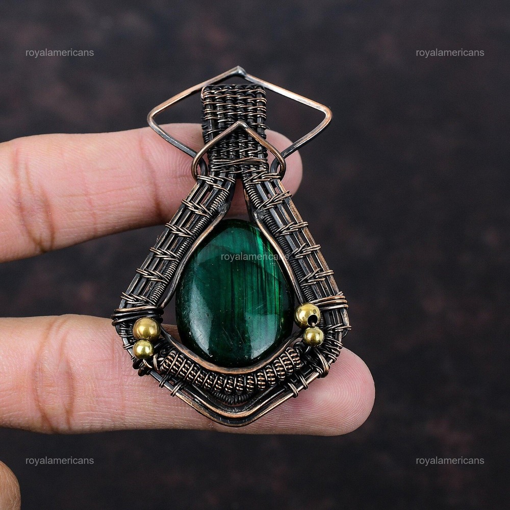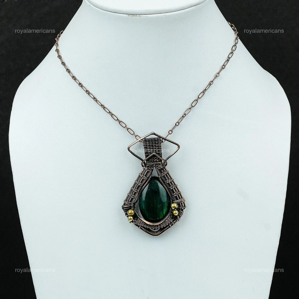 Note : Due to the natural formation of this gemstone. Slight variation in design and color are to be expected. Welcome to Royalamericans Mothers day Sale Green Fire Labradorite Gemstone Art Deco Pendant Jewelry Copper Handmade Pendant, Wire Wrapped Pendant, Wire Wrapped Jewelry, Copper Pendant, Copper Wire Pendant, Wrapped Jewelry, Wire Wrap Pendant, Wire Wrap Jewelry SKU : UFWP-1839 Gemstone : Green Fire Labradorite Stone Shape : Oval Metal Purity : Unknown Copper Length : 70 Millimeters Width : 44 Millimeters Copper has been used for jewelry making for thousands of years, dating back to ancient civilizations such as the Egyptians, Romans, and Aztecs. Copper was valued for its beauty, versatility, and durability, and was often used to make everything from jewelry and coins to cookware and tools. In addition to its historical significance, copper jewelry also offers several benefits. Copper is a natural conductor of heat and electricity, which makes it ideal for energy healing and therapeutic purposes. Wearing copper jewelry is believed to have various health benefits, such as improving circulation, reducing inflammation, and boosting the immune system. Some people also believe that copper jewelry has the ability to balance energy and improve mood. For Mother's Day Gift For Father's Day Gift For Promise For Valentine's Day For Halloween Party For Christmas Day Gift For New Year Party For Mom For Her If you can't find the information you need or need some advice for your design? Feel free to contact us. We are fast to reply :) All our work is made by hand with Love and Care in our workshop Thank you so much for visiting and hope you enjoy shopping with us Royalamericans is committed to delivering the best quality sterling silver jewelry to customers. As a handmade jewelry manufacturer, we offer an extensive selection of copper gemstone jewelry that showcases the brilliance of our craftsmanship. We are an experienced handmade jewelry supplier with expertise in embellishing gemstones to suit every style. We offer you the liberty to create your jewelry ensemble with sparkling, earthy, and pure gemstones. Our Talented artisans masterfully handcraft each piece of jewelry you see here. Our pieces are made with genuine gemstones.