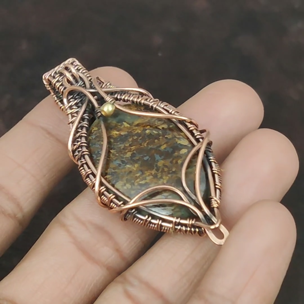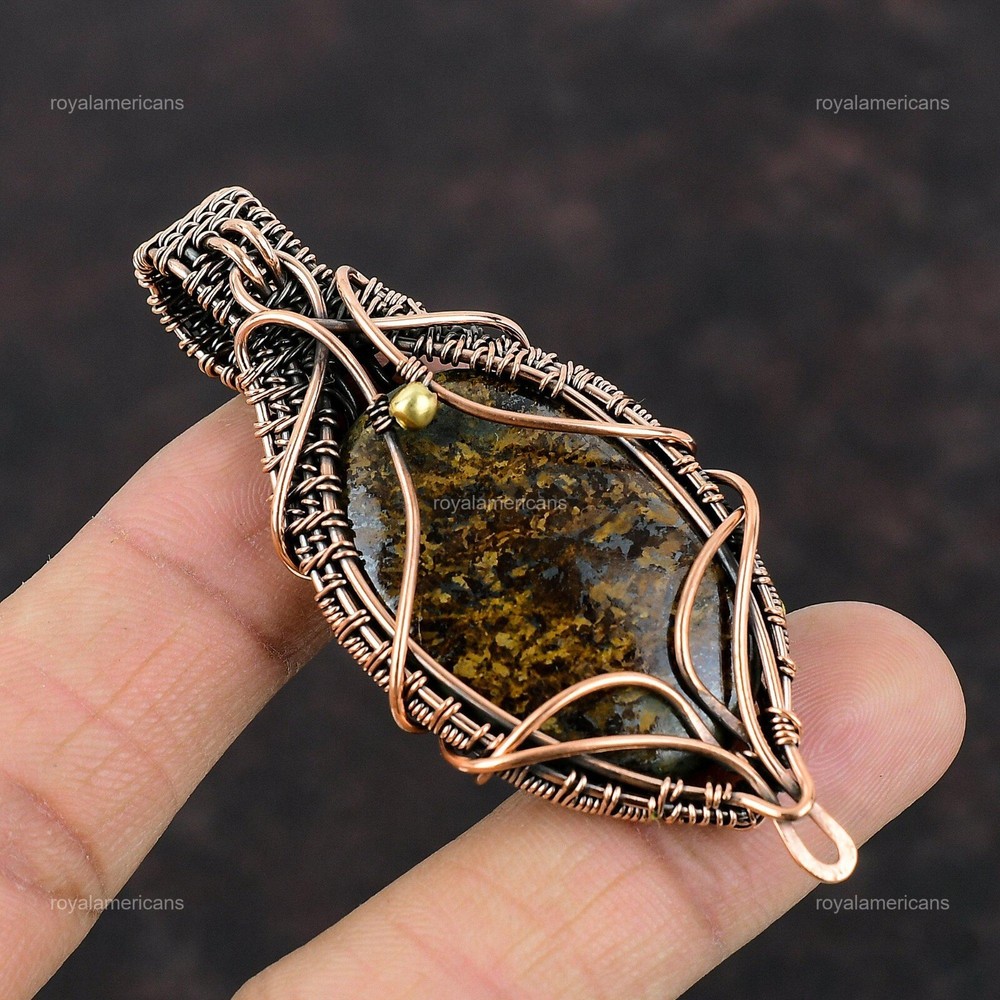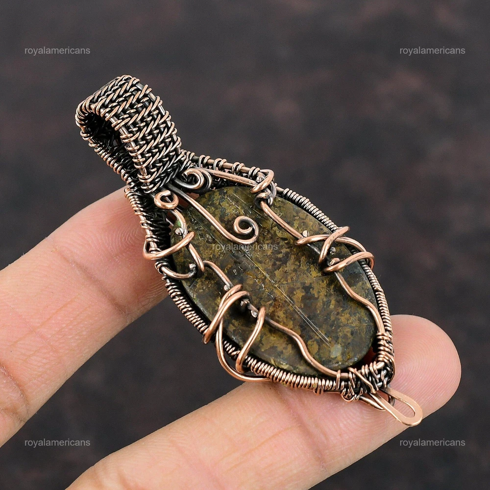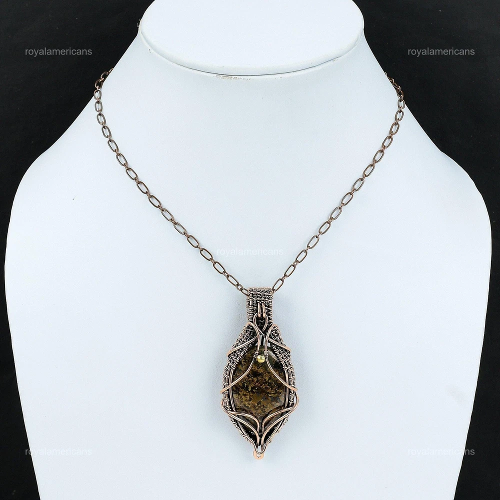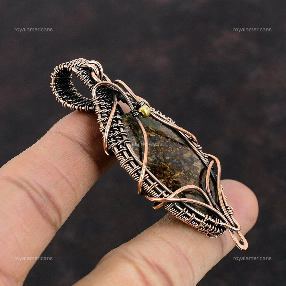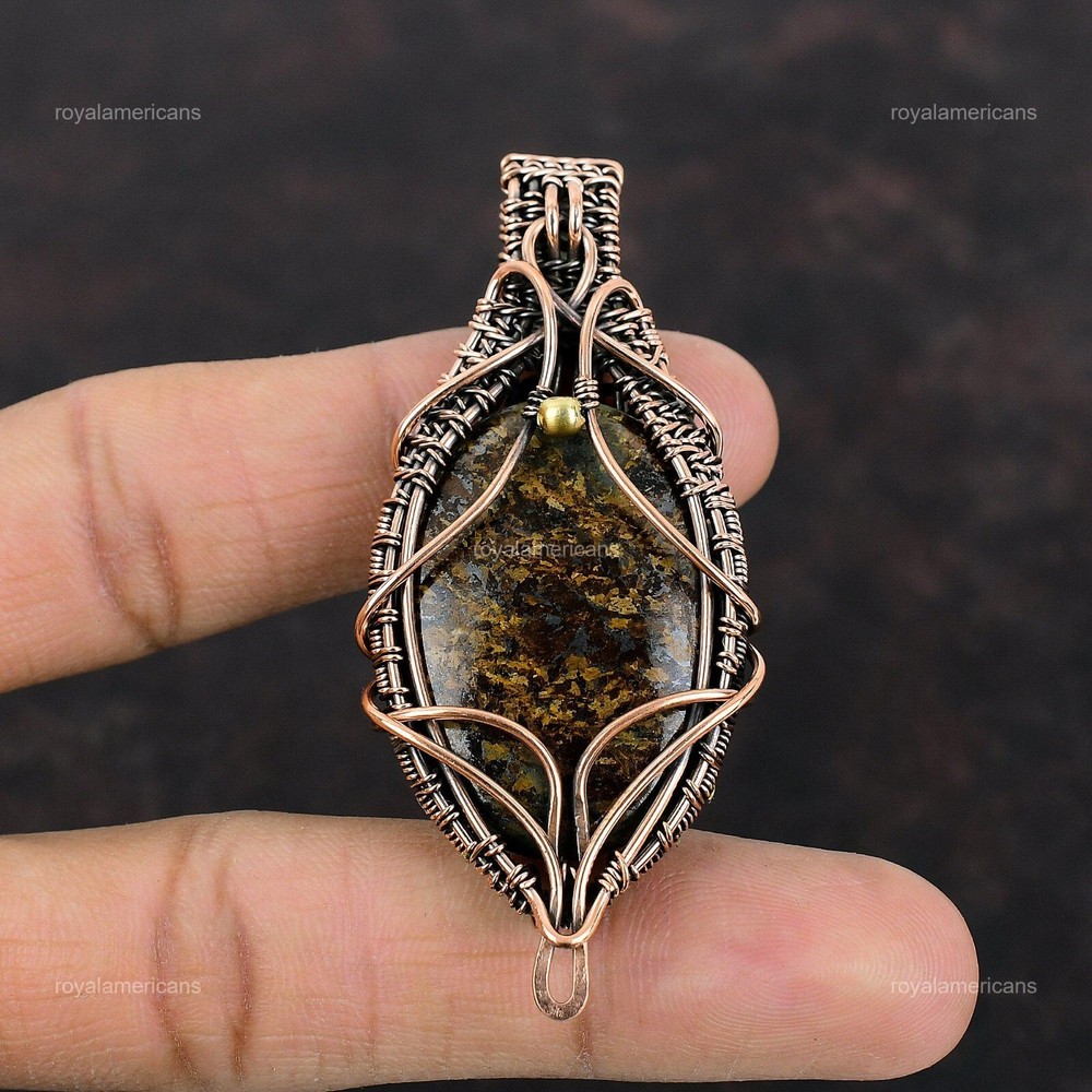 Note : Due to the natural formation of this gemstone. Slight variation in design and color are to be expected. Welcome to Royalamericans Mothers day Sale Copper Bronzite Stone Handmade Daughter Wedding Pendant Jewelry Handmade Pendant, Wire Wrapped Pendant, Wire Wrapped Jewelry, Copper Pendant, Copper Wire Pendant, Wrapped Jewelry, Wire Wrap Pendant, Wire Wrap Jewelry SKU : UFWP-689 Gemstone : Bronzite Stone Shape : Oval Metal Purity : Unknown Copper Length : 70 Millimeters Width : 30 Millimeters Copper has been used for jewelry making for thousands of years, dating back to ancient civilizations such as the Egyptians, Romans, and Aztecs. Copper was valued for its beauty, versatility, and durability, and was often used to make everything from jewelry and coins to cookware and tools. In addition to its historical significance, copper jewelry also offers several benefits. Copper is a natural conductor of heat and electricity, which makes it ideal for energy healing and therapeutic purposes. Wearing copper jewelry is believed to have various health benefits, such as improving circulation, reducing inflammation, and boosting the immune system. Some people also believe that copper jewelry has the ability to balance energy and improve mood. For Mother's Day Gift For Father's Day Gift For Promise For Valentine's Day For Halloween Party For Christmas Day Gift For New Year Party For Mom For Her If you can't find the information you need or need some advice for your design? Feel free to contact us. We are fast to reply :) All our work is made by hand with Love and Care in our workshop Thank you so much for visiting and hope you enjoy shopping with us Royalamericans is committed to delivering the best quality sterling silver jewelry to customers. As a handmade jewelry manufacturer, we offer an extensive selection of copper gemstone jewelry that showcases the brilliance of our craftsmanship. We are an experienced handmade jewelry supplier with expertise in embellishing gemstones to suit every style. We offer you the liberty to create your jewelry ensemble with sparkling, earthy, and pure gemstones. Our Talented artisans masterfully handcraft each piece of jewelry you see here. Our pieces are made with genuine gemstones.