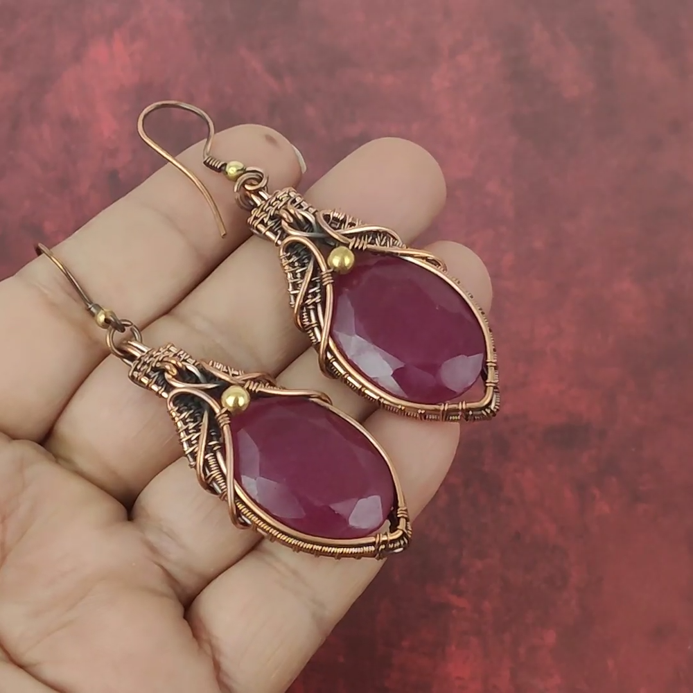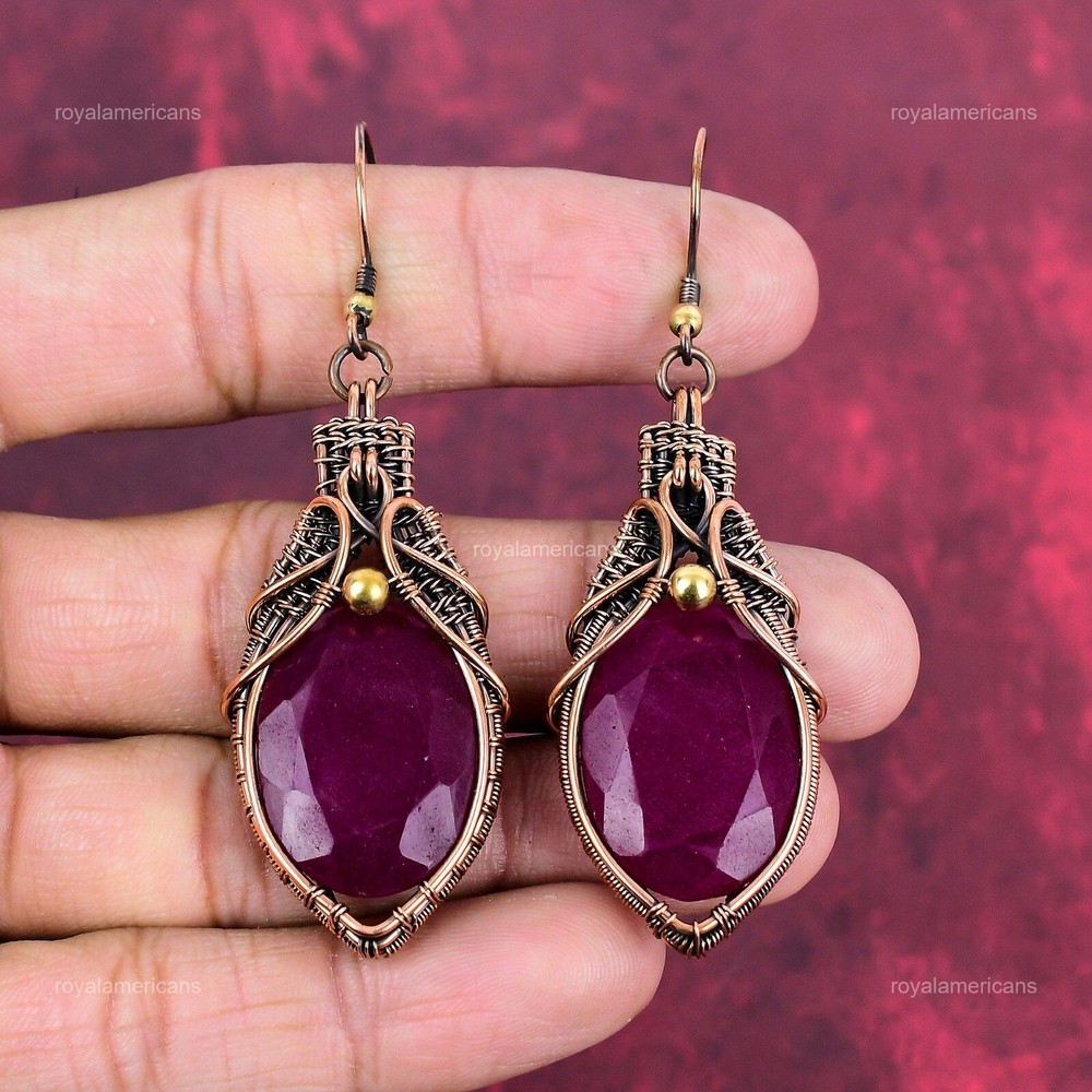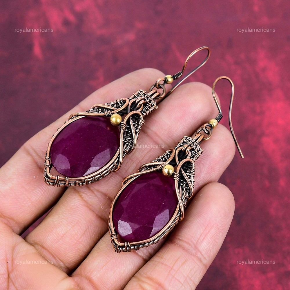 Note : Due to the natural formation of this gemstone. Slight variation in design and color are to be expected. Welcome to Royalamericans Mothers day Sale Kashmir Rubi Gemstone Boho Dangle Wire Wrapped Earrings Copper Handmade Earrings, Wire Wrapped Earrings, Wire Wrapped Jewelry, Copper Pendant, Copper Wire Earrings, Wrapped Jewelry, Wire Wrap Earrings, Wire Wrap Jewelry SKU : AE-26 Gemstone : Kashmir Rubi Stone Shape : Oval Metal Purity : Unknown Copper Length : 73 Millimeters Width : 23 Millimeters Copper has been used for jewelry making for thousands of years, dating back to ancient civilizations such as the Egyptians, Romans, and Aztecs. Copper was valued for its beauty, versatility, and durability, and was often used to make everything from jewelry and coins to cookware and tools. In addition to its historical significance, copper jewelry also offers several benefits. Copper is a natural conductor of heat and electricity, which makes it ideal for energy healing and therapeutic purposes. Wearing copper jewelry is believed to have various health benefits, such as improving circulation, reducing inflammation, and boosting the immune system. Some people also believe that copper jewelry has the ability to balance energy and improve mood. For Mother's Day Gift For Father's Day Gift For Promise For Valentine's Day For Halloween Party For Christmas Day Gift For New Year Party For Mom For Her If you can't find the information you need or need some advice for your design? Feel free to contact us. We are fast to reply :) All our work is made by hand with Love and Care in our workshop Thank you so much for visiting and hope you enjoy shopping with us Royalamericans is committed to delivering the best quality sterling silver jewelry to customers. As a handmade jewelry manufacturer, we offer an extensive selection of copper gemstone jewelry that showcases the brilliance of our craftsmanship. We are an experienced handmade jewelry supplier with expertise in embellishing gemstones to suit every style. We offer you the liberty to create your jewelry ensemble with sparkling, earthy, and pure gemstones. Our Talented artisans masterfully handcraft each piece of jewelry you see here. Our pieces are made with genuine gemstones.
