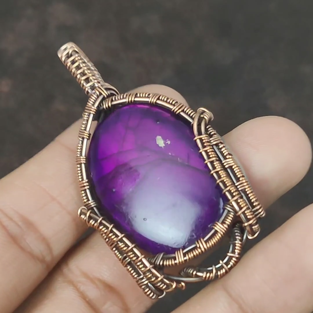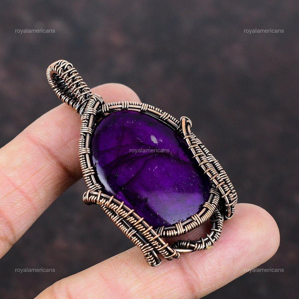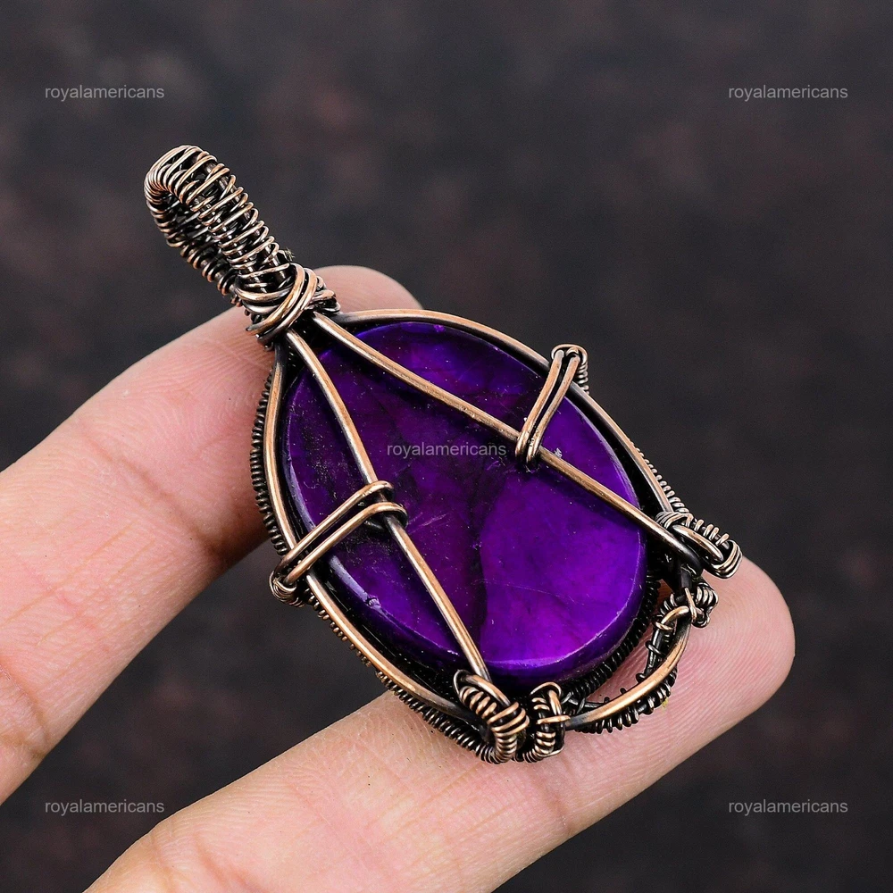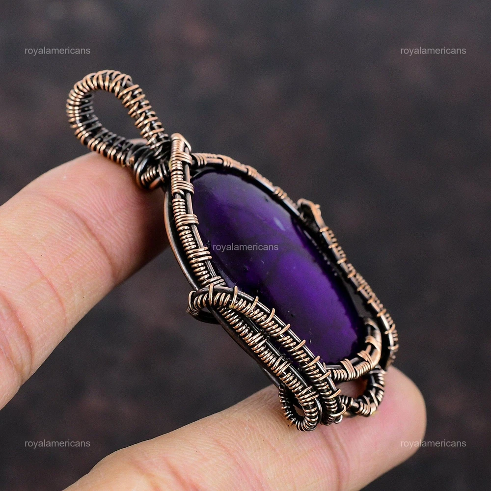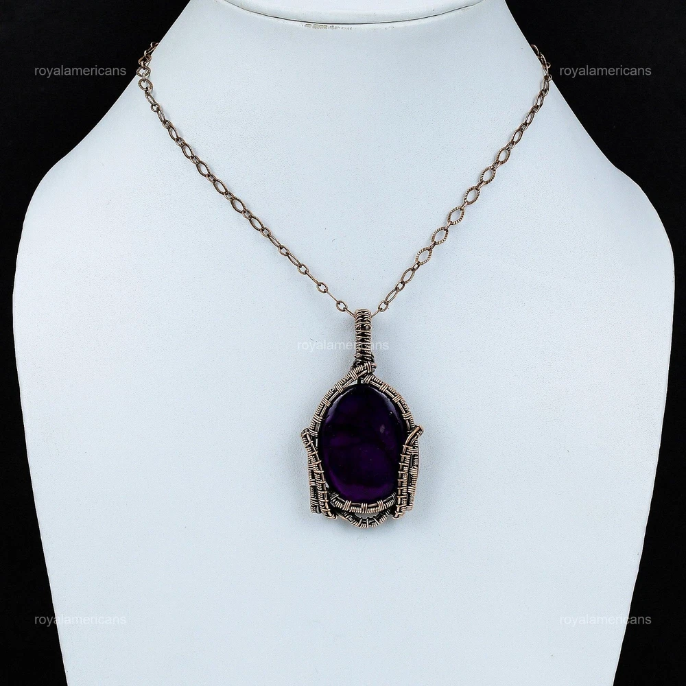 Note : Due to the natural formation of this gemstone. Slight variation in design and color are to be expected. Welcome to Royalamericans Mothers day Sale Copper Purple Fire Labradorite Stone Sister Engagement Pendant Handmade Pendant, Wire Wrapped Pendant, Wire Wrapped Jewelry, Copper Pendant, Copper Wire Pendant, Wrapped Jewelry, Wire Wrap Pendant, Wire Wrap Jewelry SKU : UFWP-2424 Gemstone : Purple Fire Labradorite Stone Shape : Oval Metal Purity : Unknown Copper Length : 64 Millimeters Width : 35 Millimeters Copper has been used for jewelry making for thousands of years, dating back to ancient civilizations such as the Egyptians, Romans, and Aztecs. Copper was valued for its beauty, versatility, and durability, and was often used to make everything from jewelry and coins to cookware and tools. In addition to its historical significance, copper jewelry also offers several benefits. Copper is a natural conductor of heat and electricity, which makes it ideal for energy healing and therapeutic purposes. Wearing copper jewelry is believed to have various health benefits, such as improving circulation, reducing inflammation, and boosting the immune system. Some people also believe that copper jewelry has the ability to balance energy and improve mood. For Mother's Day Gift For Father's Day Gift For Promise For Valentine's Day For Halloween Party For Christmas Day Gift For New Year Party For Mom For Her If you can't find the information you need or need some advice for your design? Feel free to contact us. We are fast to reply :) All our work is made by hand with Love and Care in our workshop Thank you so much for visiting and hope you enjoy shopping with us Royalamericans is committed to delivering the best quality sterling silver jewelry to customers. As a handmade jewelry manufacturer, we offer an extensive selection of copper gemstone jewelry that showcases the brilliance of our craftsmanship. We are an experienced handmade jewelry supplier with expertise in embellishing gemstones to suit every style. We offer you the liberty to create your jewelry ensemble with sparkling, earthy, and pure gemstones. Our Talented artisans masterfully handcraft each piece of jewelry you see here. Our pieces are made with genuine gemstones.