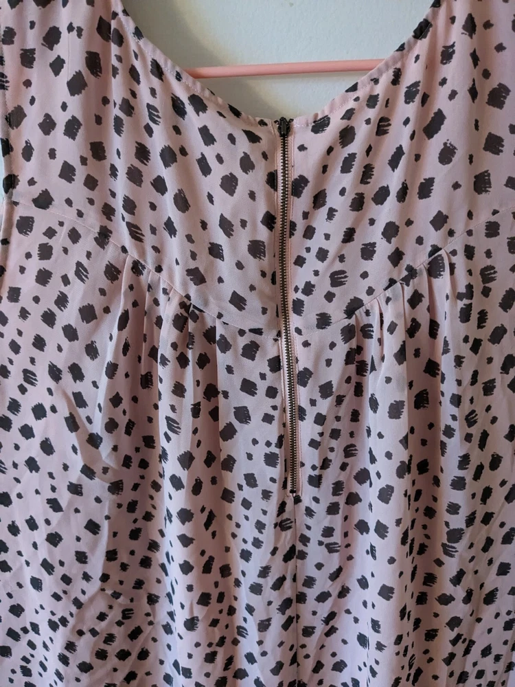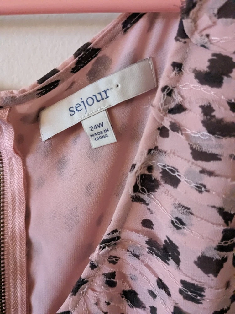 This Sejour blouse in size 24W features a striking soft pink sheer background with a gray & brown animal print, a V-neckline, and a sleeveless design. It also has a 10" zipper for closure. The relaxed fit and 100% polyester material make it comfortable for any occasion, including travel, party/cocktail, casual, workwear, or business. The blouse is perfect for spring and summer and would be a great addition to any wardrobe. It has a basic style with a fun animal print theme, and it is not considered vintage. The brand is Sejour, and it is a plus size top. Get ready to turn heads with this fabulous blouse! Fully lined. Front is textured. Back is gathered. Underarm to Underarm 27" Length 29"