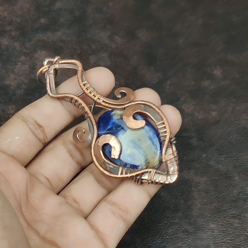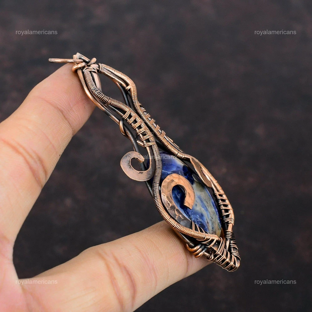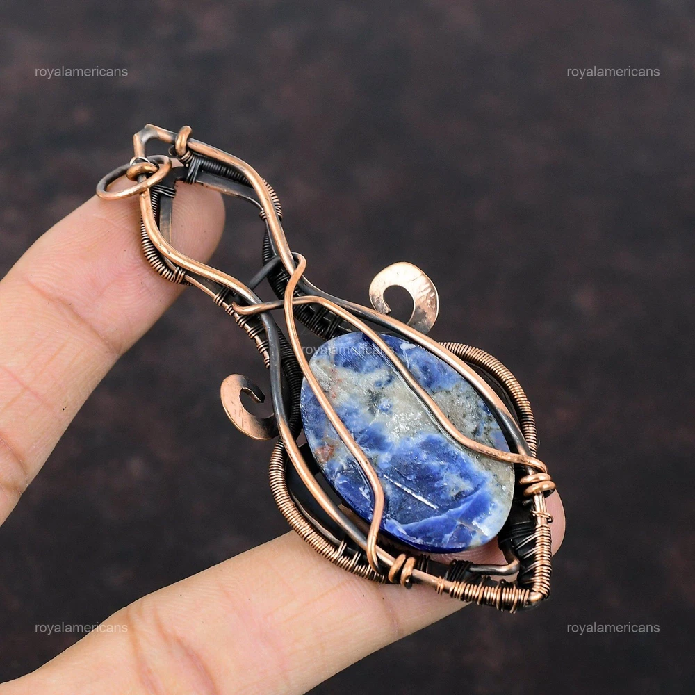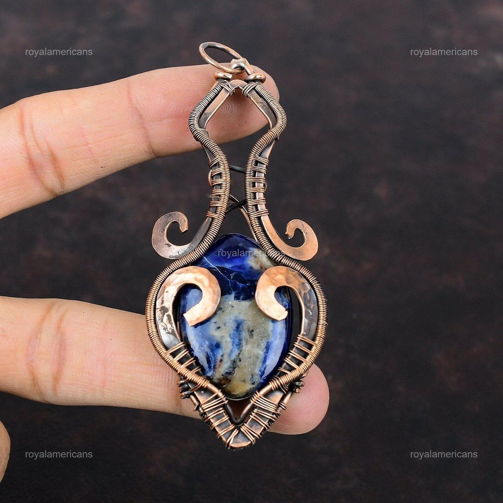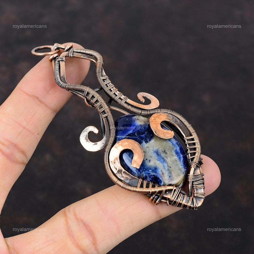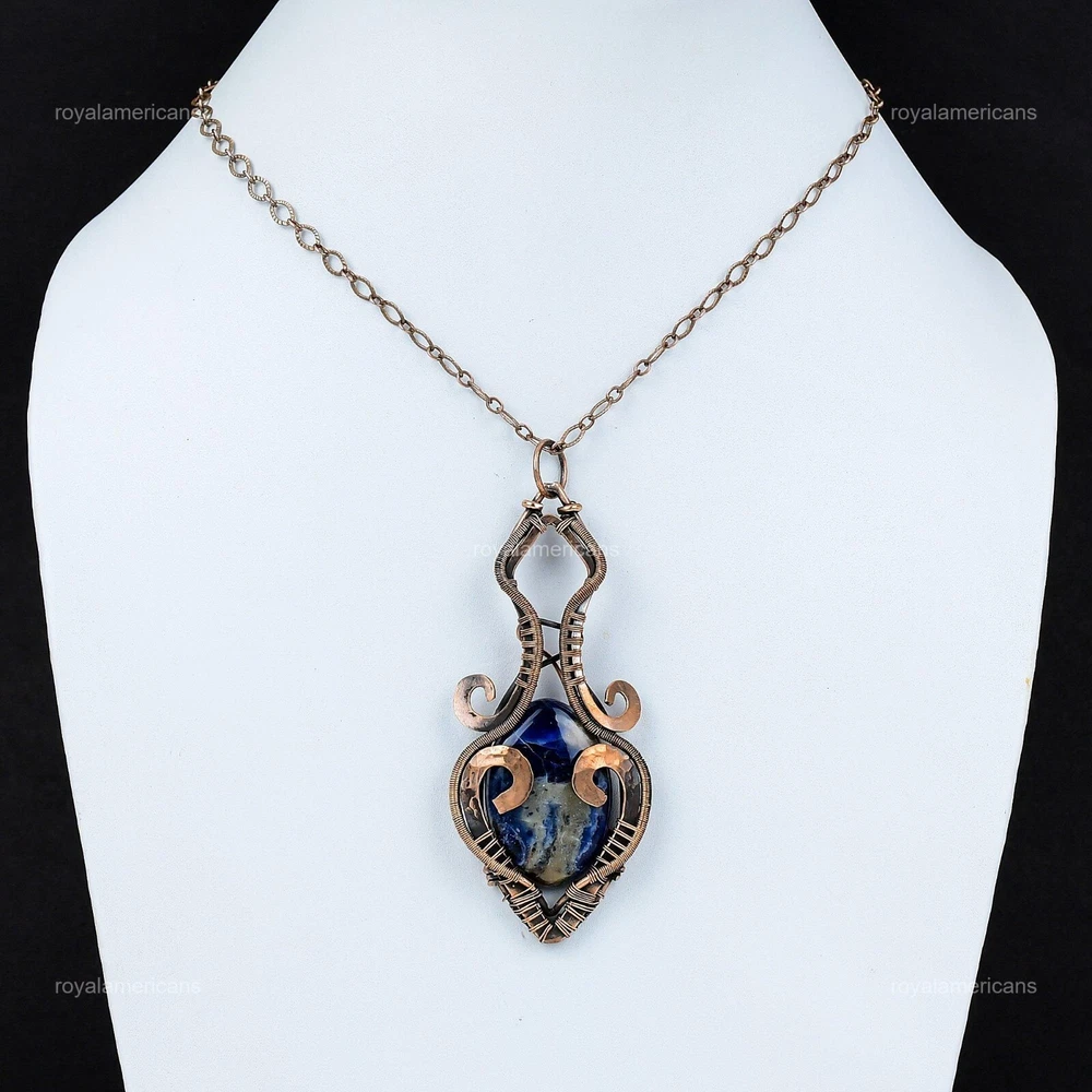 Note : Due to the natural formation of this gemstone. Slight variation in design and color are to be expected. Welcome to Royalamericans Mothers day Sale Sodalite Stone Wire Wrap Confirmation/Communion Pendant Copper Handmade Pendant, Wire Wrapped Pendant, Wire Wrapped Jewelry, Copper Pendant, Copper Wire Pendant, Wrapped Jewelry, Wire Wrap Pendant, Wire Wrap Jewelry SKU : UFWP-3535 Gemstone : Sodalite Stone Shape : Oval Metal Purity : Unknown Copper Length : 92 Millimeters Width : 37 Millimeters Copper has been used for jewelry making for thousands of years, dating back to ancient civilizations such as the Egyptians, Romans, and Aztecs. Copper was valued for its beauty, versatility, and durability, and was often used to make everything from jewelry and coins to cookware and tools. In addition to its historical significance, copper jewelry also offers several benefits. Copper is a natural conductor of heat and electricity, which makes it ideal for energy healing and therapeutic purposes. Wearing copper jewelry is believed to have various health benefits, such as improving circulation, reducing inflammation, and boosting the immune system. Some people also believe that copper jewelry has the ability to balance energy and improve mood. For Mother's Day Gift For Father's Day Gift For Promise For Valentine's Day For Halloween Party For Christmas Day Gift For New Year Party For Mom For Her If you can't find the information you need or need some advice for your design? Feel free to contact us. We are fast to reply :) All our work is made by hand with Love and Care in our workshop Thank you so much for visiting and hope you enjoy shopping with us Royalamericans is committed to delivering the best quality sterling silver jewelry to customers. As a handmade jewelry manufacturer, we offer an extensive selection of copper gemstone jewelry that showcases the brilliance of our craftsmanship. We are an experienced handmade jewelry supplier with expertise in embellishing gemstones to suit every style. We offer you the liberty to create your jewelry ensemble with sparkling, earthy, and pure gemstones. Our Talented artisans masterfully handcraft each piece of jewelry you see here. Our pieces are made with genuine gemstones.
