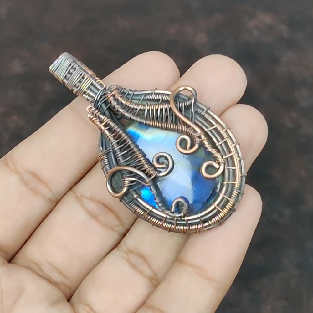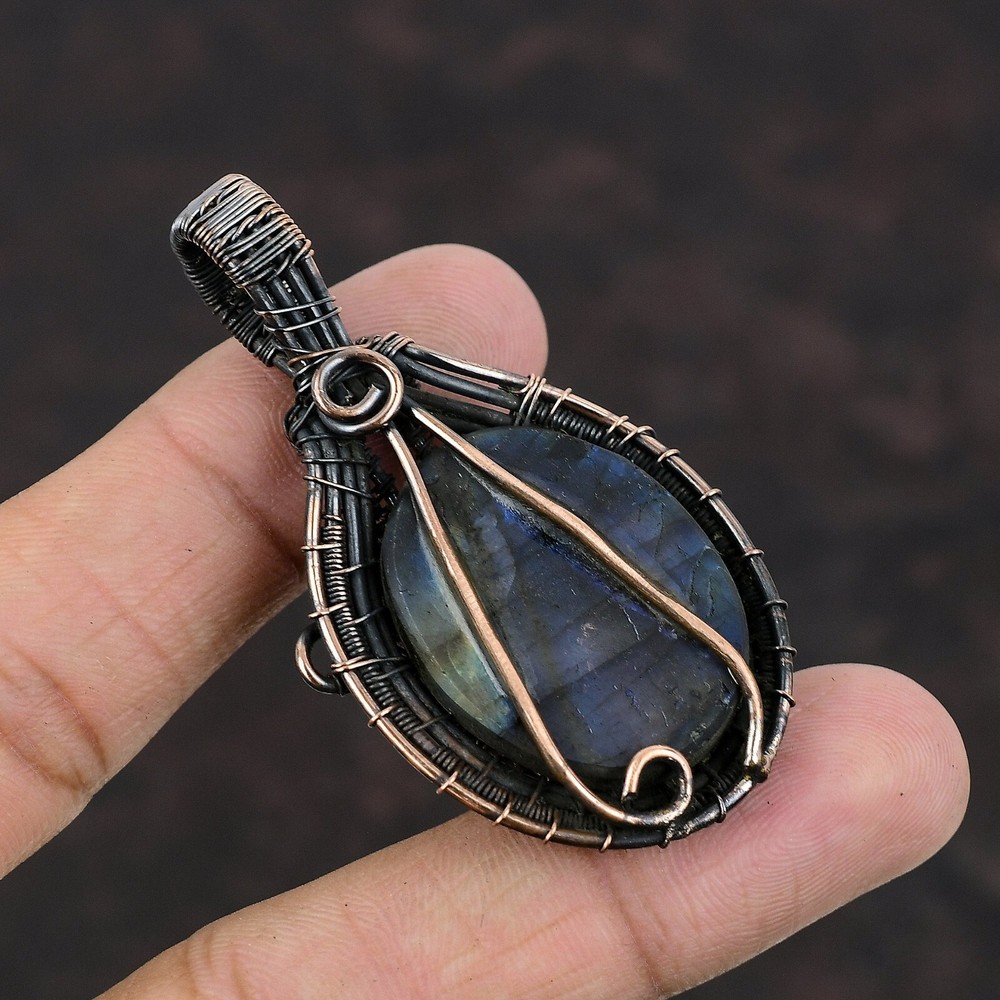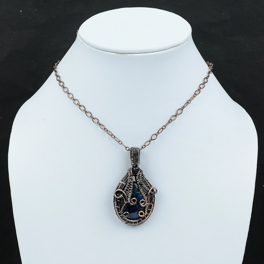 Note : Due to the natural formation of this gemstone. Slight variation in design and color are to be expected. Welcome to Silver Creation Mothers day Deal Copper Natural Labradorite Wire Wrapped Artisan Pendant Jewelry Handmade Pendant, Wire Wrapped Pendant, Wire Wrapped Jewelry, Copper Pendant, Copper Wire Pendant, Wrapped Jewelry, Wire Wrap Pendant, Wire Wrap Jewelry SKU : VFWP-292 Stone Shape : Oval Metal Purity : Unknown Copper Length : 62 Millimeters Width : 32 Millimeters Copper has been used for jewelry making for thousands of years, dating back to ancient civilizations such as the Egyptians, Romans, and Aztecs. Copper was valued for its beauty, versatility, and durability, and was often used to make everything from jewelry and coins to cookware and tools. In addition to its historical significance, copper jewelry also offers several benefits. Copper is a natural conductor of heat and electricity, which makes it ideal for energy healing and therapeutic purposes. Wearing copper jewelry is believed to have various health benefits, such as improving circulation, reducing inflammation, and boosting the immune system. Some people also believe that copper jewelry has the ability to balance energy and improve mood. For Mother's Day Gift For Father's Day Gift For Promise For Valentine' Day For Halloween Party For Christmas Day Gift For New Year Party For Mom For Her If you can't find the information you need or need some advice for your design? Feel free to contact us. We are fast to reply :) All our work is made by hand with Love and Care in our workshop Thank you so much for visiting and hope you enjoy shopping with us Silvercreations is committed to delivering the best quality sterling silver jewelry to customers. As a handmade jewelry manufacturer, we offer an extensive selection of copper gemstone jewelry that showcases the brilliance of our craftsmanship. We are an experienced handmade jewelry supplier with expertise in embellishing gemstones to suit every style. We offer you the liberty to create your jewelry ensemble with sparkling, earthy, and pure gemstones. Our Talented artisans masterfully handcraft each piece of jewelry you see here. Our pieces are made with genuine gemstones.