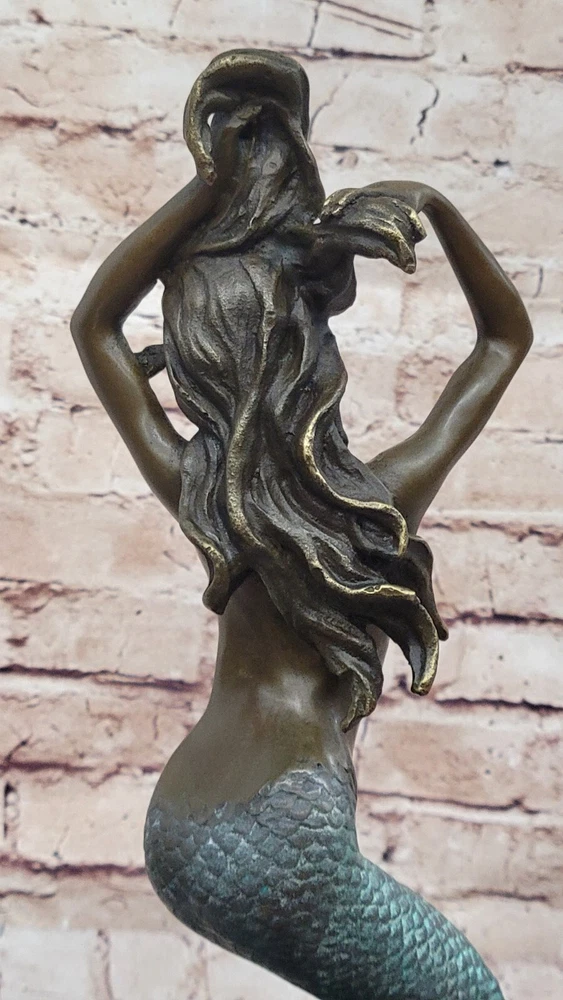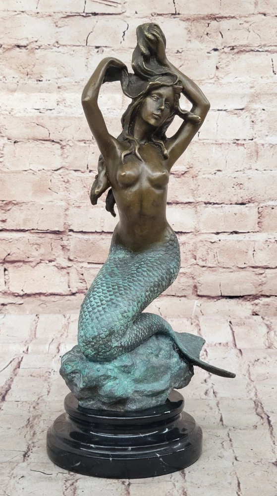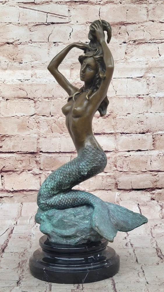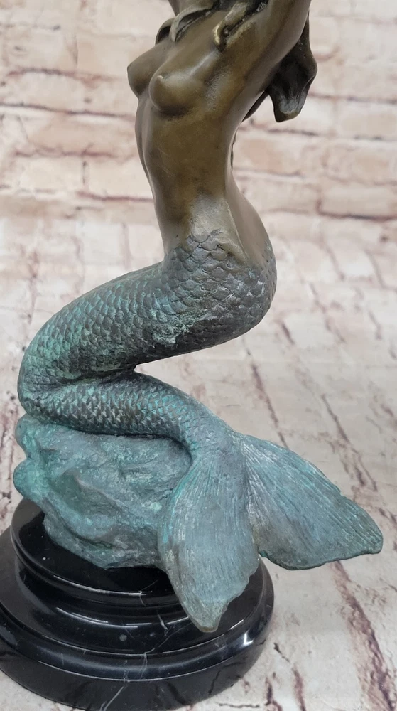 . Condition : This sculpture is in a perfect condition. Bronze Dimensions with Marble Base: Height 13 1/2" X Width 7" Marble Dimensions: Diameter 5" Height without base: 11 1/2" Weight: 10 LBS Inventory: 49XN0798C6894 Mesmerizing Mermaid Sculpture This beautiful mermaid sculpture captures the enchanting allure of the ocean's depths. Seated gracefully at the bottom of the ocean floor, the mermaid's exquisitely detailed fish tail, coated in a dark green patina, curls beneath her. Her arms are elegantly raised as she rearranges her long hair, which flows freely with the water's currents. The mermaid's expression, with her knitted brow, draws the beholder into the mysticism of her underwater kingdom, evoking a sense of wonder and fascination. Intricate Craftsmanship and Detail The sculpture is a stunning example of craftsmanship, with intricate detailing that brings the mermaid to life. The artist has skillfully captured the fluidity and grace of the mermaid's form, from the scales of her tail to the gentle movement of her hair. The use of a brown and green patina finish adds depth and texture, enhancing the realism of the skin tones and the overall appearance of the sculpture. This finish not only preserves the piece but also adds a rich, timeless quality to the artwork. Signature and Presentation This handmade bronze sculpture was created using the age-old method of lost-wax casting, ensuring a high level of detail and quality. It is mounted upon a black variegated marble base, which provides a sturdy and elegant foundation for the piece. The sculpture is signed by the artist Harriet, guaranteeing its authenticity and making it a valuable addition to any art collection. This mesmerizing mermaid sculpture is perfect for anyone who appreciates the beauty and mystery of the ocean, bringing a touch of fantasy and elegance to any space. Signed Original Harriet Gilt Nude Sexy Mermaid Bronze Sculpture Marble Statue www.bronzhaus.com Video will open in a new window Using the eBay App? Paste link into a browser window: [isdntekvideo]