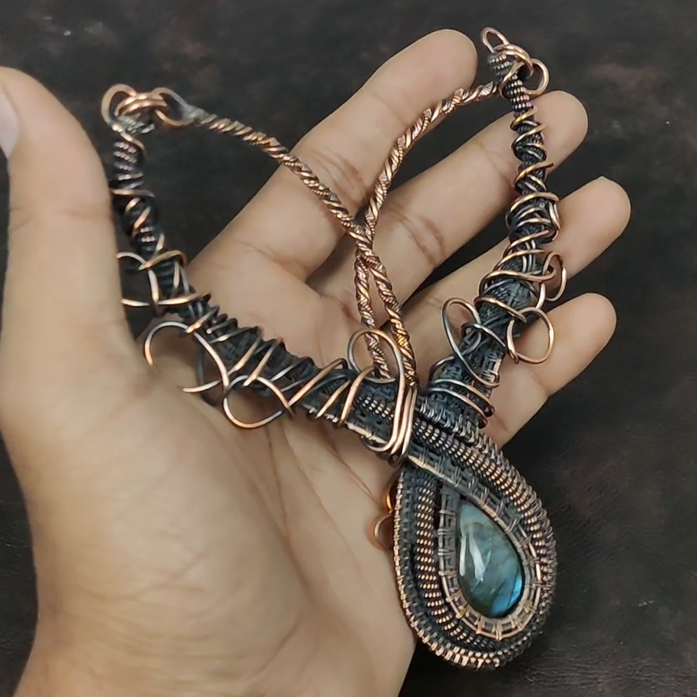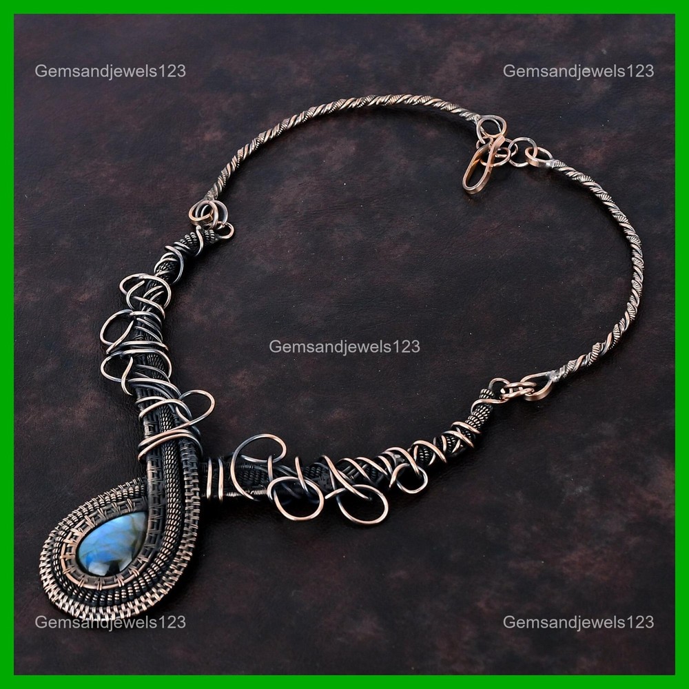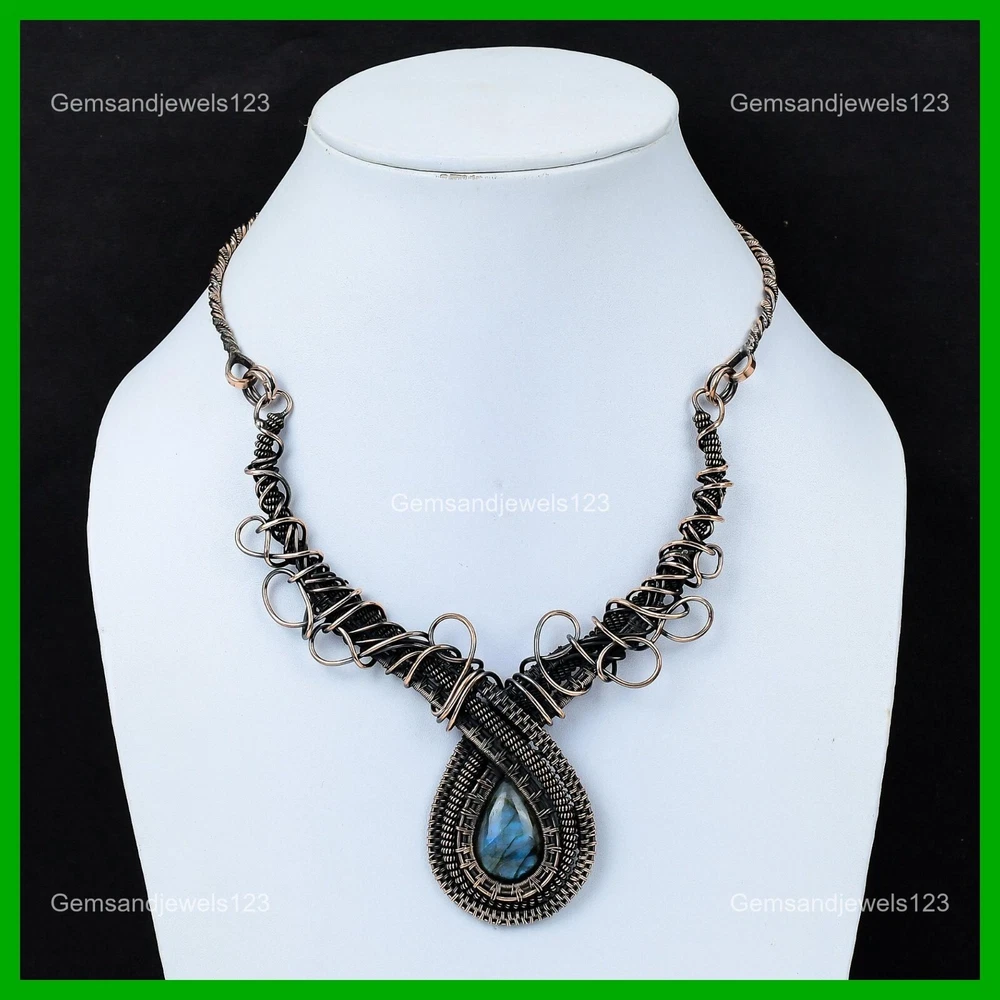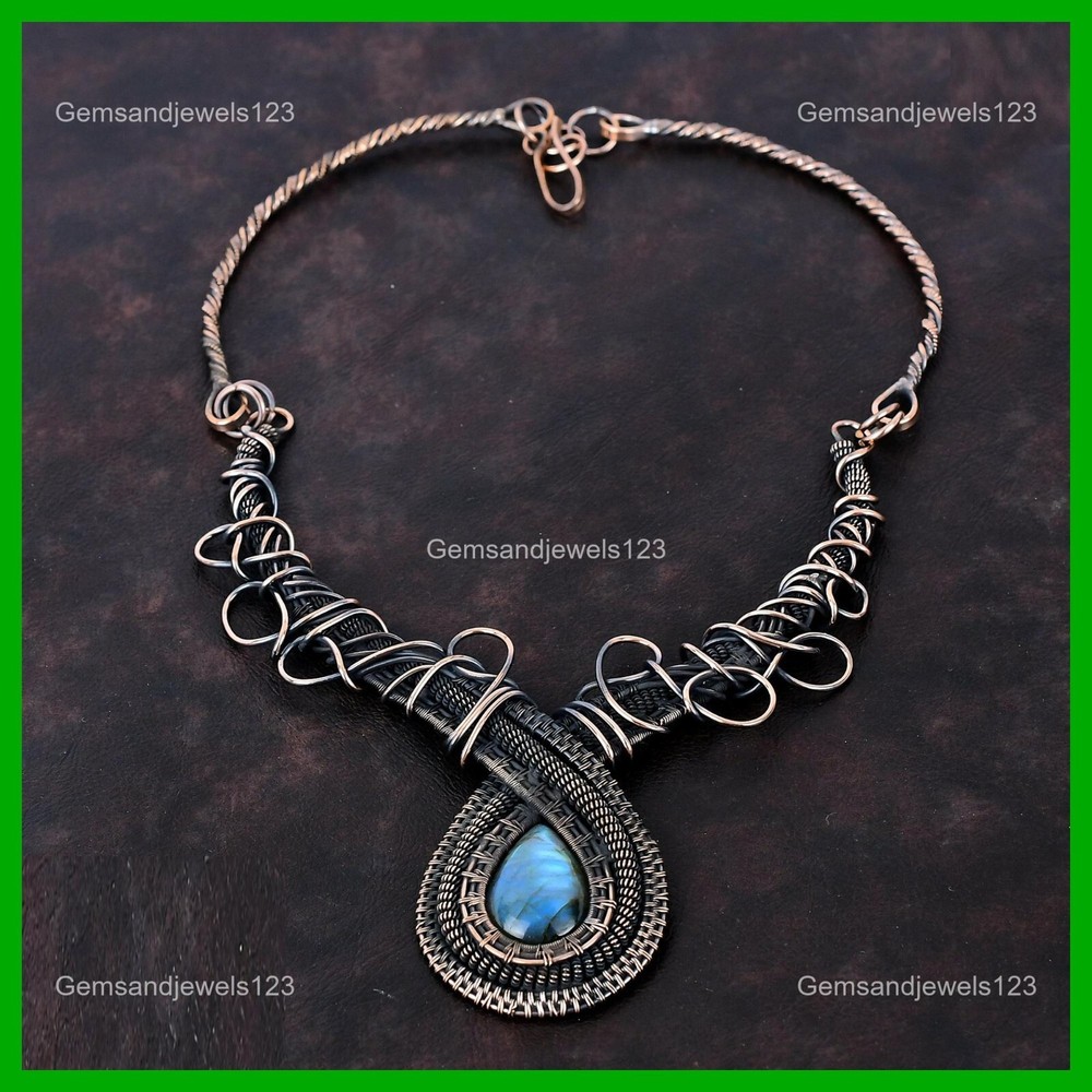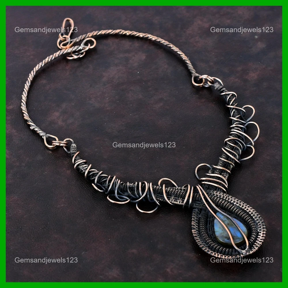 Note : Due to the natural formation of this gemstone. Slight Variation in design and color are to be expected. Welcome to gemsandjewels123 Mothers day Deal Pear Natural Labradorite Copper New Chain Wire Wrapped Necklace Handmade Necklace, Wire Wrapped Necklace, Wire Wrapped Jewelry, Copper Pendant, Copper Wire Necklace, Wrapped Jewelry, Wire Wrap Necklace, Wire Wrap Jewelry SKU : VFWN-255 Gemstone : Labradorite Stone Shape : Pear Metal Purity : Unknown Copper Length : 18 Inches Width : Inches Copper has been used for jewelry making for thousands of years, dating back to ancient civilizations such as the Egyptians, Romans, and Aztecs. Copper was valued for its beauty, versatility, and durability, and was often used to make everything from jewelry and coins to cookware and tools. In addition to its historical significance, copper jewelry also offers several benefits. Copper is a natural conductor of heat and electricity, which makes it ideal for energy healing and therapeutic purposes. Wearing copper jewelry is believed to have various health benefits, such as improving circulation, reducing inflammation, and boosting the immune system. Some people also believe that copper jewelry has the ability to balance energy and improve mood. For Mother's Day Gift For Father's Day Gift For Promise For Valentine's Day For Halloween Party For Christmas Day Gift For New Year Party For Mom For Her If you can't find the information you need or need some advice for your design? Feel free to contact us. We are fast to reply :) All our work is made by hand with Love and Care in our workshop Thank you so much for visiting and hope you enjoy shopping with us gemsandjewels123 is committed to delivering the best quality sterling silver jewelry to customers. As a handmade jewelry manufacturer, we offer an extensive selection of copper gemstone jewelry that showcases the brilliance of our craftsmanship. We are an experienced handmade jewelry supplier with expertise in embellishing gemstones to suit every style. We offer you the liberty to create your jewelry ensemble with sparkling, earthy, and pure gemstones. Our Talented artisans masterfully handcraft each piece of jewelry you see here. Our pieces are made with genuine gemstones. The one-of-a-kind piece you see here is the same exact piece you will receive.