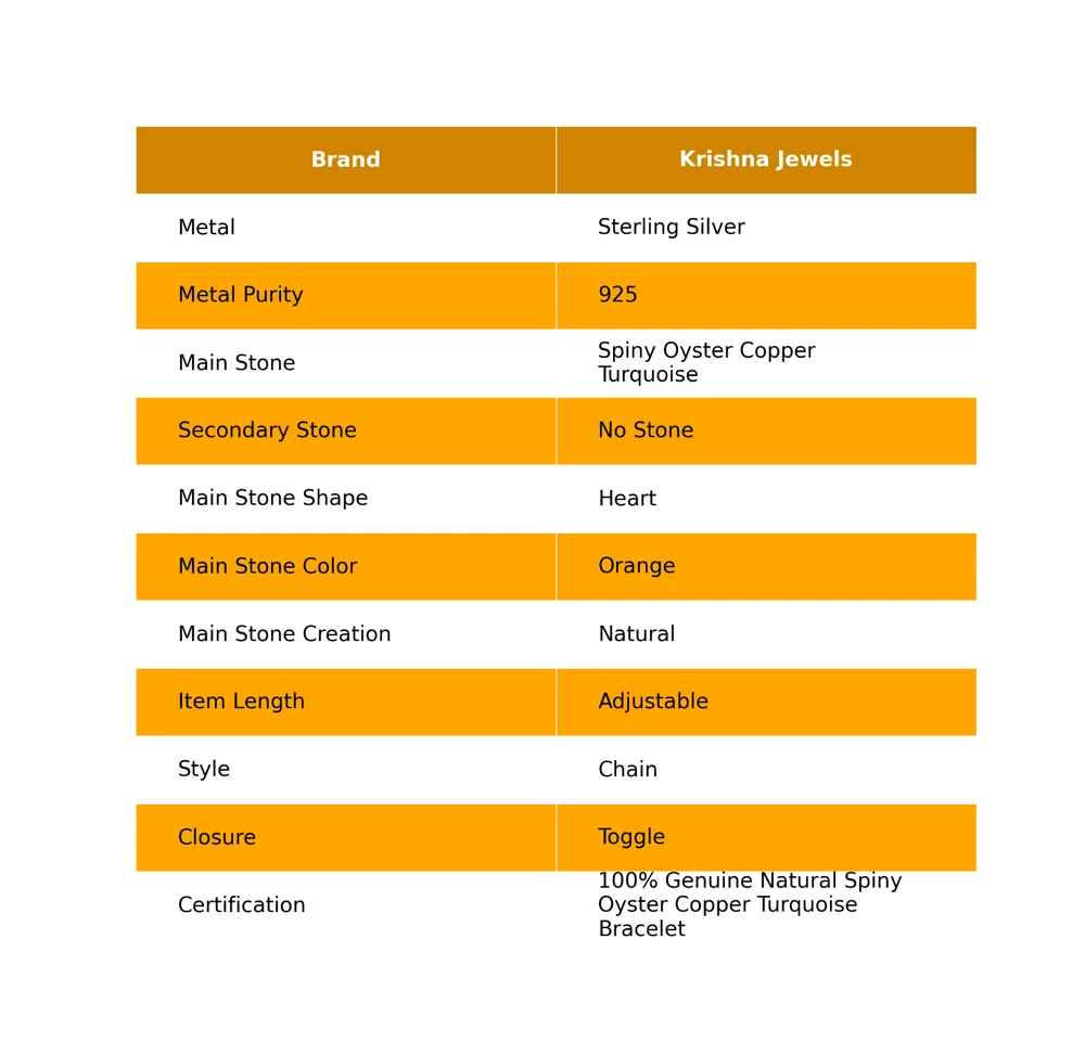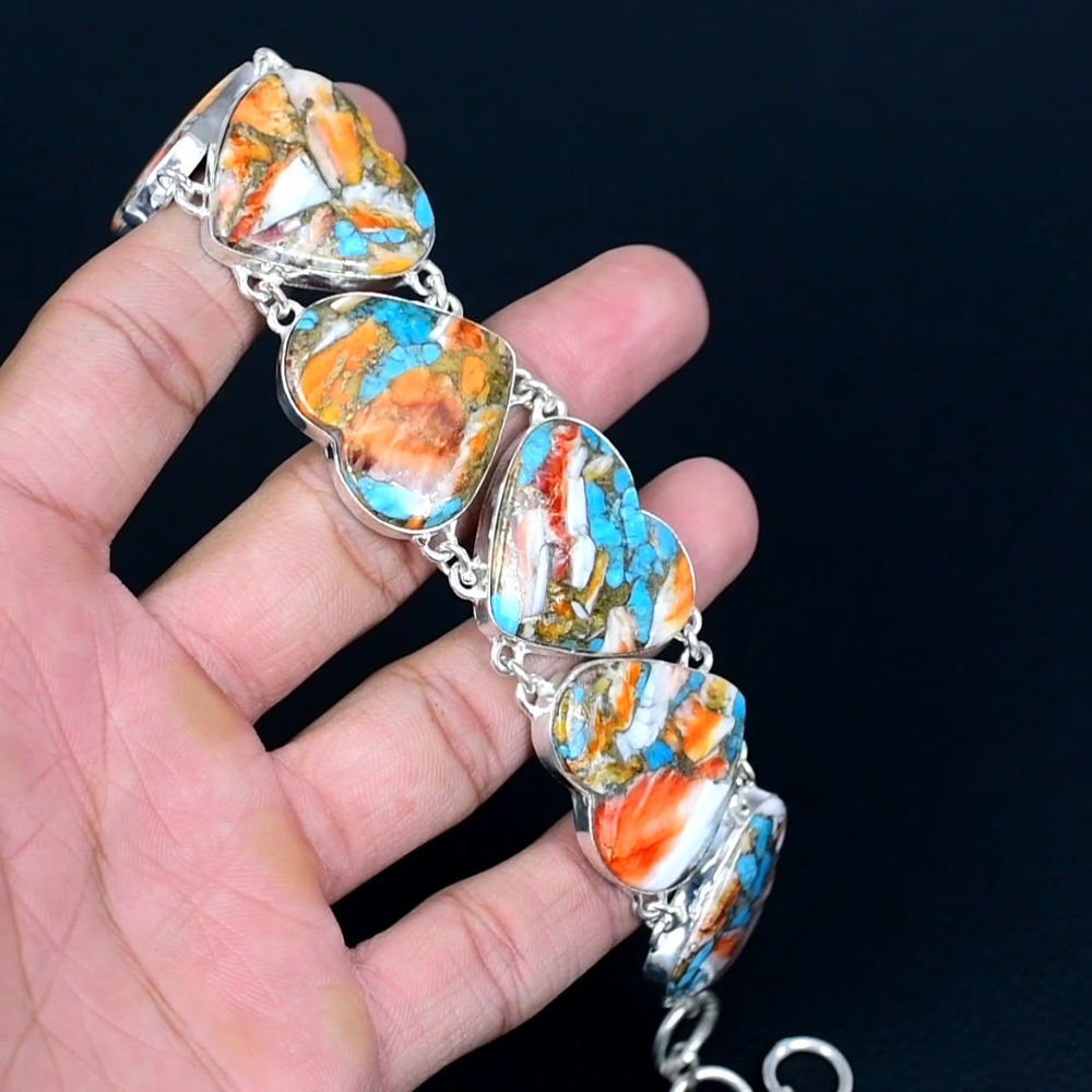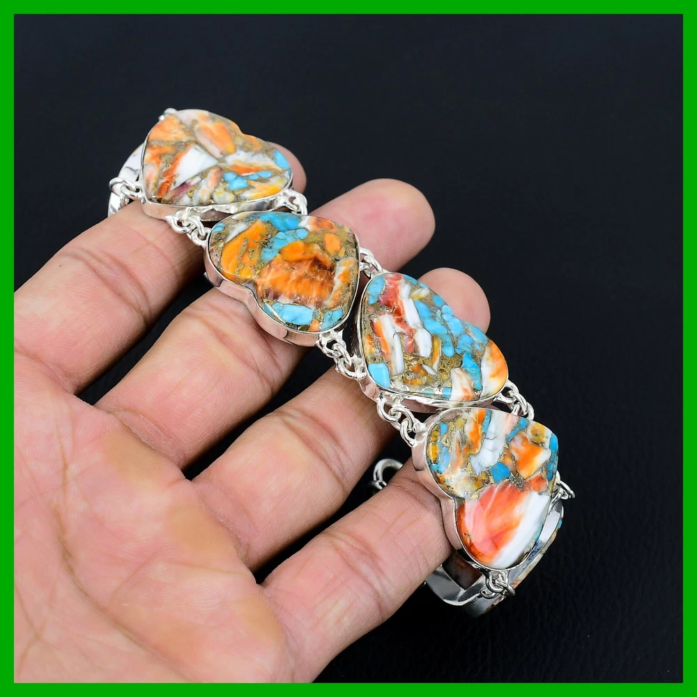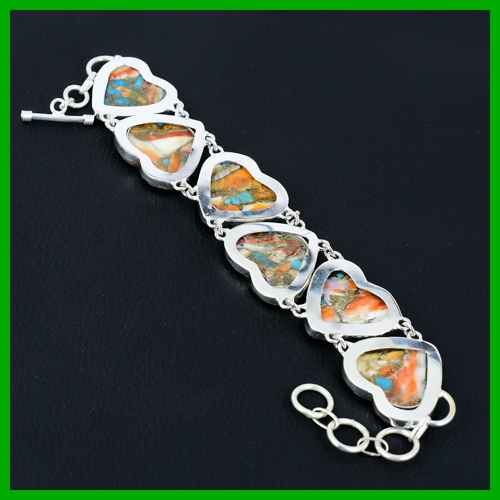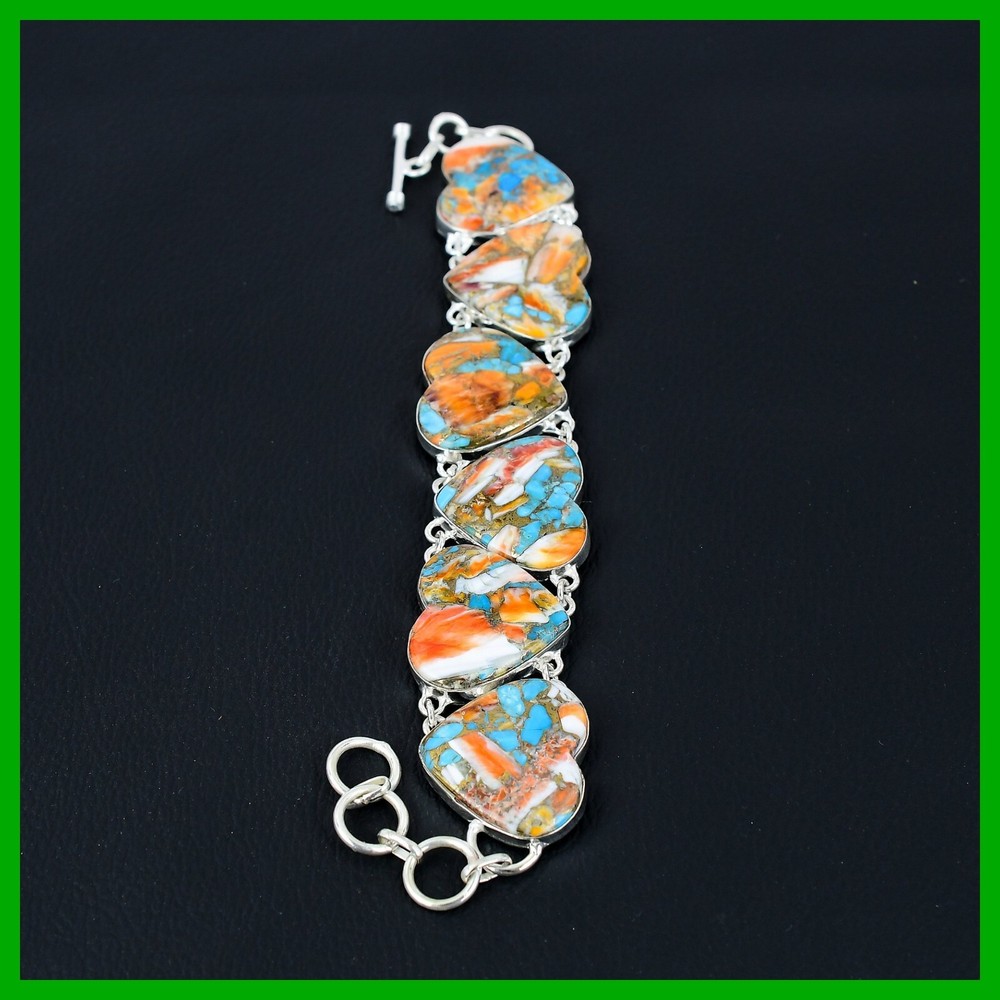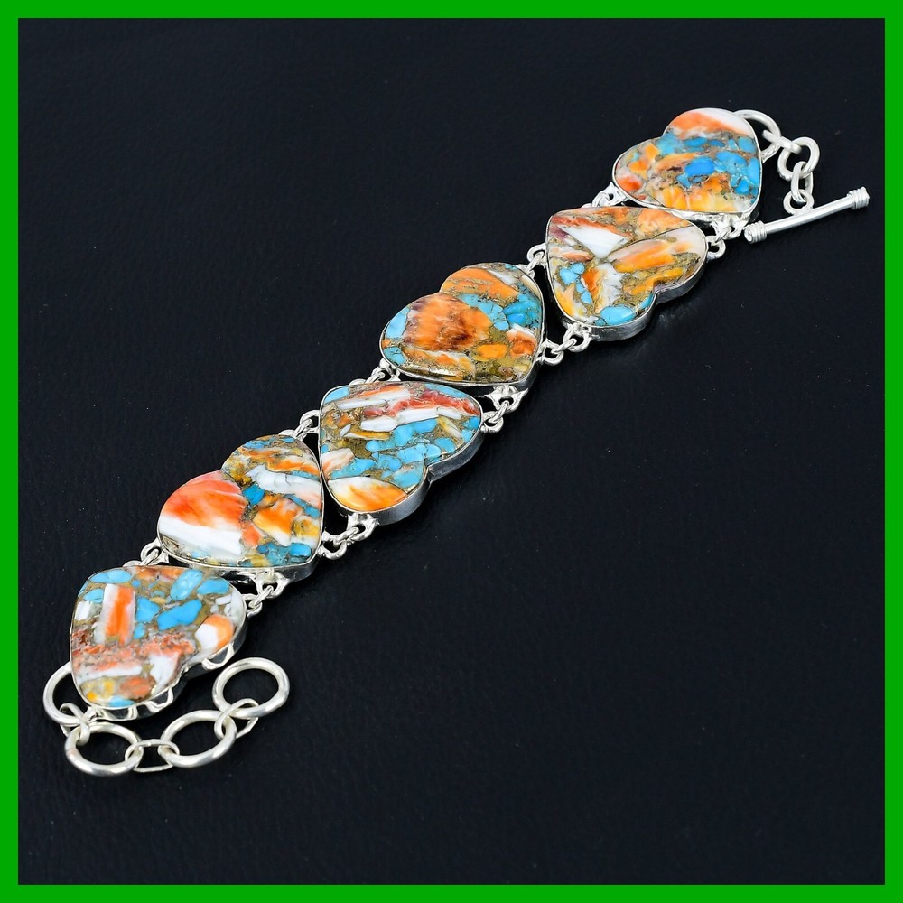 Charm Type: Traditional Antique: No Vintage: No Gemstone Clarity Grade: Eye Clean Wholesale: Yes Signed: Yes Color: Silver Secondary Stone: No Stone Material: Crystal, Gemstone, Stone, Metal Main Stone Creation: Natural Cut Grade: Excellent Setting Style: Bezel Metal Purity: 925 Occasion: Anniversary, Birthday, Christmas, Engagement, Graduation, Mother's Day, Valentine's Day, Wedding, Christening, Confirmation/Communion Seller Warranty: Yes Era: Undated Style: Chain Main Stone Shape: Heart Number of Gemstones: As Seen in Picture Type: Bracelet Seller Notes: “Handcrafted Sterling Silver Gemstone Bracelet Jewelry” Country/Region of Manufacture: India Main Stone Treatment: Not Enhanced Closure: Toggle Customized: No Colored Diamond Intensity: Not Applicable Brand: Unbranded Theme: Beauty, Bohemian, Ethnic, Healing, Love, Luck, Special Occasion, Halo, Love & Hearts Diamond Color Grade: Not Applicable Main Stone Color: Orange Country of Origin: India Certification: 100% Genuine Natural Spiny Oyster Copper Turquoise Bracelet Sizable: Yes Number of Diamonds: As Seen in Picture Base Metal: Silver Item Length: Adjustable Diamond Clarity Grade: Not Applicable Total Carat Weight: Above 10 gm Features: Engraved, Nickel-Free, Handcrafted Main Stone: Spiny Oyster Copper Turquoise Metal: Sterling Silver