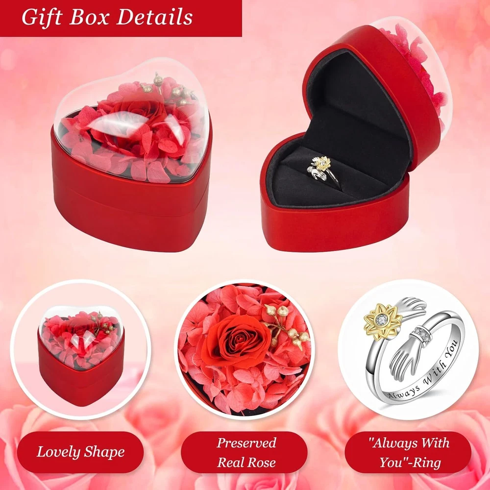 Free eBay listing template designed by dewiso.com Preserved Real Rose Ring Box, Eternal Rose for Wife Girlfriend Mom, Flower Real Rose Gift Decor for Christmas Wedding Anniversary FREE AND FAST SHIPPING! 100% Preserve Roses: Romantic roses are made from 100% real fresh roses. The roses are perfectly preserved to be as naturally fresh as the day they were picked, no watering or special care required. The roses can stay fresh for 3-5 years or even longer. Engraved Ring Rose Box: As a beautiful gift for her. You can express your eternal love for her with our Eternal Rose ring box, symbolizing embracing and loving her. Includes pink roses and a silver ring engraved with "Always With You". Adjustable silver ring fits any pair of beautiful hands. Preserved Rose Ring Box: Surprise your loved one with preserved pink real rose and a sparkling ring that will hold memories for years to come. The beautifully packaged ring gift box is an exquisite and luxurious gift, the bottom lining is made of high quality velvet, it can also store other jewelry or rings, you will have a beautiful jewelry box gift for her. Valentines Day Gifts for Her: Fresh roses symbolize everlasting true love, gratitude and care. It can be a wedding anniversary gift for wives and girlfriends or a birthday gift for moms and daughters. Suitable for Many Festivals: Fresh preserved roses with ring is a creative gift and best choice for Christmas, Valentine's Day, anniversary and birthday. It symbolizes the love, affection and friendship between you and her. Product We offer a 30-Day Return Policy on items which you are not completely satisfied with. You have the option for a full-refund or an exchange of the item. No returns are available on items shipped outside of the US . Shipping We offer Free Shipping to the US and ship within 2 business days of payment, usually sooner. We use UPS express shipping. That's why your products are usually delivered within 3 days . Contact We try our very best to make sure every customer is completely satisfied. If there's a problem , message us! We're happy to help. 24/7 live chat available.