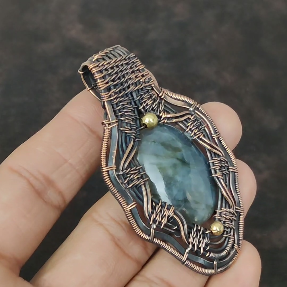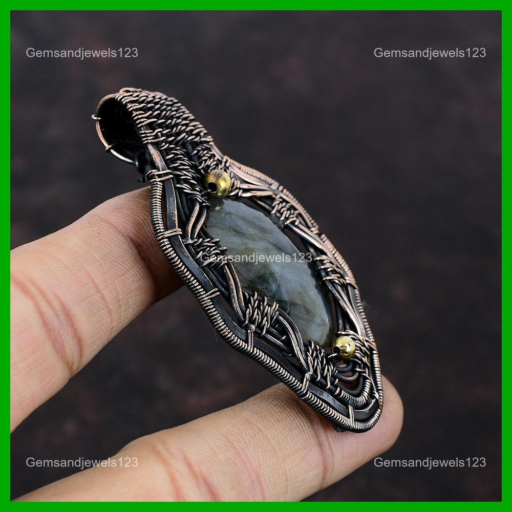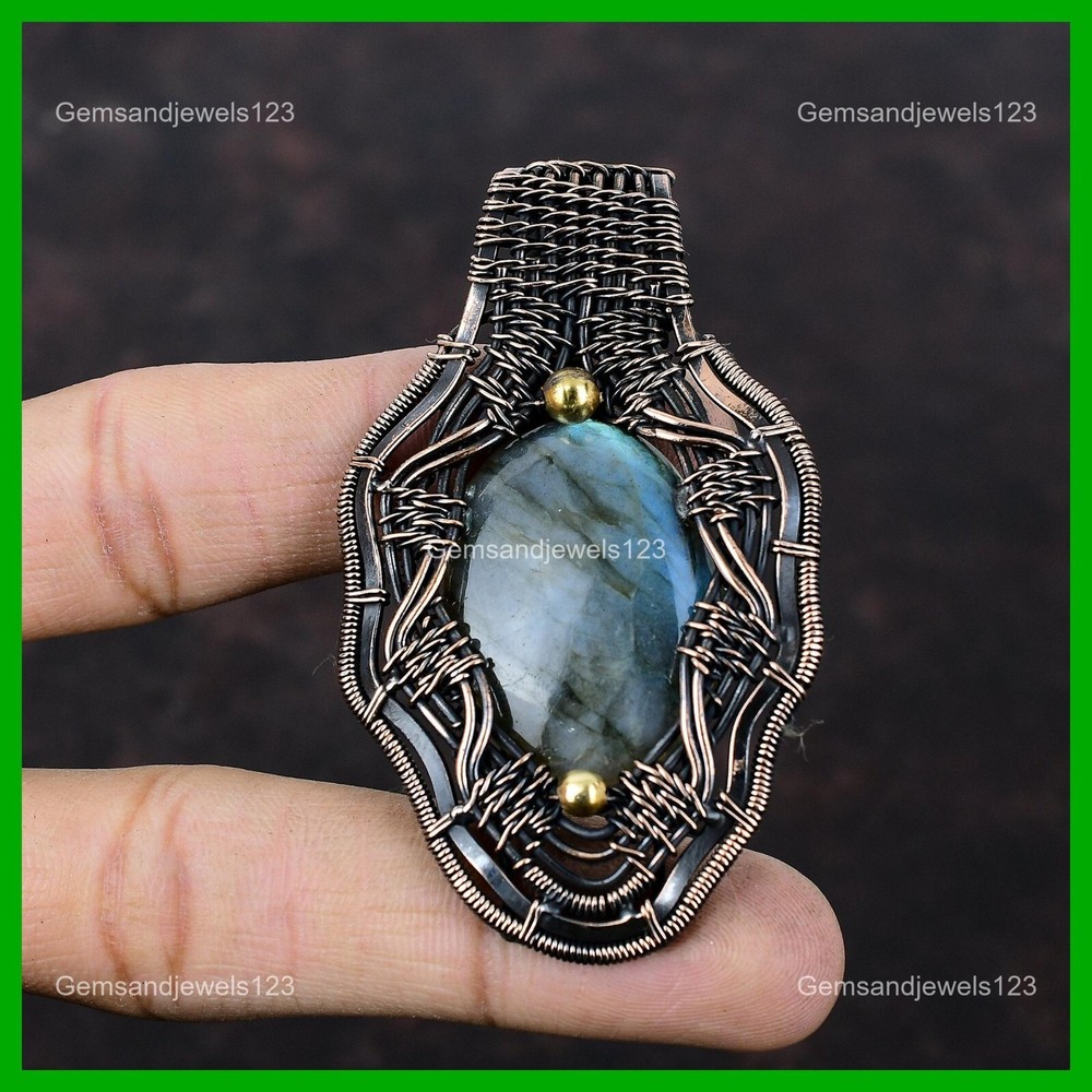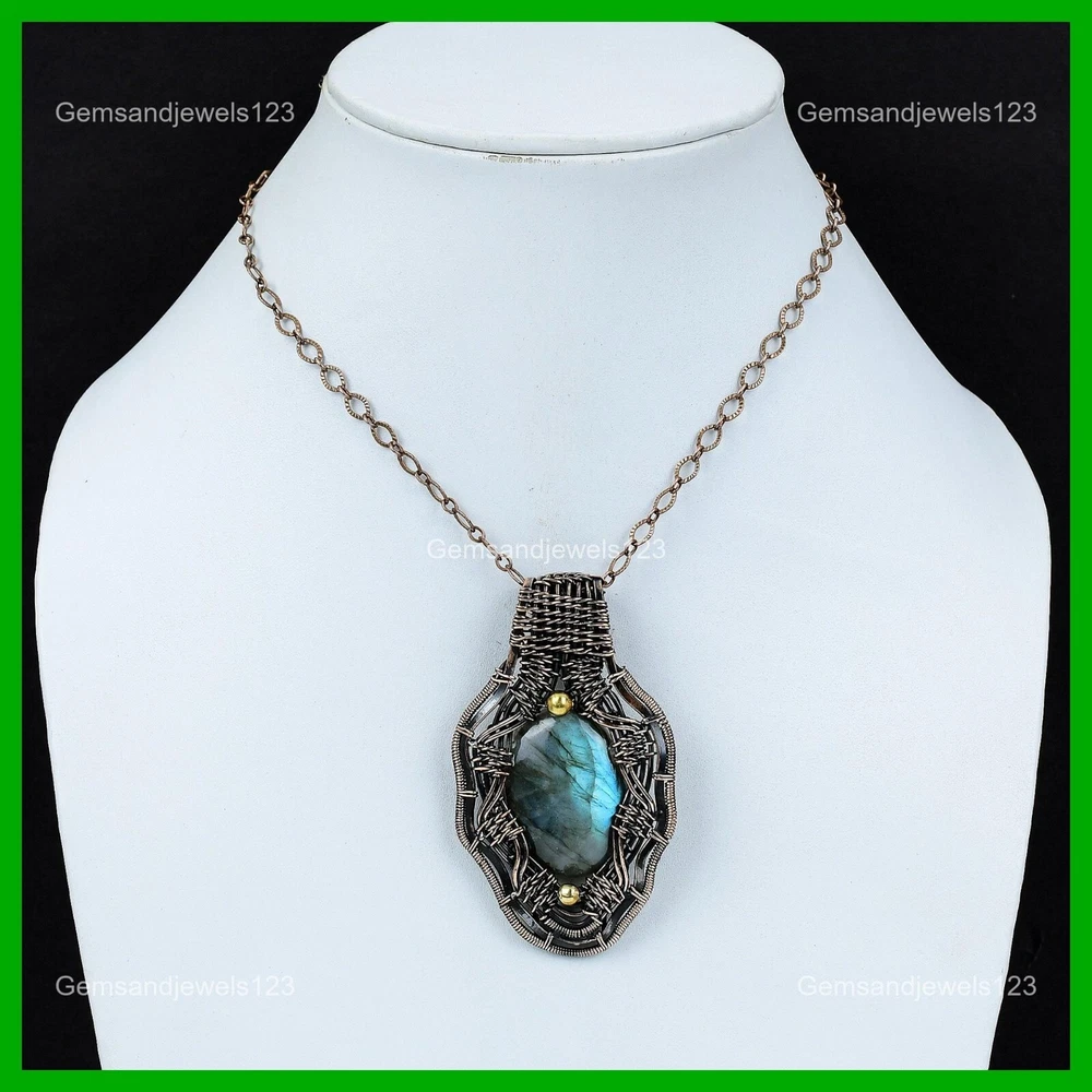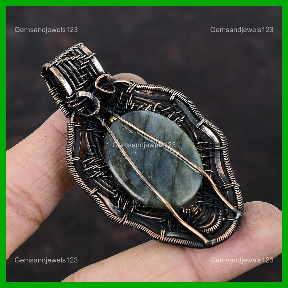 Note : Due to the natural formation of this gemstone. Slight Variation in design and color are to be expected. Welcome to gemsandjewels123 Mothers day Deal Copper Natural Labradorite Unique Wire Wrapped Pendant Jewelry Handmade Pendant, Wire Wrapped Pendant, Wire Wrapped Jewelry, Copper Pendant, Copper Wire Pendant, Wrapped Jewelry, Wire Wrap Pendant, Wire Wrap Jewelry SKU : VFWP-2352 Gemstone : Labradorite Stone Shape : Oval Metal Purity : Unknown Copper Length : 73 Millimeters Width : 43 Millimeters Copper has been used for jewelry making for thousands of years, dating back to ancient civilizations such as the Egyptians, Romans, and Aztecs. Copper was valued for its beauty, versatility, and durability, and was often used to make everything from jewelry and coins to cookware and tools. In addition to its historical significance, copper jewelry also offers several benefits. Copper is a natural conductor of heat and electricity, which makes it ideal for energy healing and therapeutic purposes. Wearing copper jewelry is believed to have various health benefits, such as improving circulation, reducing inflammation, and boosting the immune system. Some people also believe that copper jewelry has the ability to balance energy and improve mood. For Mother's Day Gift For Father's Day Gift For Promise For Valentine's Day For Halloween Party For Christmas Day Gift For New Year Party For Mom For Her If you can't find the information you need or need some advice for your design? Feel free to contact us. We are fast to reply :) All our work is made by hand with Love and Care in our workshop Thank you so much for visiting and hope you enjoy shopping with us gemsandjewels123 is committed to delivering the best quality sterling silver jewelry to customers. As a handmade jewelry manufacturer, we offer an extensive selection of copper gemstone jewelry that showcases the brilliance of our craftsmanship. We are an experienced handmade jewelry supplier with expertise in embellishing gemstones to suit every style. We offer you the liberty to create your jewelry ensemble with sparkling, earthy, and pure gemstones. Our Talented artisans masterfully handcraft each piece of jewelry you see here. Our pieces are made with genuine gemstones. The one-of-a-kind piece you see here is the same exact piece you will receive.
