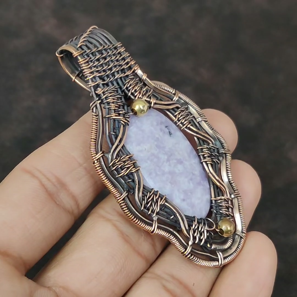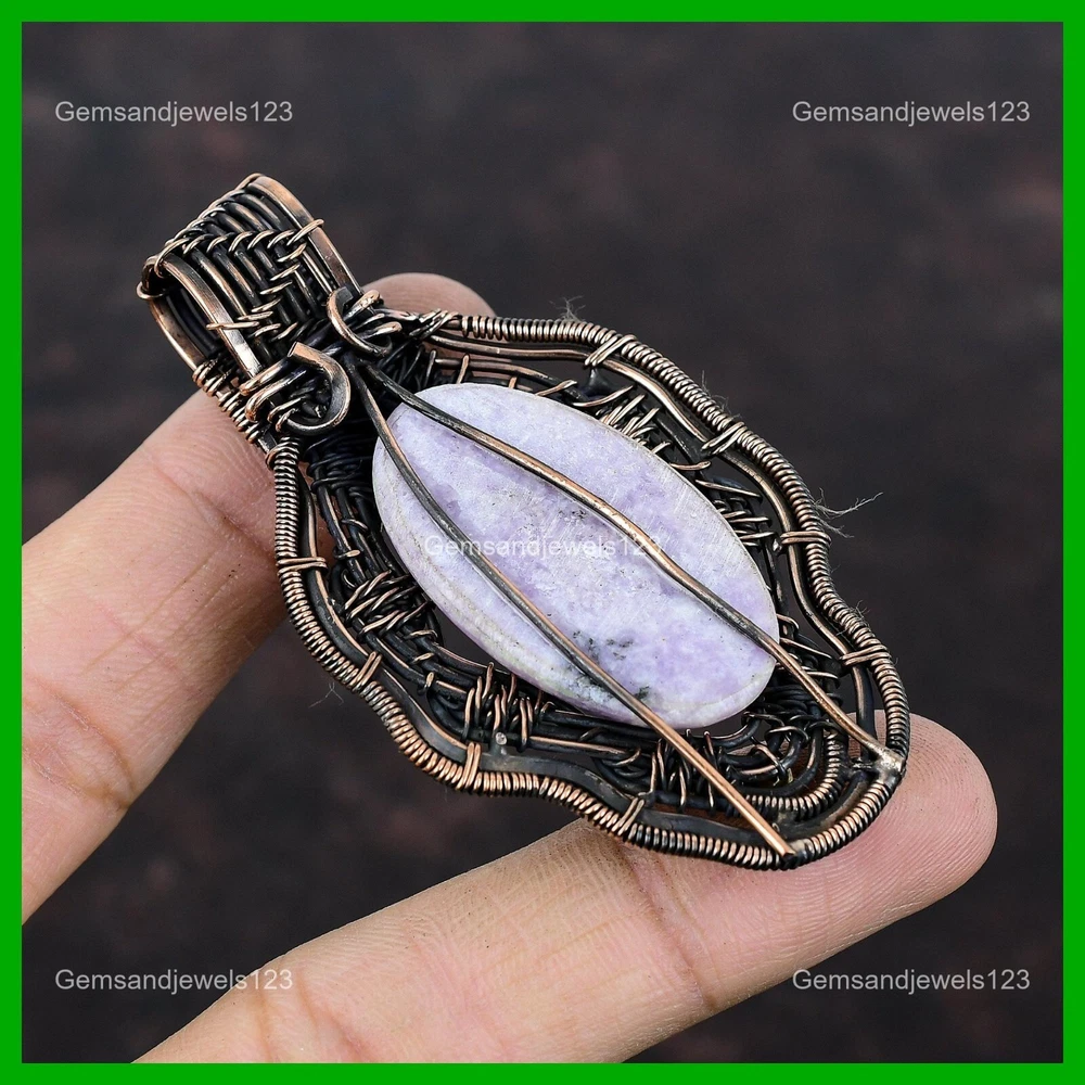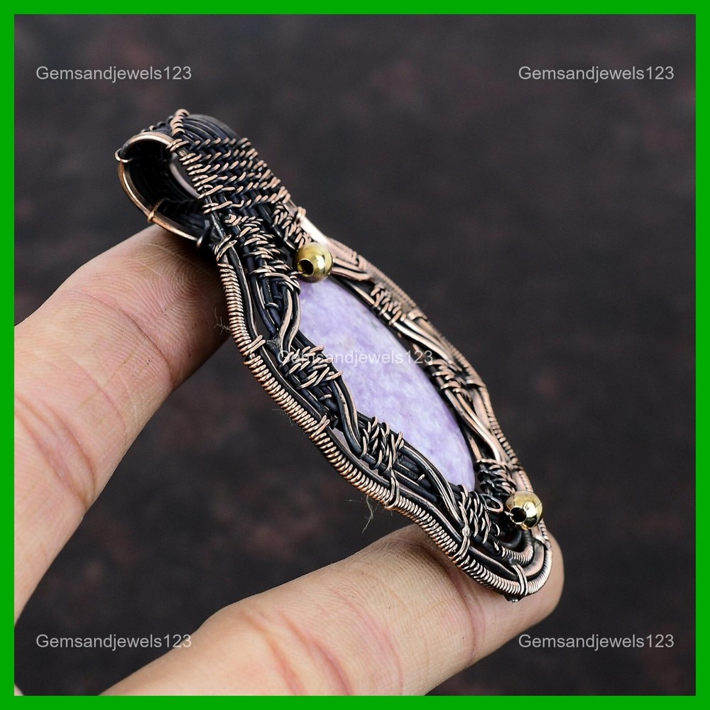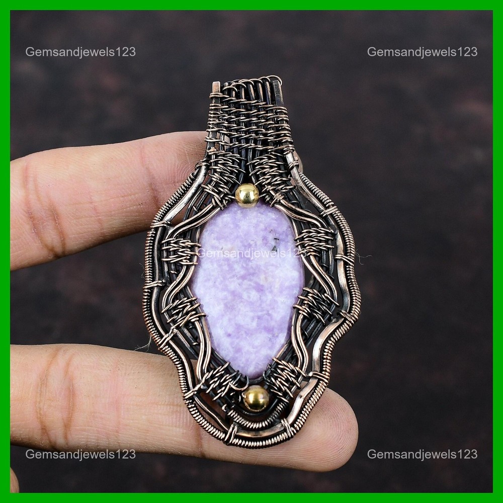 Note : Due to the natural formation of this gemstone. Slight Variation in design and color are to be expected. Welcome to gemsandjewels123 Mothers day Deal Copper Natural Lepidolite Daughter Wire Wrapped Pendant Jewelry Handmade Pendant, Wire Wrapped Pendant, Wire Wrapped Jewelry, Copper Pendant, Copper Wire Pendant, Wrapped Jewelry, Wire Wrap Pendant, Wire Wrap Jewelry SKU : VFWP-2332 Gemstone : Lepidolite Stone Shape : Oval Metal Purity : Unknown Copper Length : 75 Millimeters Width : 43 Millimeters Copper has been used for jewelry making for thousands of years, dating back to ancient civilizations such as the Egyptians, Romans, and Aztecs. Copper was valued for its beauty, versatility, and durability, and was often used to make everything from jewelry and coins to cookware and tools. In addition to its historical significance, copper jewelry also offers several benefits. Copper is a natural conductor of heat and electricity, which makes it ideal for energy healing and therapeutic purposes. Wearing copper jewelry is believed to have various health benefits, such as improving circulation, reducing inflammation, and boosting the immune system. Some people also believe that copper jewelry has the ability to balance energy and improve mood. For Mother's Day Gift For Father's Day Gift For Promise For Valentine's Day For Halloween Party For Christmas Day Gift For New Year Party For Mom For Her If you can't find the information you need or need some advice for your design? Feel free to contact us. We are fast to reply :) All our work is made by hand with Love and Care in our workshop Thank you so much for visiting and hope you enjoy shopping with us gemsandjewels123 is committed to delivering the best quality sterling silver jewelry to customers. As a handmade jewelry manufacturer, we offer an extensive selection of copper gemstone jewelry that showcases the brilliance of our craftsmanship. We are an experienced handmade jewelry supplier with expertise in embellishing gemstones to suit every style. We offer you the liberty to create your jewelry ensemble with sparkling, earthy, and pure gemstones. Our Talented artisans masterfully handcraft each piece of jewelry you see here. Our pieces are made with genuine gemstones. The one-of-a-kind piece you see here is the same exact piece you will receive.