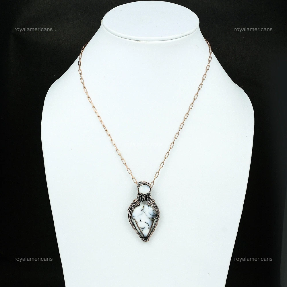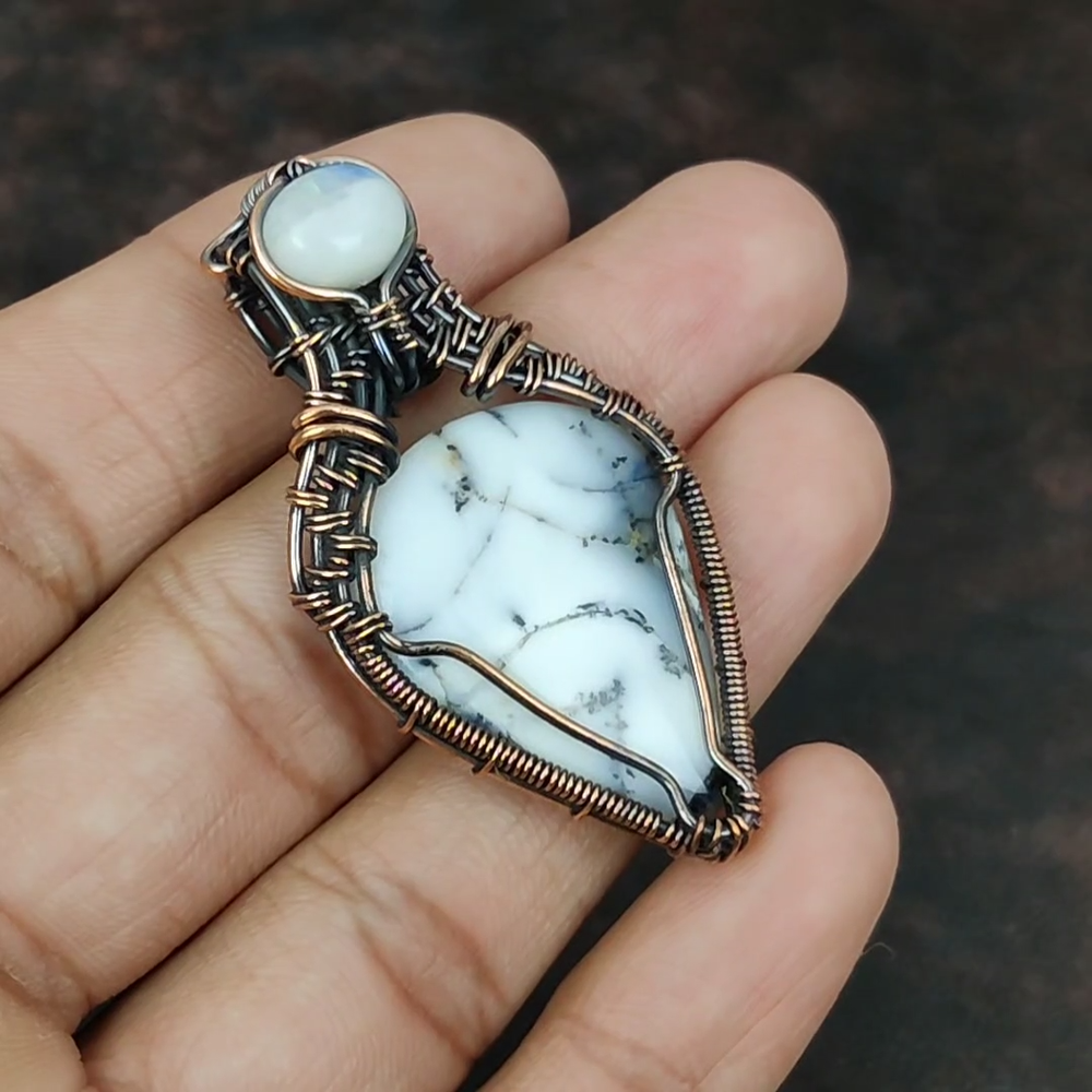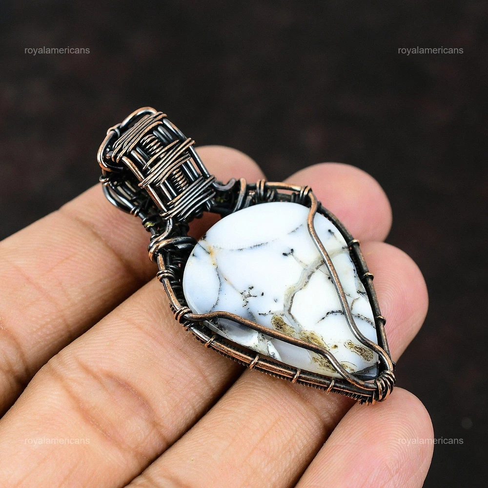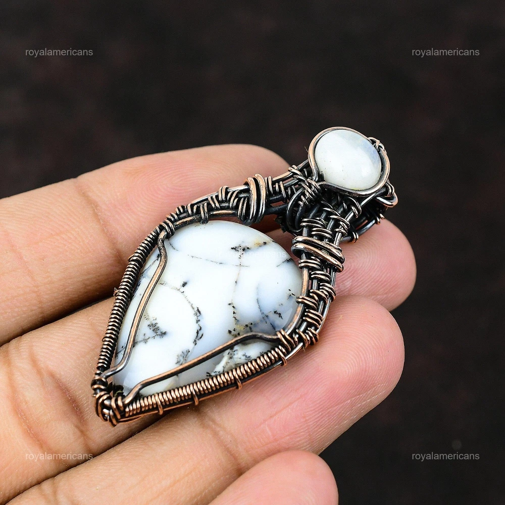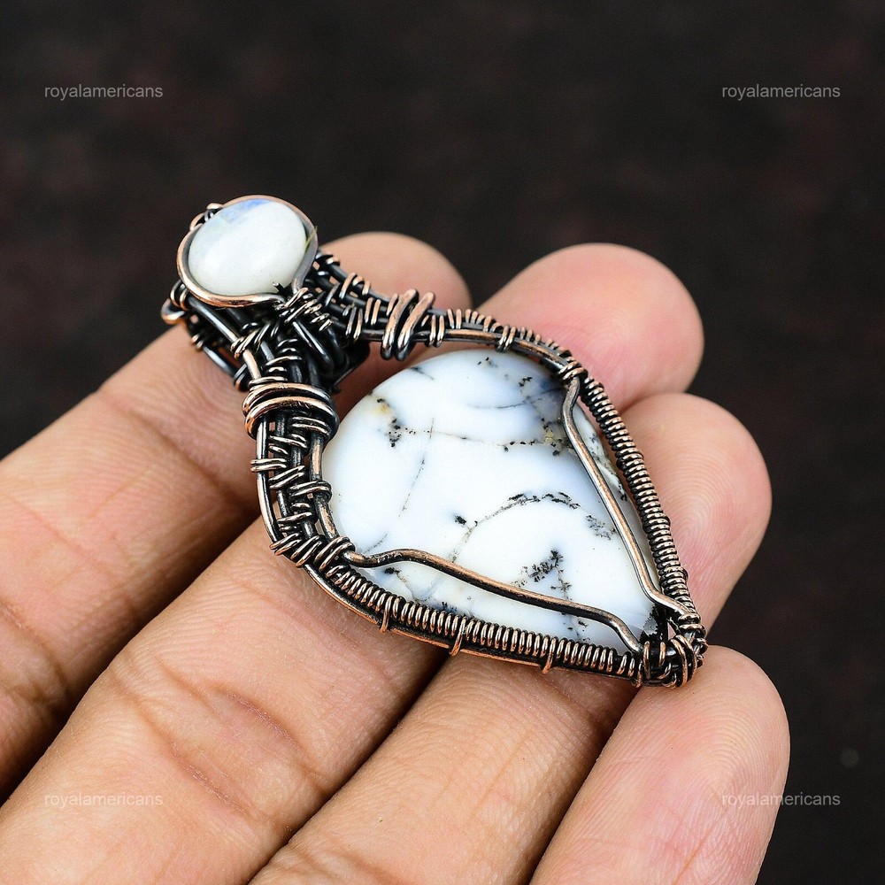 Note : Due to the natural formation of this gemstone. Slight variation in design and color are to be expected. Welcome to Royalamericans Mothers day Sale Copper Dendrite Opal Gemstone Rainbow Moonstone Wife Pendant Handmade Pendant, Wire Wrapped Pendant, Wire Wrapped Jewelry, Copper Pendant, Copper Wire Pendant, Wrapped Jewelry, Wire Wrap Pendant, Wire Wrap Jewelry SKU : UWP-73 Gemstone : Dendrite Opal Stone Shape : Pear Metal Purity : Unknown Copper Length : Millimeters Width : Millimeters Copper has been used for jewelry making for thousands of years, dating back to ancient civilizations such as the Egyptians, Romans, and Aztecs. Copper was valued for its beauty, versatility, and durability, and was often used to make everything from jewelry and coins to cookware and tools. In addition to its historical significance, copper jewelry also offers several benefits. Copper is a natural conductor of heat and electricity, which makes it ideal for energy healing and therapeutic purposes. Wearing copper jewelry is believed to have various health benefits, such as improving circulation, reducing inflammation, and boosting the immune system. Some people also believe that copper jewelry has the ability to balance energy and improve mood. For Mother's Day Gift For Father's Day Gift For Promise For Valentine's Day For Halloween Party For Christmas Day Gift For New Year Party For Mom For Her If you can't find the information you need or need some advice for your design? Feel free to contact us. We are fast to reply :) All our work is made by hand with Love and Care in our workshop Thank you so much for visiting and hope you enjoy shopping with us Royalamericans is committed to delivering the best quality sterling silver jewelry to customers. As a handmade jewelry manufacturer, we offer an extensive selection of copper gemstone jewelry that showcases the brilliance of our craftsmanship. We are an experienced handmade jewelry supplier with expertise in embellishing gemstones to suit every style. We offer you the liberty to create your jewelry ensemble with sparkling, earthy, and pure gemstones. Our Talented artisans masterfully handcraft each piece of jewelry you see here. Our pieces are made with genuine gemstones.
