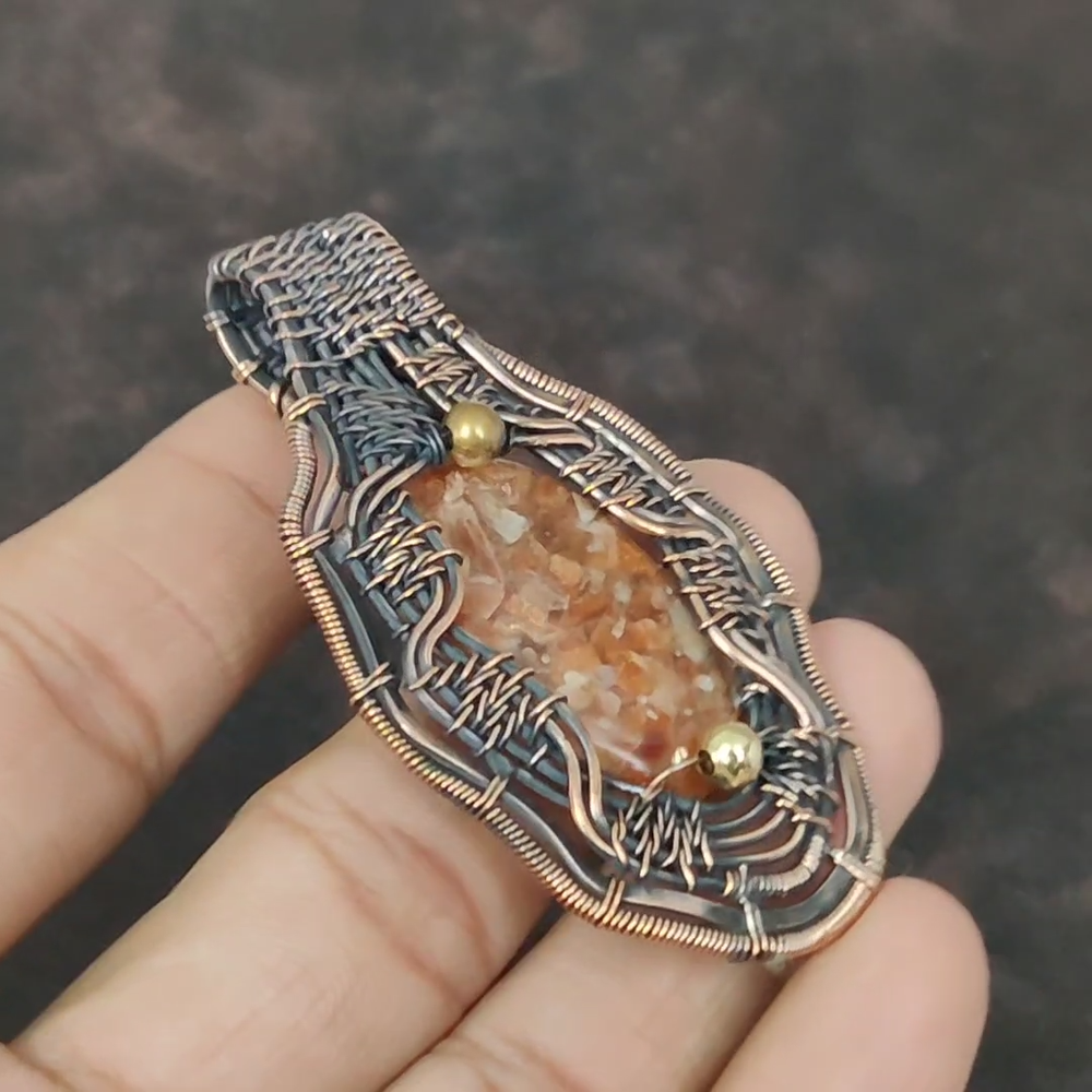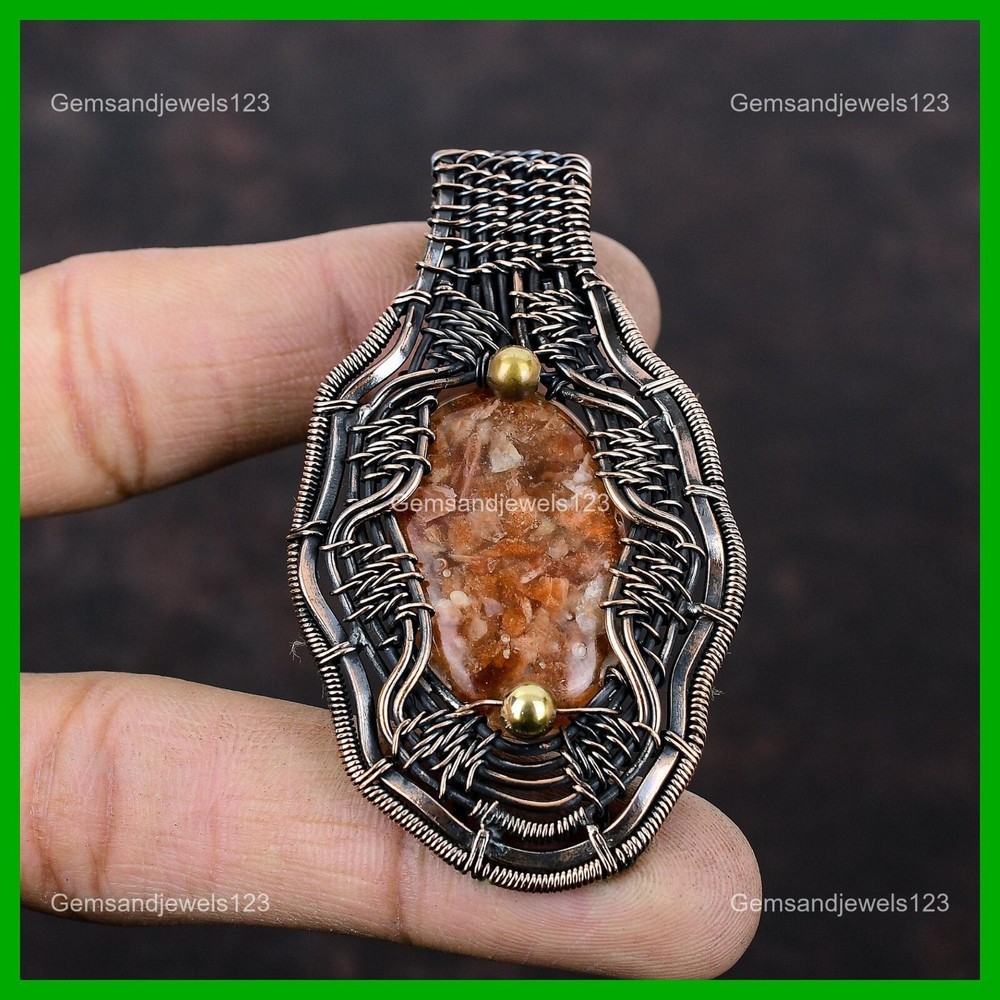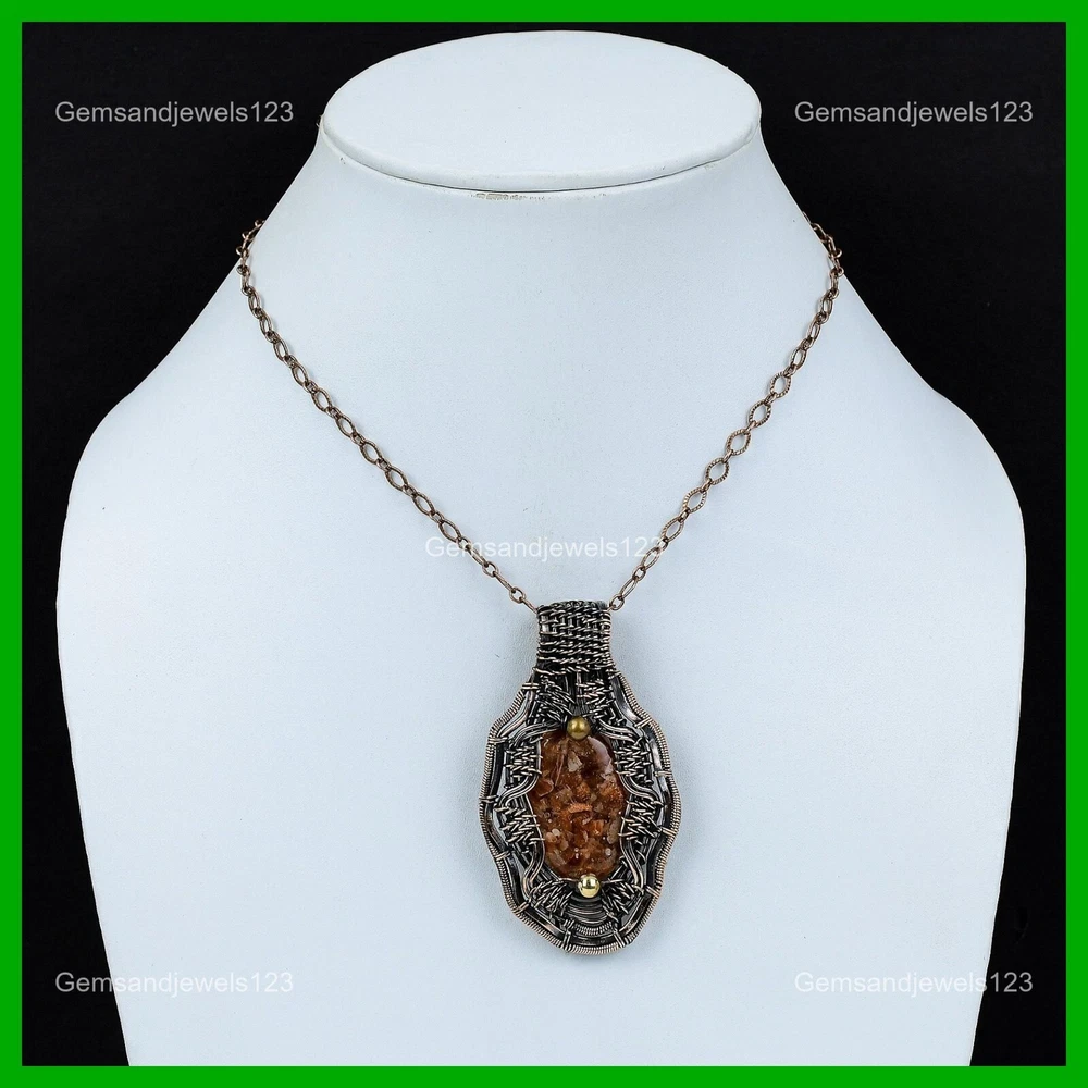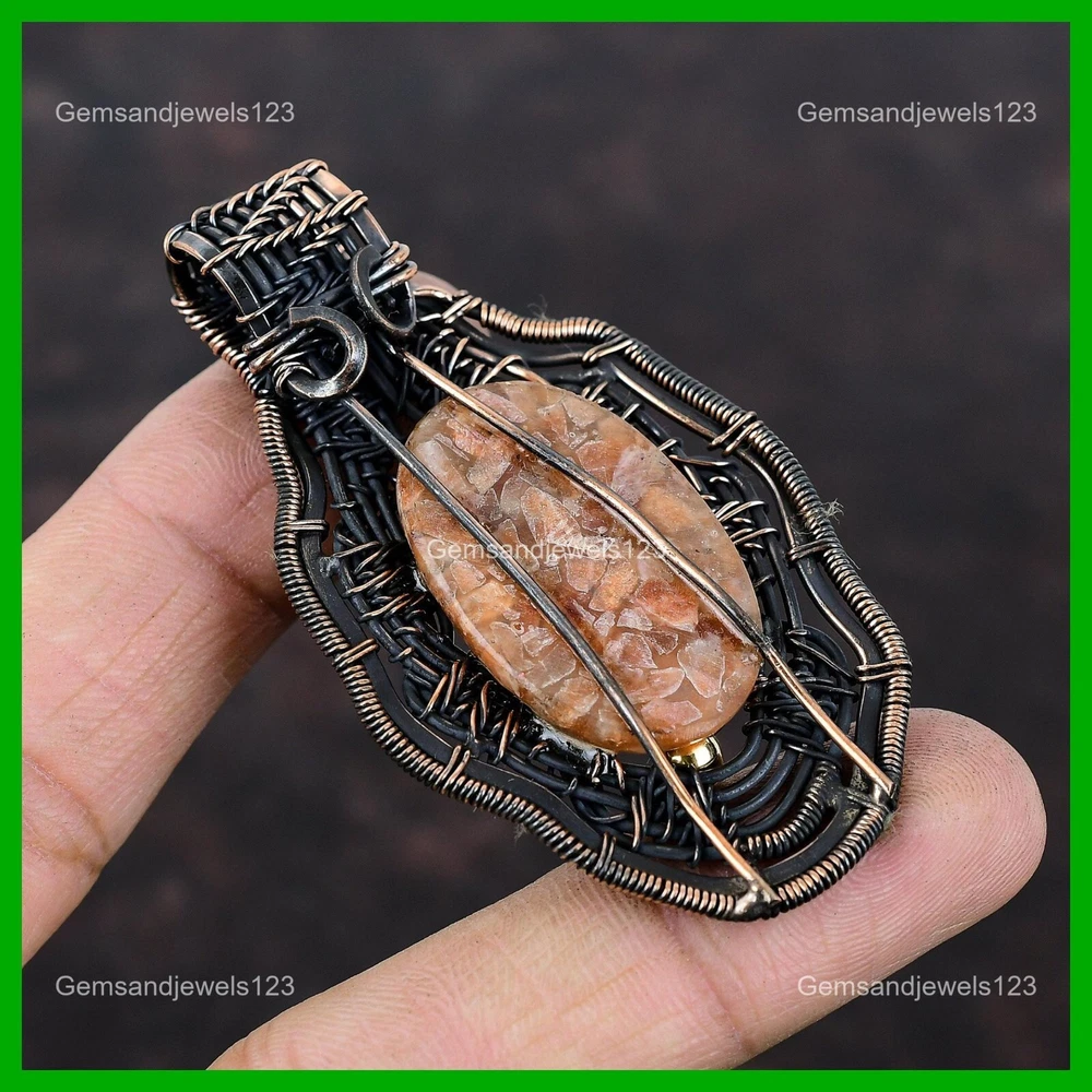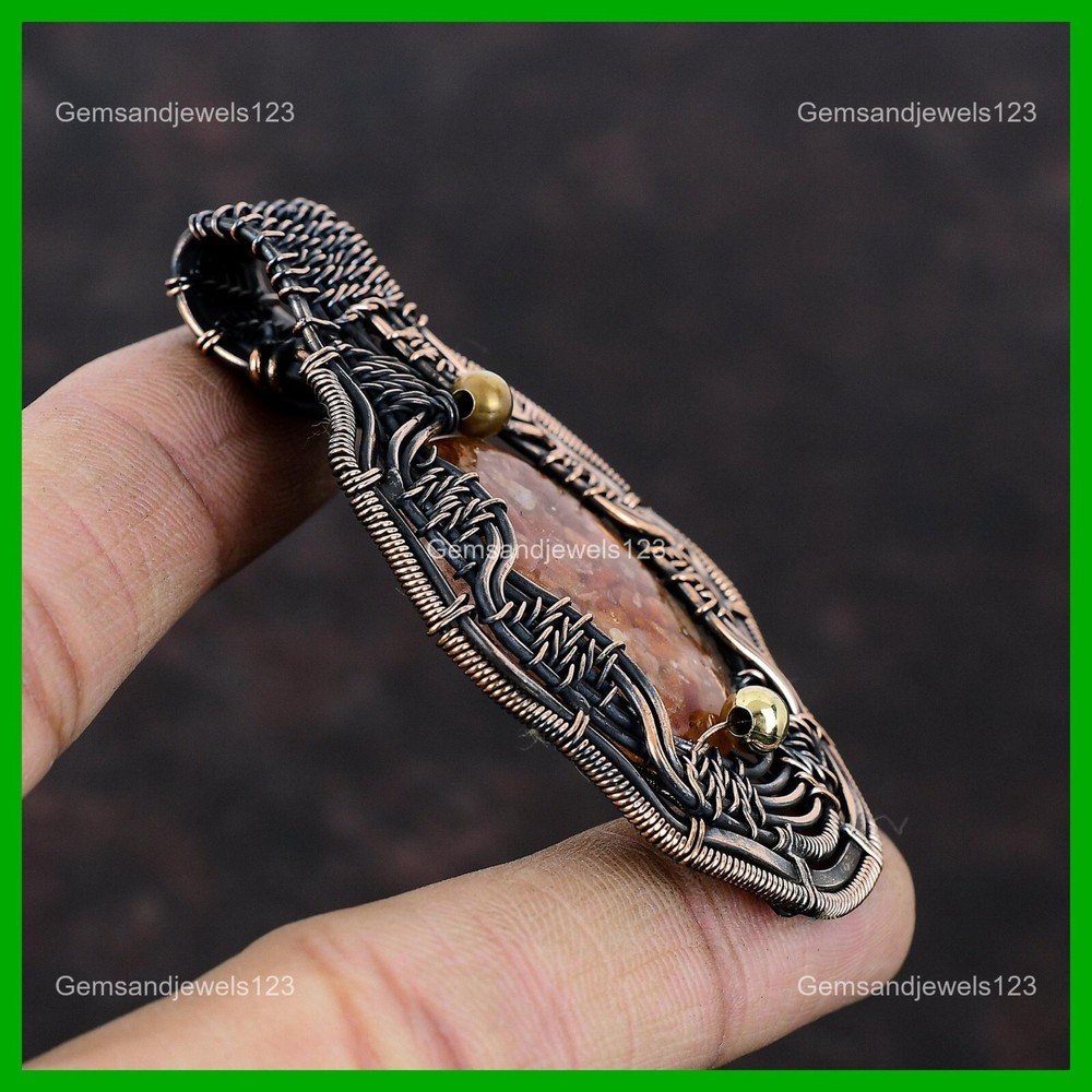 Note : Due to the natural formation of this gemstone. Slight Variation in design and color are to be expected. Welcome to gemsandjewels123 Mothers day Sale Copper Oval Sunstone Gemstone New Wire Wrapped Sister Pendant Handmade Pendant, Wire Wrapped Pendant, Wire Wrapped Jewelry, Copper Pendant, Copper Wire Pendant, Wrapped Jewelry, Wire Wrap Pendant, Wire Wrap Jewelry SKU : VFWP-2357 Gemstone : Sunstone Stone Shape : Oval Metal Purity : Unknown Copper Length : 71 Millimeters Width : 41 Millimeters Copper has been used for jewelry making for thousands of years, dating back to ancient civilizations such as the Egyptians, Romans, and Aztecs. Copper was valued for its beauty, versatility, and durability, and was often used to make everything from jewelry and coins to cookware and tools. In addition to its historical significance, copper jewelry also offers several benefits. Copper is a natural conductor of heat and electricity, which makes it ideal for energy healing and therapeutic purposes. Wearing copper jewelry is believed to have various health benefits, such as improving circulation, reducing inflammation, and boosting the immune system. Some people also believe that copper jewelry has the ability to balance energy and improve mood. For Mother's Day Gift For Father's Day Gift For Promise For Valentine's Day For Halloween Party For Christmas Day Gift For New Year Party For Mom For Her If you can't find the information you need or need some advice for your design? Feel free to contact us. We are fast to reply :) All our work is made by hand with Love and Care in our workshop Thank you so much for visiting and hope you enjoy shopping with us gemsandjewels123 is committed to delivering the best quality sterling silver jewelry to customers. As a handmade jewelry manufacturer, we offer an extensive selection of copper gemstone jewelry that showcases the brilliance of our craftsmanship. We are an experienced handmade jewelry supplier with expertise in embellishing gemstones to suit every style. We offer you the liberty to create your jewelry ensemble with sparkling, earthy, and pure gemstones. Our Talented artisans masterfully handcraft each piece of jewelry you see here. Our pieces are made with genuine gemstones. The one-of-a-kind piece you see here is the same exact piece you will receive.