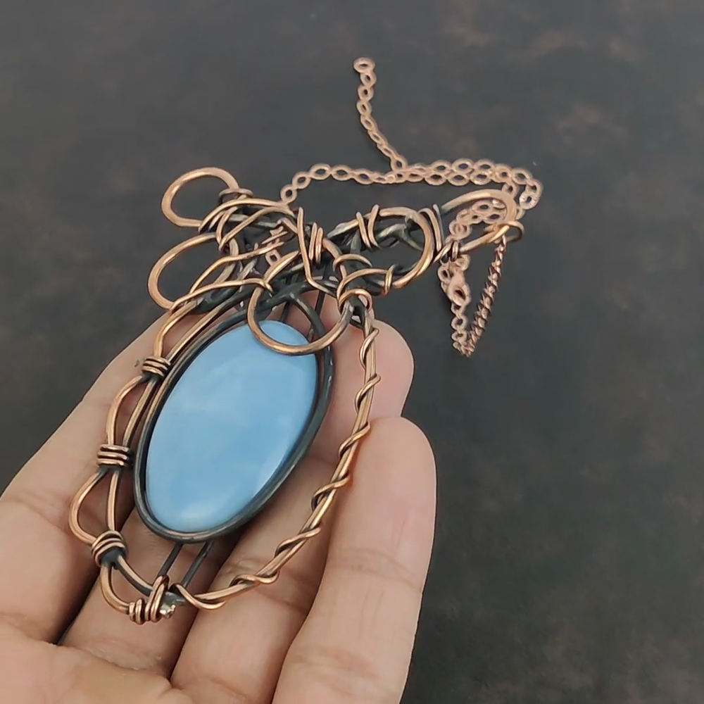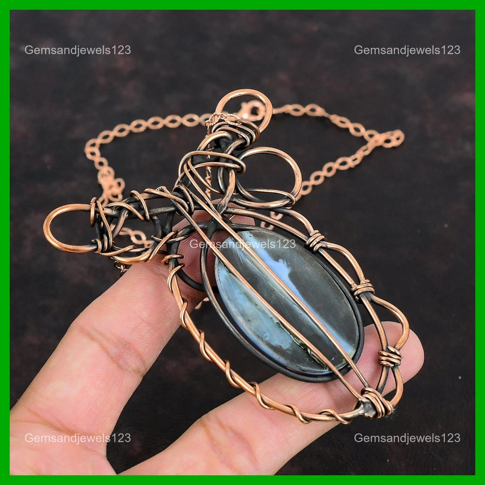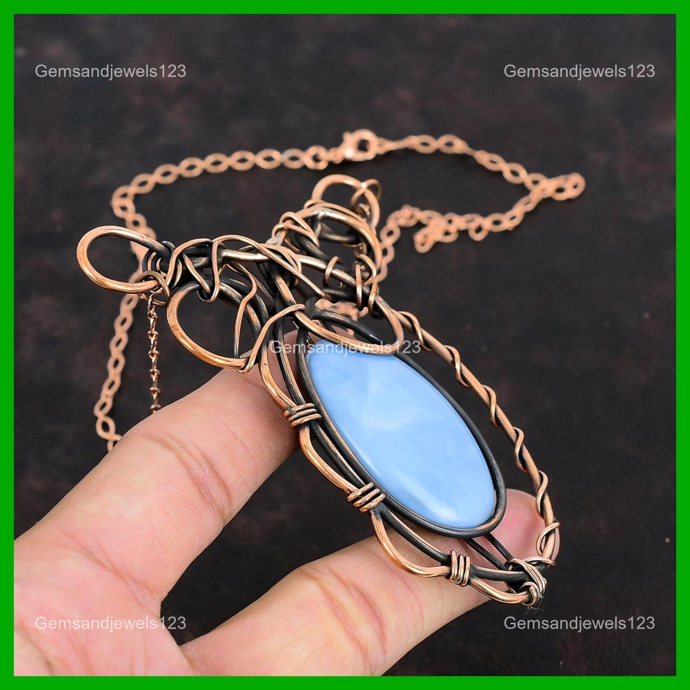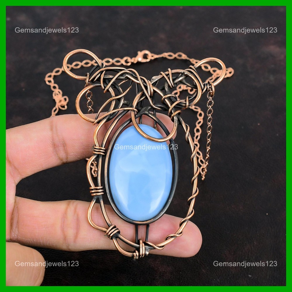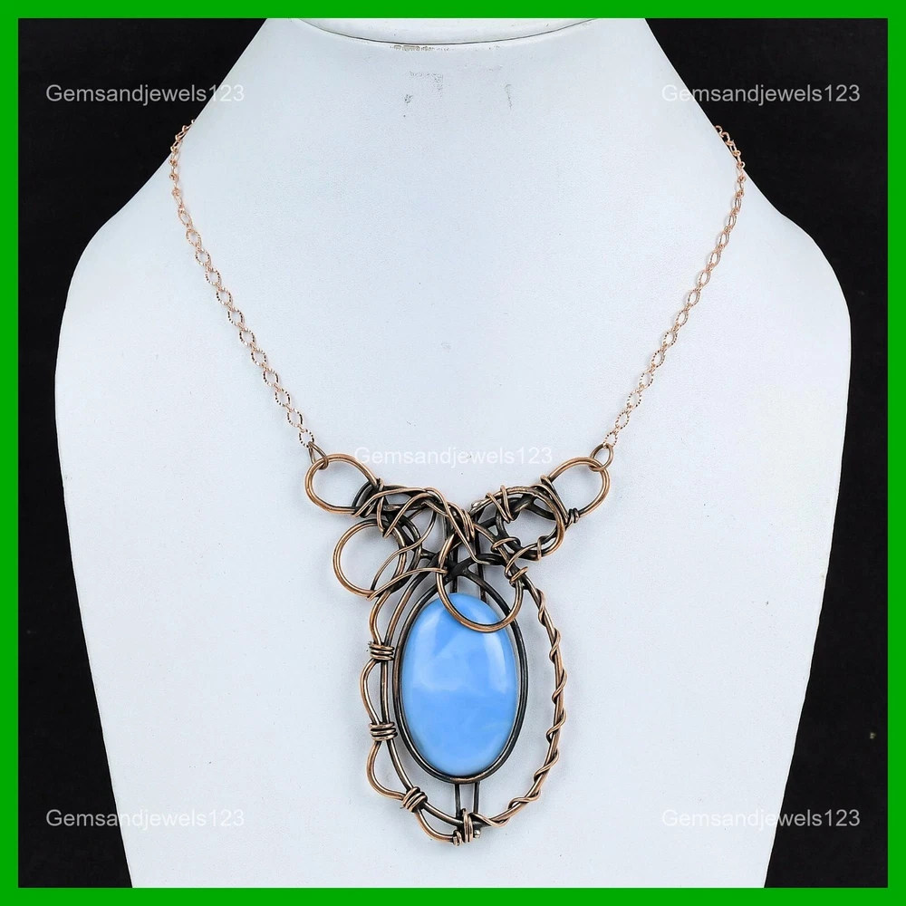 Note : Due to the natural formation of this gemstone. Slight Variation in design and color are to be expected. Welcome to gemsandjewels123 Mothers day Sale Copper Owyhee Blue Opal Stone Wire Wrapped Boho Chain Necklace Handmade Necklace, Wire Wrapped Necklace, Wire Wrapped Jewelry, Copper Pendant, Copper Wire Necklace, Wrapped Jewelry, Wire Wrap Necklace, Wire Wrap Jewelry SKU : VFWN-390 Gemstone : Owyhee Blue Opal Stone Shape : Oval Metal Purity : Unknown Copper Length : 18 Inches Width : Inches Copper has been used for jewelry making for thousands of years, dating back to ancient civilizations such as the Egyptians, Romans, and Aztecs. Copper was valued for its beauty, versatility, and durability, and was often used to make everything from jewelry and coins to cookware and tools. In addition to its historical significance, copper jewelry also offers several benefits. Copper is a natural conductor of heat and electricity, which makes it ideal for energy healing and therapeutic purposes. Wearing copper jewelry is believed to have various health benefits, such as improving circulation, reducing inflammation, and boosting the immune system. Some people also believe that copper jewelry has the ability to balance energy and improve mood. For Mother's Day Gift For Father's Day Gift For Promise For Valentine's Day For Halloween Party For Christmas Day Gift For New Year Party For Mom For Her If you can't find the information you need or need some advice for your design? Feel free to contact us. We are fast to reply :) All our work is made by hand with Love and Care in our workshop Thank you so much for visiting and hope you enjoy shopping with us gemsandjewels123 is committed to delivering the best quality sterling silver jewelry to customers. As a handmade jewelry manufacturer, we offer an extensive selection of copper gemstone jewelry that showcases the brilliance of our craftsmanship. We are an experienced handmade jewelry supplier with expertise in embellishing gemstones to suit every style. We offer you the liberty to create your jewelry ensemble with sparkling, earthy, and pure gemstones. Our Talented artisans masterfully handcraft each piece of jewelry you see here. Our pieces are made with genuine gemstones. The one-of-a-kind piece you see here is the same exact piece you will receive.