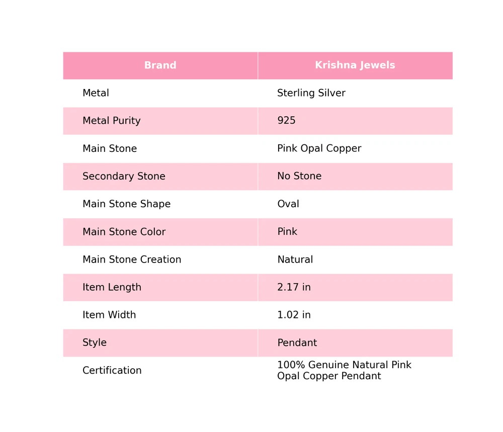 Note: Natural gemstones can vary slightly in design and color due to their unique formation. Welcome to KrishnaJewels123 Explore Our Handmade Sterling Silver Jewelry Collection Product Details: SKU: KKP-112 Gemstone: Pink Opal Copper Stone Shape: Oval Metal Purity: 925 Sterling Silver Length: 55 Millimeters Width: 26 Millimeters Sterling silver has long been cherished for its sophisticated charm and enduring quality. Valued for its elegance and versatility, sterling silver is a staple in jewelry design, offering a perfect balance of beauty and durability. Our sterling silver jewelry combines timeless appeal with modern craftsmanship. Known for its hypoallergenic qualities and resistance to tarnish, sterling silver enhances the natural brilliance of gemstones, creating a stunning, refined look. Ideal For: Mother’s Day Father’s Day Promises Valentine’s Day Halloween Celebrations Christmas Gifts New Year Festivities Gifts for Mom Gifts for Her Need more details or personalized advice? Don’t hesitate to reach out! We’re here to assist you promptly. Each piece at KrishnaJewels123 is handcrafted with care and passion. As experts in creating exquisite sterling silver jewelry, we take pride in our meticulous craftsmanship. Our collection features a diverse range of designs, each enhanced by genuine gemstones and created by our skilled artisans. Thank you for visiting KrishnaJewels123. We hope you find joy in exploring our collection and enjoy your shopping experience with us!