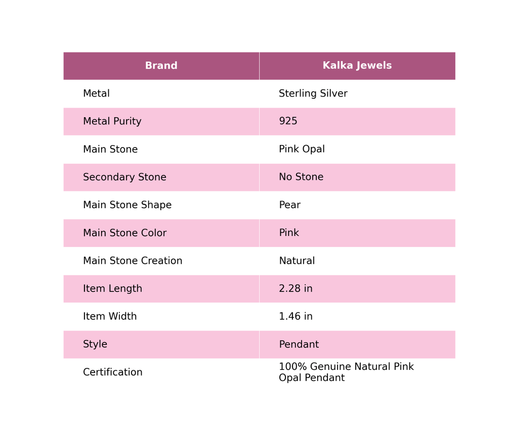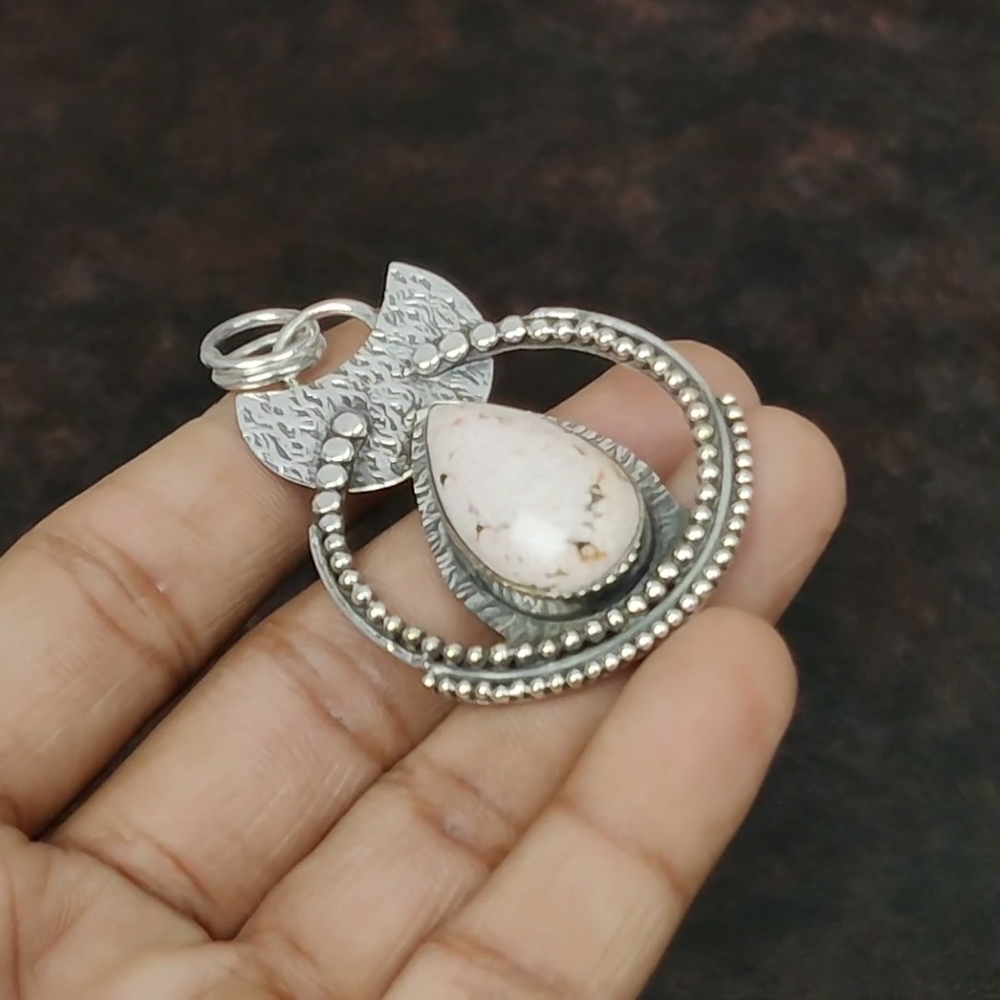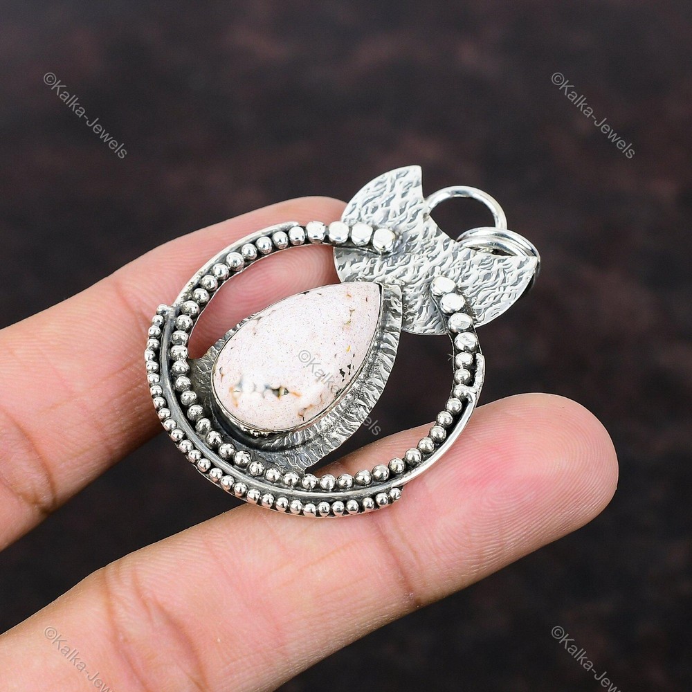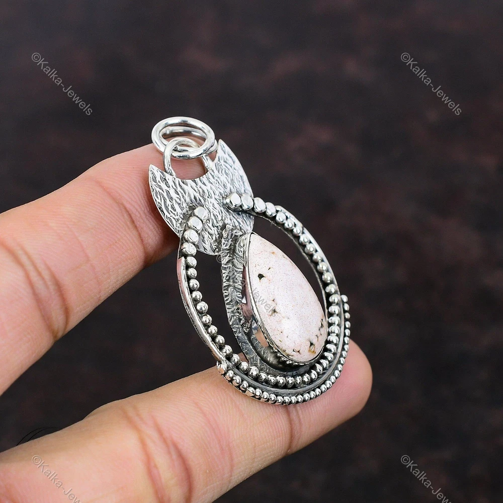 Note : Due to the natural formation of this gemstone. Slight variation in design and color are to be expected. Welcome to Kalka Jewels Mothers day Sale Sterling Silver Pear Pink Opal Gemstone Wedding Pendant Jewelry Handmade Pendant, Sterling Silver Pendant, Pink Opal Pendant, Handcrafted Pendant SKU : KP-849 Gemstone : Pink Opal Stone Shape : Pear Metal Purity : 925 Sterling Silver Length : 58 Millimeters Width : 37 Millimeters Silver Jewelry is a popular choice for many people due to its unique properties and numerous benefits. Here are some of the key properties and benefits of wearing silver jewelry: Properties: Durability: Silver is a durable metal that can withstand regular wear and tear. Malleability: Silver is highly malleable, which means it can be easily shaped and molded into various designs. Conductivity: Silver is an excellent conductor of heat and electricity. Anti-bacterial: Silver has natural anti-bacterial properties, which can help prevent the growth of harmful bacteria. Benefits: Aesthetic appeal: Silver jewelry is known for its beauty and versatility, and can be worn with a variety of outfits and styles. Hypoallergenic: Silver is generally hypoallergenic, which means it is unlikely to cause an allergic reaction in most people. Healing properties: Some people believe that wearing silver jewelry can help with various physical and emotional conditions, such as arthritis, anxiety, and depression. Spiritual significance: Silver has been used in various cultures for its spiritual and symbolic significance, and wearing silver jewelry can help to connect with these traditions. Investment value: Silver is a precious metal that retains its value over time, and investing in silver jewelry can be a smart financial decision. Overall, silver jewelry offers a unique combination of beauty, durability, and benefits, making it a popular choice for people around the world. For Mother's Day Gift For Father's Day Gift For Promise For Valentine' Day For Halloween Party For Christmas Day Gift For New Year Party For Mom For Her If you can't find the information you need or need some advice for your design? Feel free to contact us. We are fast to reply :) All our work is made by hand with Love and Care in our workshop Thank you so much for visiting and hope you enjoy shopping with us Kalka Jewels is dedicated to providing customers with high-quality sterling silver jewelry. As a manufacturer of handmade jewelry, we offer an extensive range of silver gemstone jewelry that demonstrates our exceptional craftsmanship. We are skilled in adorning gemstones to complement any style, and we give you the freedom to design your own jewelry collection with dazzling, natural, and genuine gemstones. Our talented craftsmen carefully handcraft each jewelry piece, ensuring that it is unique and made with authentic gemstones.