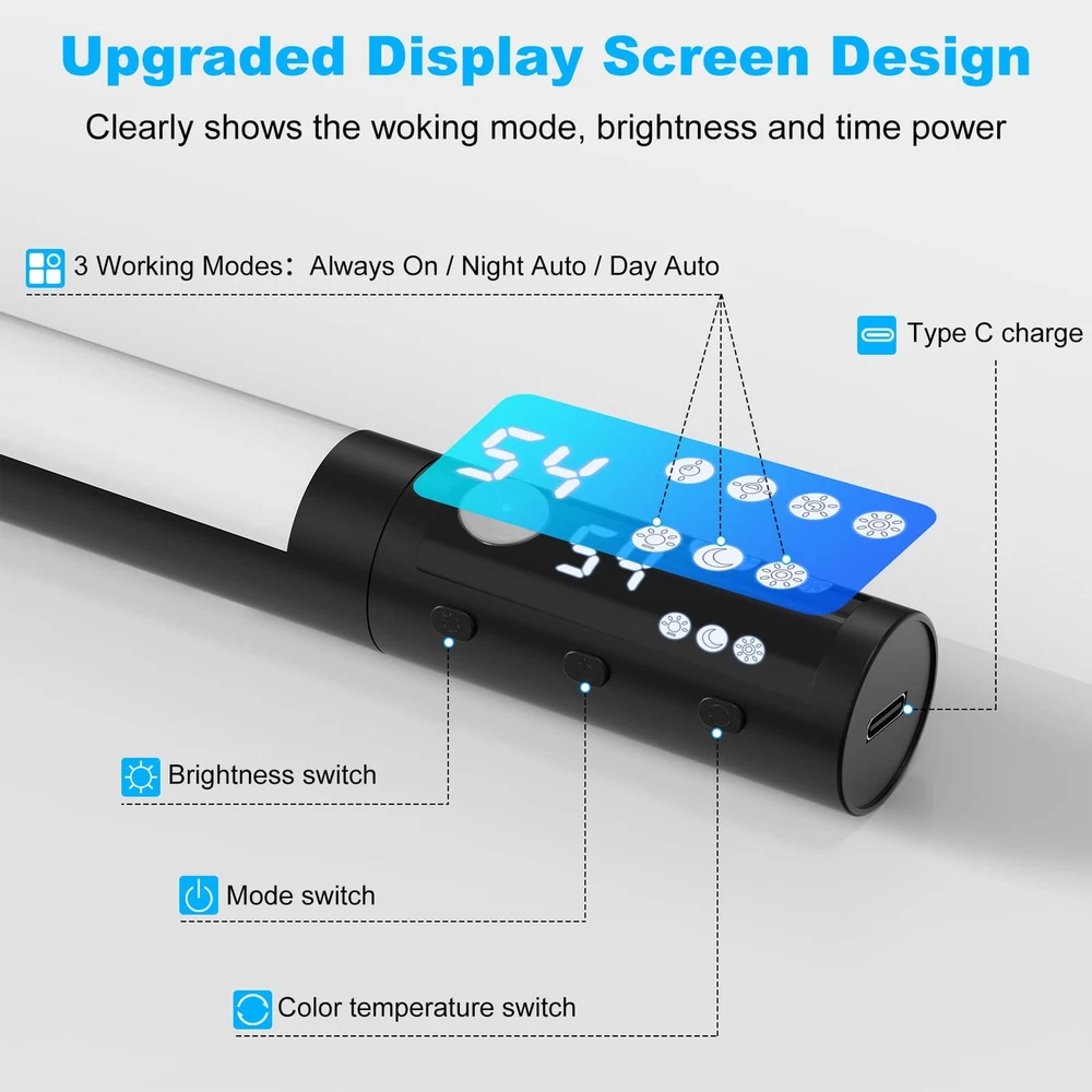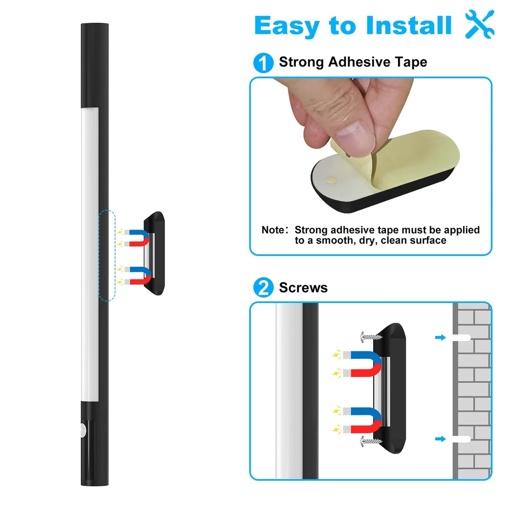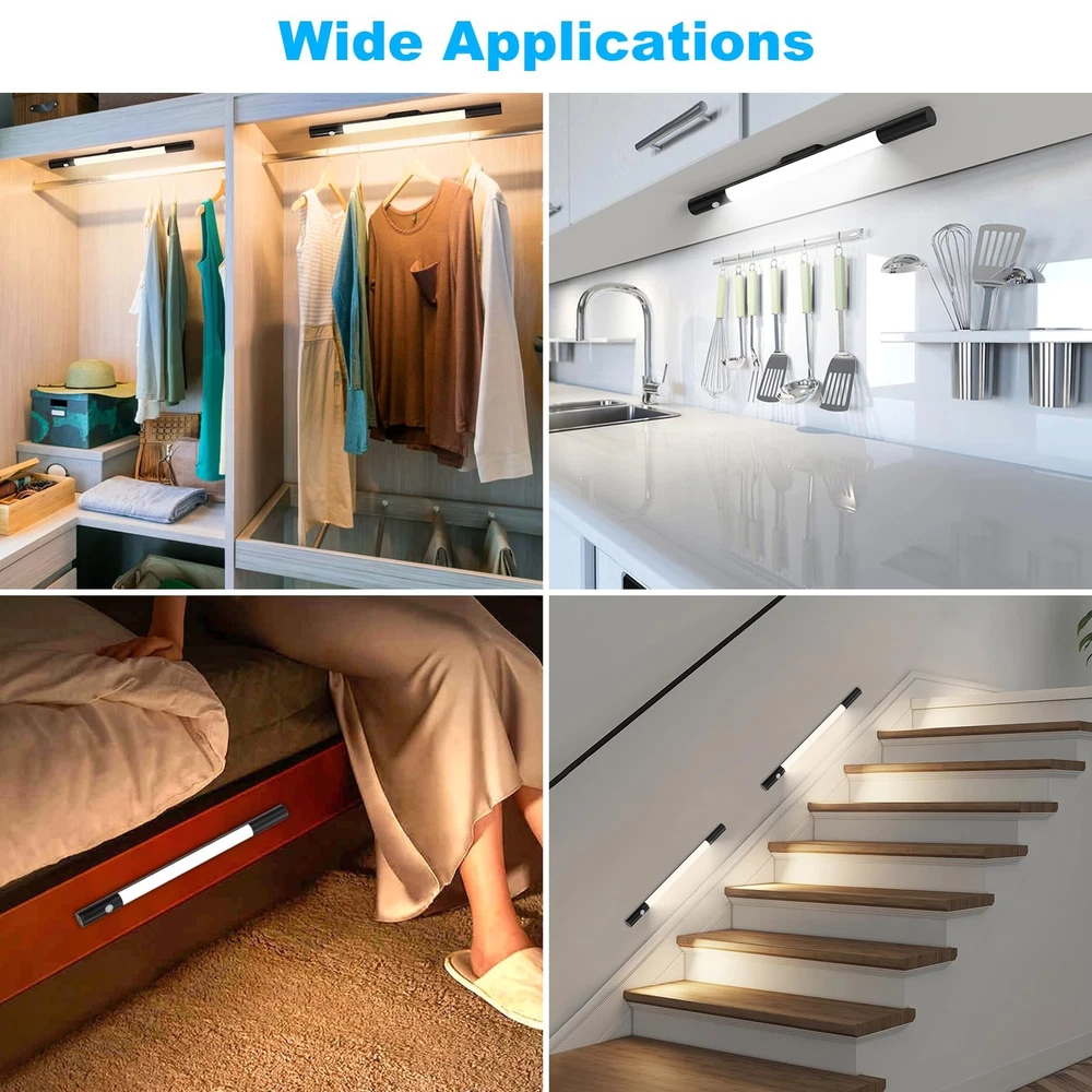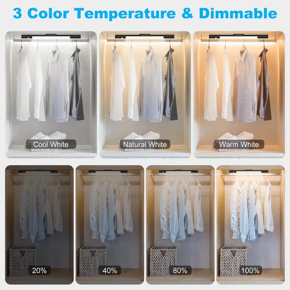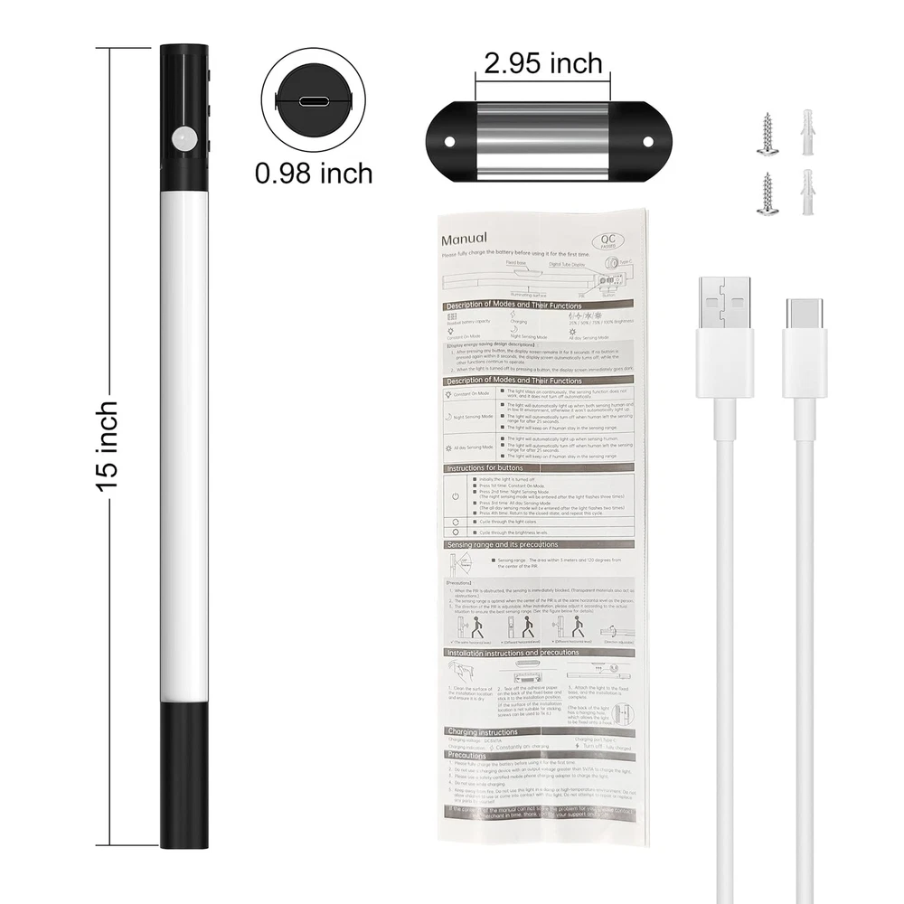 【Digital Display Closet Light】With the newest digital display design, the 2024 upgraded closet light can clearly show 3 operating modes, 4 brightness levels and real-time power level. Compared with the traditional led closet light without display, it is not only easier to recognize the working mode, but also easier to set/change the different working modes/brightness you want. 【Motion Sensor Light with Three Modes】Our motion sensor light offers three working modes: all day sensor, night sensor and constant light mode, providing a variety of functions to meet various needs. Simply press the power button to switch between modes easily. Equipped with wireless passive infrared (PIR) technology, this cabinet light is perfect for closets, cabinets, bedrooms, stairs, hallways, kitchens, vehicles, campgrounds, and workshops. It also has a unique memory function that retains your settings for future use! 【3 Color Temperatures and Adjustable】The sensor light offers 3 different color temperatures (Cool White / Natural White / Warm White) and 4 adjustable brightness, easily press the switch to choose the right amount of light/color to meet your different needs. In addition, the sensing angle of this upgraded sensor light is adjustable, just turn the end with the sensor head to realize. 【2000mAh Battery Powered Sensor Light】Built-in real 2000mAh rechargeable battery, when fully charged, this sensor light indoor can provide up to 24 hours of continuous runtime (from lowest brightness to battery depletion) and up to 5 hours of runtime (from highest brightness to battery depletion). Easily recharged with the included USB charging cable, no need to replace batteries. 【Easy to Install LED Cabinet Light】The cabinet under light features a powerful built-in magnet and included metal bracket for simple installation. You can choose to secure it to the wall with screws or use the included strong adhesive brackets to mount it securely to any flat, clean surface. Enjoy a hassle-free installation and experience the full convenience of LED cabinet lights.