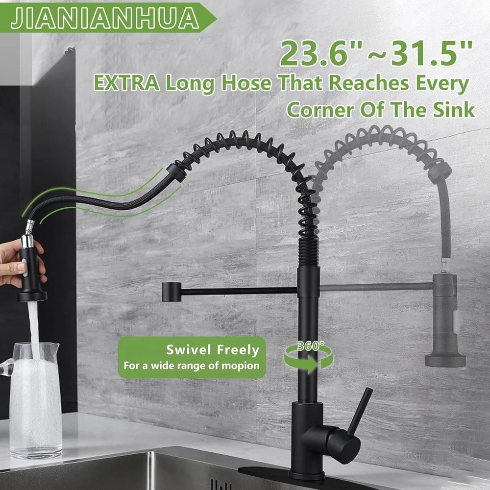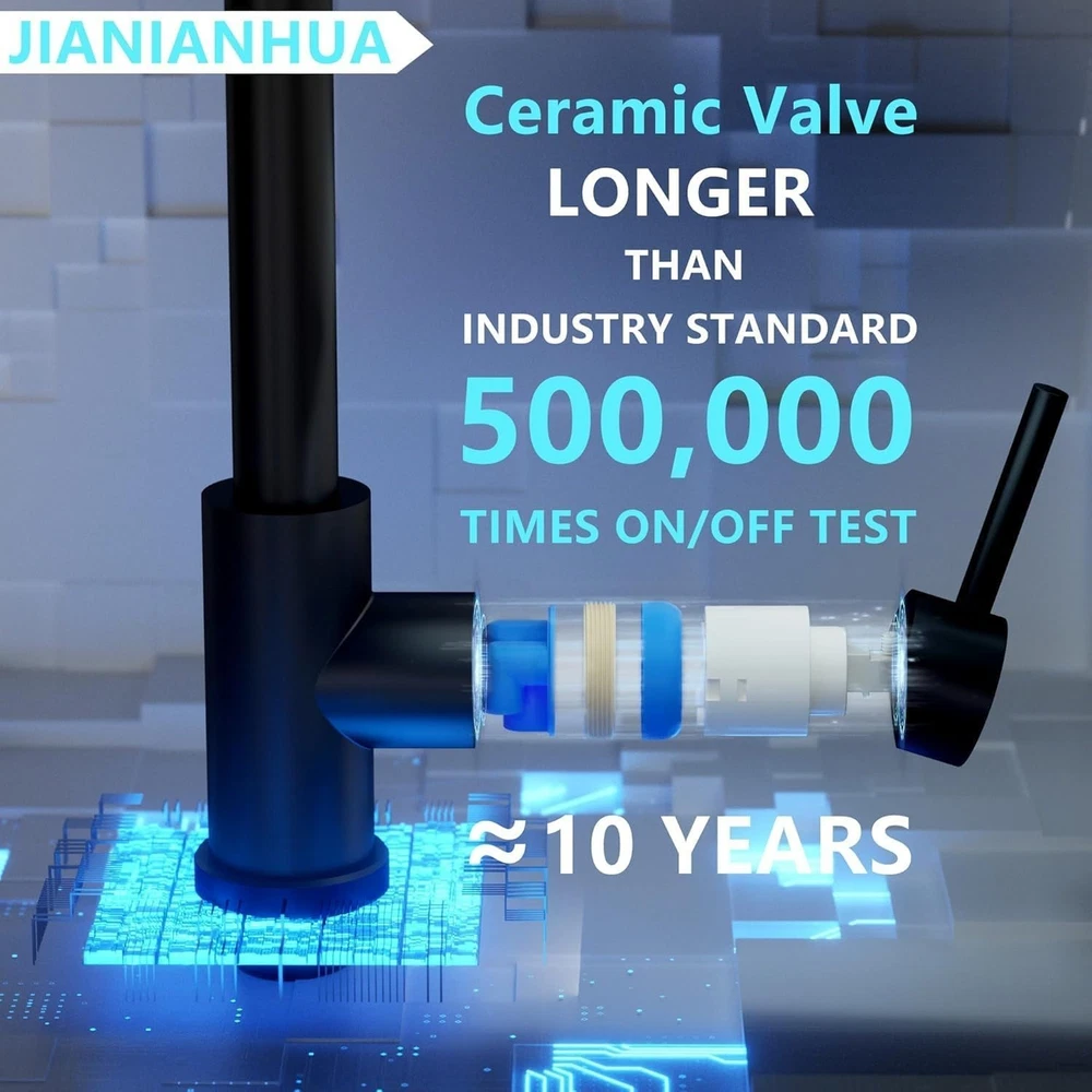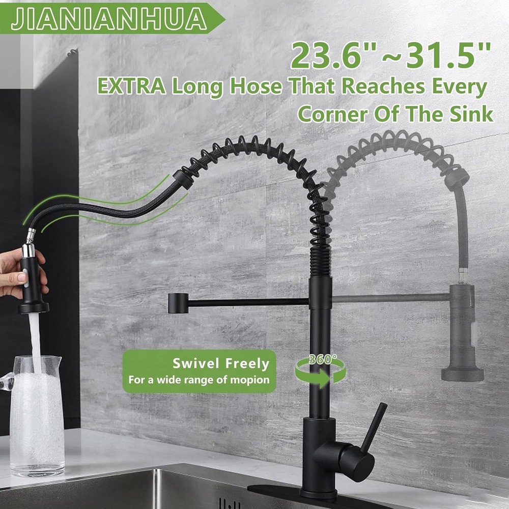 Free eBay listing template designed by dewiso.com Touchless Kitchen Faucet Motion Sensor Smart Kitchen Sink Faucet WIRELESS SENSING TECHNOLOGY---You can turn the faucet on and off without touching it. This touchless kitchen faucet comes with a three-color ambient light ring and digital display. When the water temperature is below 35°, it displays blue; when the water temperature is 35°-45 °, it displays purple; when the water temperature exceeds 45 °, it displays red. With a wave of the hand, the water can be turned on and off in 0.2 seconds. Turns off automatically after 3 minutes when not in use. MULTIFUNCTIONAL SPRAYER---Our black faucet features a 360° pull-down sprayer and an extended 31.5-inch pull-out hose allowing you to easily reach every corner of your sink. Two water output modes: stream for filling water, spray for rinsing. Giving you unique flexibility and convenience in kitchen operations, making daily kitchen chores easier and tailored to your needs SAFE & RELIABLE QUALITY---The touchless kitchen faucet is made of high-quality food-grade SUS304 stainless steel. The ceramic valve core has been tested for 500,000 switching cycles and can be used for up to 10 years without any worries about leakage. Corrosion-resistant, wear-resistant, not easily damaged or oxidized, and has a long service life EASY TO INSTALL---Our modern commercial style sink faucet is suitable for single or three hole sinks. There are installation accessories and instructions in the package to help you install quickly. No plumber required, 30-minute DIY installation, simple and fast, helping you save money (Note: 4 AA batteries need to be purchased by yourself. Please contact us to send installation video) JIANIANHU AFTER-SALES SERVICE---All products enjoy a 2-year after-sales service, and a strong customer service team is online 7*24 hours. Your satisfaction is our top priority. If you have any questions or concerns about our products, please contact us and professional product consultants will perfectly solve your problems in the shortest time