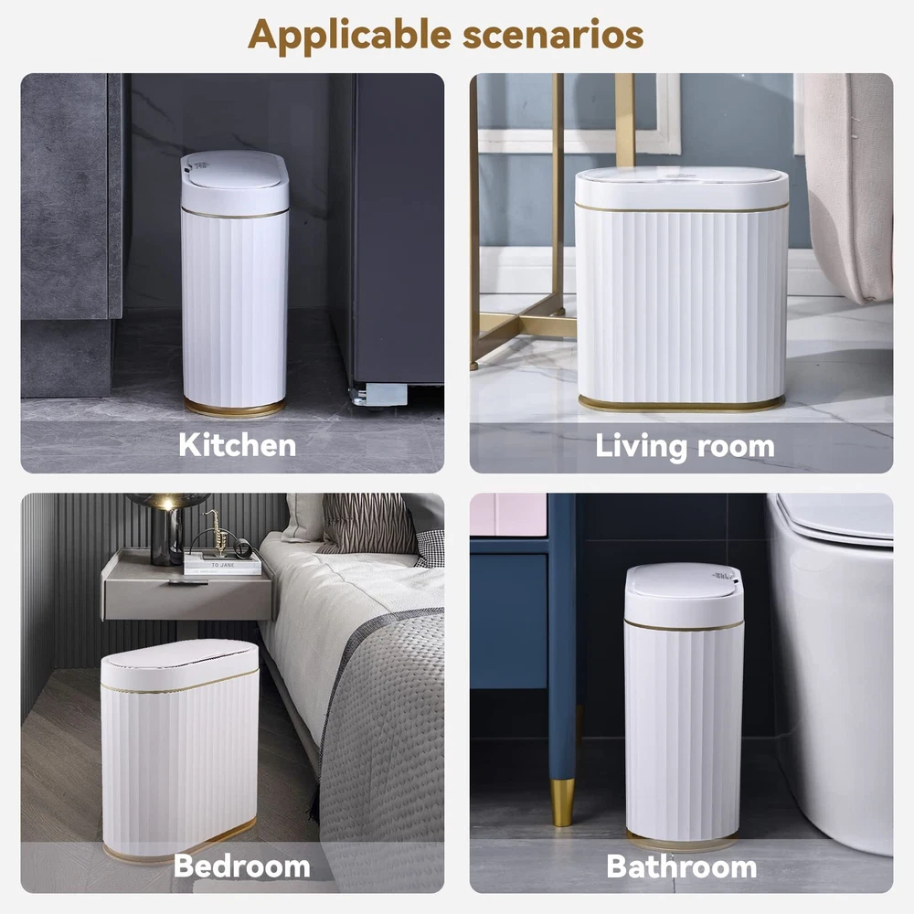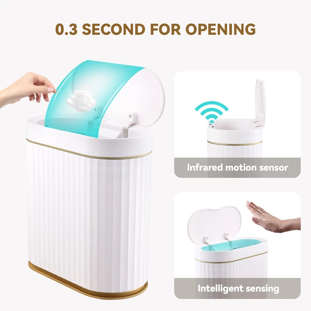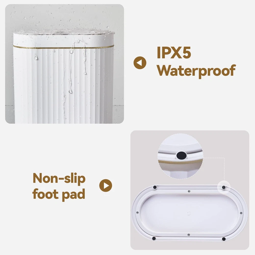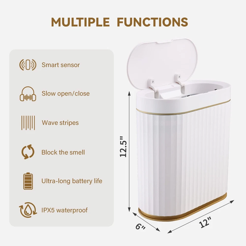 NOTICE FOR CUSTOMERS - This product is a motion sensor trash can. Customers need to install 2 AA batteries as well as follow the steps to put on the garbage bag to ensure the bin works properly. Then you need to press the button on the lid for more than three seconds to start it. The same operation is needed to run the trash can after replacing the battery WATER-RESISTANT - Advanced IPX5 waterproof technology prevents water or humid environment from damaging the unit. Leaving none water stain on surface after rinse SLIM DESIGN - 12''L×6''W×12.5''H, 2.5 Gallons, ABS materials. Ideal for bathroom and kitchen use SMART SENSOR - Our fully-developed sensing technology reduces unnecessary openings and extends battery life. The lid stays open if your hands stay around the infrared motion sensor, which provides a comfortable user experience. Lid closes after 5 seconds automatically if none movement is detected by sensor. In cases that You want the lid to stay open, just gently touching the weight sensing button on the right, touch the button again to close. Product powered by 2 AA batteries ANTI-SLIP DESIGN - Equipped with novel wave stripes that bring visual aesthetics and provide slip resistance SPACE-SAVING - This trash can is perfectly designed for limited space. With its modern oval-shaped design, the product looks great in bathroom, kitchen and other rooms while take up less space CUSTOM FIT GARBAGE BAGS - Our code A trash bags are designed to fit perfectly in this trash can so they don't slip and are completely hidden. The extra thick plastic and double stitched construction prevents tears and breakage