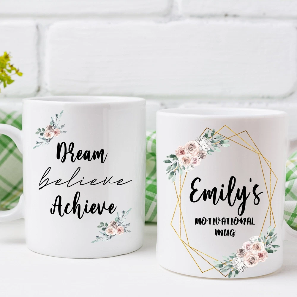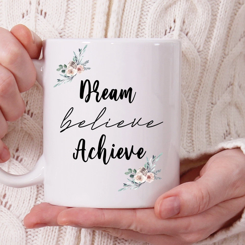 Motivational Personalised Mug Dream Believe Achieve Quote Product Details.. This high quality 11oz. ceramic white mug has a premium hard coat that provides crisp and vibrant color reproduction sure to last for years. Perfect for all hot & cold beverages. The highest quality printing possible is used. It will never fade no matter how many times you wash it. Material: 100% Ceramic. Print both sides. Dishwasher and Microwave Safe. High Gloss + Premium White Finish. Printed in the U.S.A. Personalized & Custom. We support personalized and custom mug to add custom, when placing an order, you can add notes to the "order note" in shipping address section. Also you can contact us directly via message. Shipping Info. Ready to ship in 1 to 2 business days, All products are made-to-order and proudly printed in the United States. Shipped by USPS and DHL, You will receive your order in 5-7 days. Replace & Refund. All products are defective during shipping broken, chipped will be replaced free of charge. You are not satisfied with the product, we will refund 100% money to you. If any other issues arise, please do not hesitate to message, we would be more than happy to assist you.