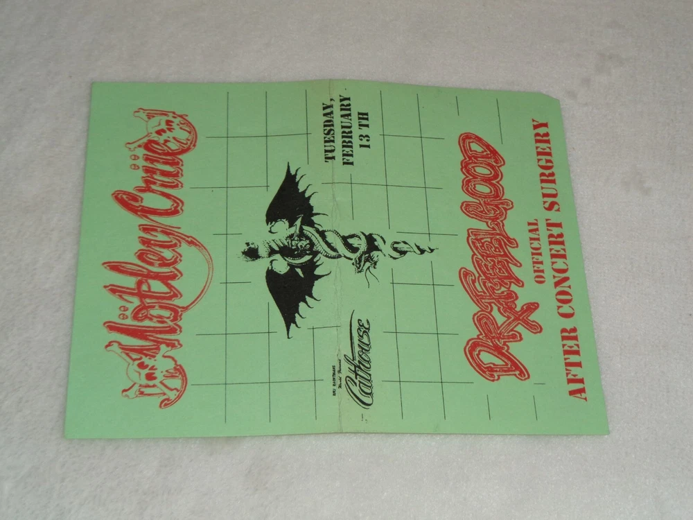 Motley Crue 1990 Riki Rachtman's Cathouse Dr. Feelgood 2/13/90 Rare Event Original Flyer Measures approximately 4 1/4" x 5 1/2". Item has been folded. There is discoloration, creasing and marks from handling and storage. Please see photos for more information on condition and ask any questions you may have.