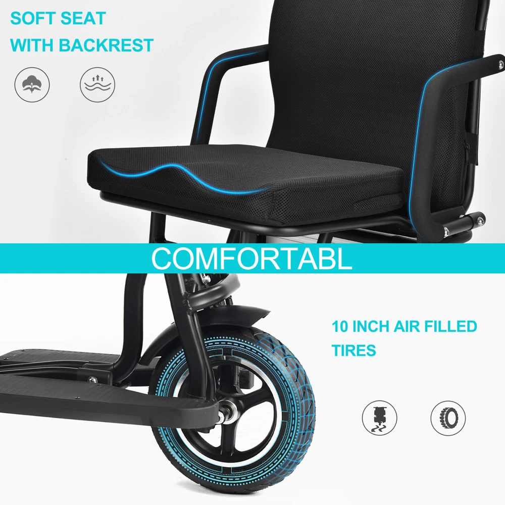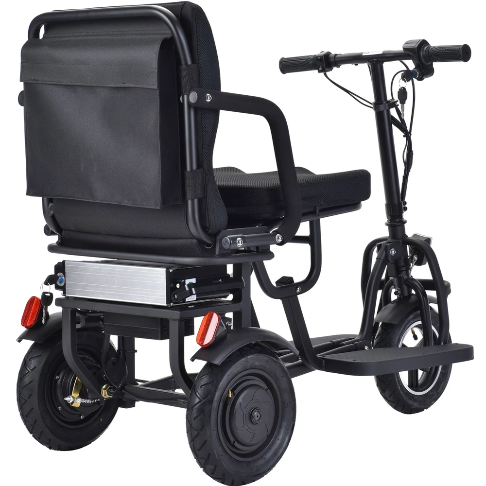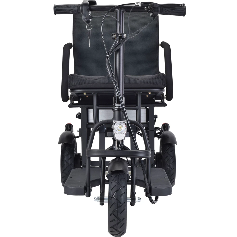 Introducing the new Folding Mobility Scooter by MotoTec. Its compact, three wheel styling makes for a sharp turning radius, 2 hub motors built into the rear wheels provide amazing torque for riding up inclines with its light weight durable frame made from Aluminum. The lithium battery is light weight and lasts longer than your standard competing lead acid models. Comes standard with headlight, rear lights, key start, 3 forward speeds(with additional slow 1.5mph store speed), reverse, dual rear drum brakes, comfortable seat with backrest, front & rear baskets and large 10 inch air filled tires to provide a comfortable ride. IP Water Rating: Wires: IP67 Battery: IPX7 Motor: IP66 Throttle: IPX5 Brake Lever: IPX6 Switch: IPX4 Controller: IPX5 Front & Rear Lights: IPX4 Specs: Motor: Two 350w Hub Motors (700w Total) Brushless Battery: 48v 10ah Lithium Ion Charger Included: Yes Charge time: 4-8 hrs 3 Selectable Forward Speeds: 5, 10, 17 mph Matching Reverse Speeds: 2, 3, 6 mph Slow Store Speed Mode: (Fwd:1.5mph, Rev:1mph) Max rider weight: 286 lbs Baskets: Front & Rear Range Per Charge: 10-20 miles (weight/terrain/speed dependant) Handlebar: Adjustable Up & Down Foldable Scooter: Yes Lights: Front & Rear Bottom Seat Cushion Size: 16 wide, 14 long Top Seat Cushion Size: 16 wide, 17.5 tall Top of Seat Height from Ground: 21 inches Brakes: Dual Drum (with parking brake) Tires: 10 inch Pneumatic Scooter Size: 42x22x33 inches Folded Size: 17x22x33 inches Scooter Weight: 62 lbs (54lbs without battery) Box Size: 33x22x17 inches Box Weight: 75 lbs Warranty: 30 days parts replacement