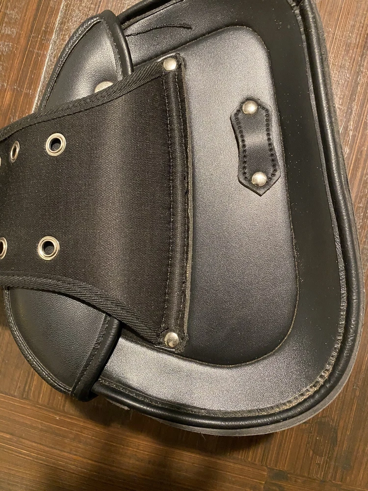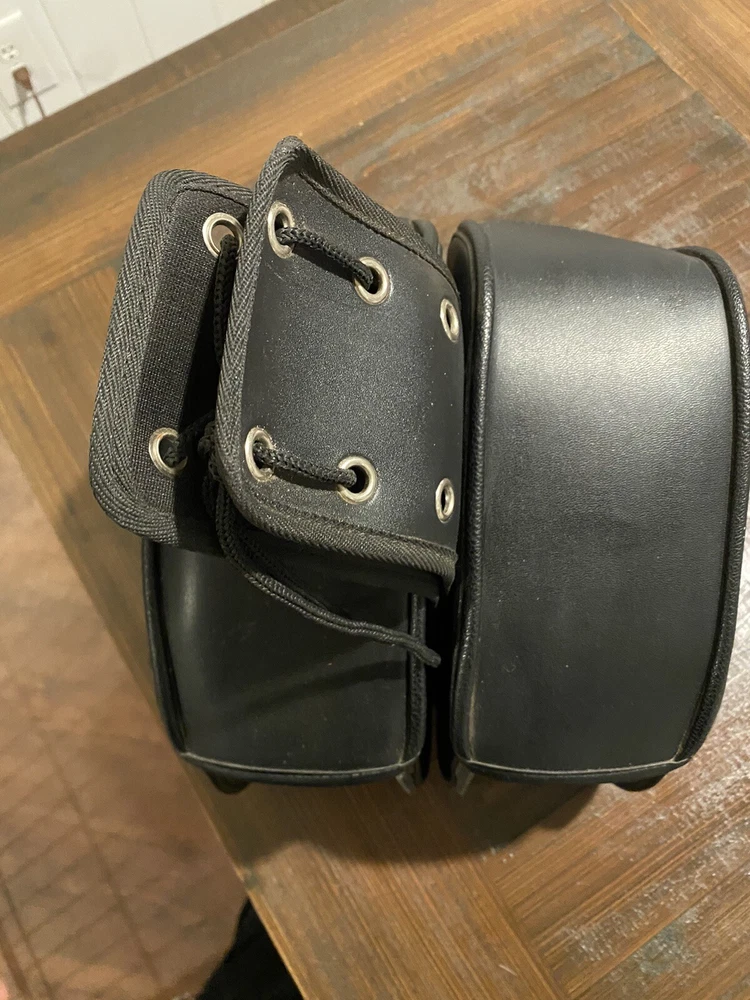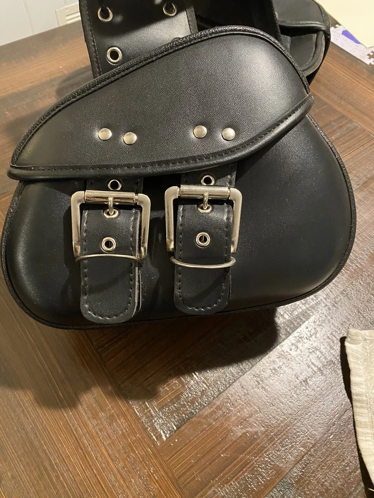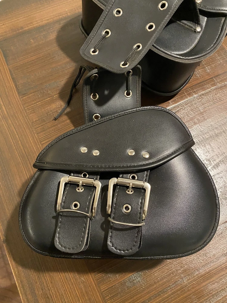 Add some extra storage to your motorcycle with these stylish and functional saddlebags. Designed for Harley, Honda, Yamaha, and Suzuki, these bags are made from high-quality leather and are water-resistant for protection against the elements. The expandable feature allows you to carry more items when needed, and the approximate size of 280mm x 215mm x 115mm makes them the perfect fit for your rear placement on your vehicle. These black saddlebags have been opened out of original plastic packaging but never used.