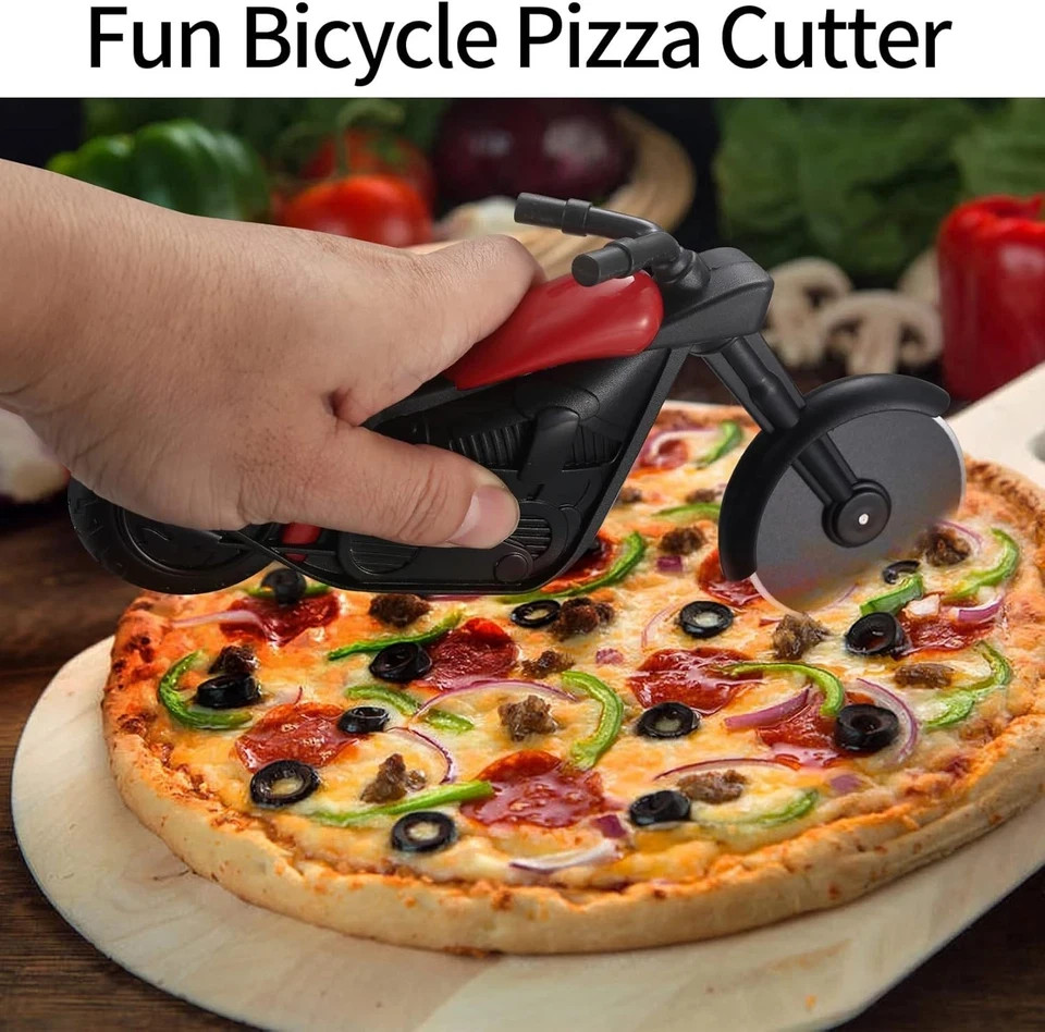 Motorcycle pizza cutter, stainless steel pizza cutter two wheels, novelty motorcycle-shaped pizza wheel cutting slicer with non-stick coating, suitable for kitchen gadgets accessories (motorcycle) About this item High-quality materials: made of ABS and stainless steel materials, environmentally friendly and tasteless, not easy to break, corrosion-resistant, rust-resistant, not easy to fade, stable, reliable, durable, and can be used for a long time. Easy to use: the stainless steel cutting wheel of the motorcycle pizza cutter with non-stick coating provides a smooth cutting experience. Help you get your pizza slices in seconds, fast and very convenient and efficient. Practical design: designed with a non-stick surface for easy cleaning. Simply wash with warm water and soap. Small design is convenient for display and storage, and can be used as home decoration when not in use. Creative design: The creative motorcycle design looks vivid and exquisite, and the double-wheel cutting is quick and easy, also a novel and fashionable decoration. The cool design makes cutting pizza more interesting. Widely used: suitable for cutting pizza, cake, pastry, toast, bread, pancake, pie, roll, waffle, sandwich, etc. Ideal gift for pizza lovers, motorcycle lovers or anyone who likes novelty gadgets.